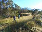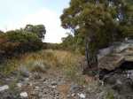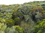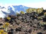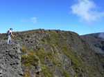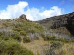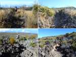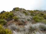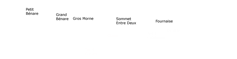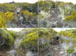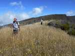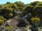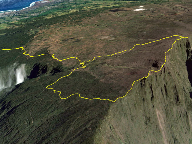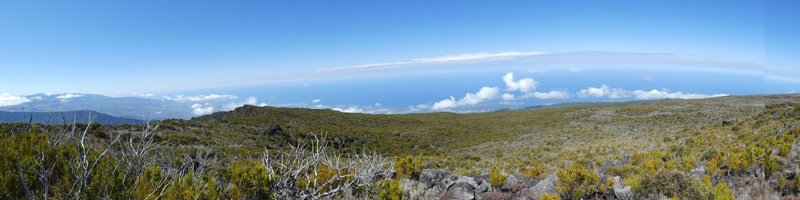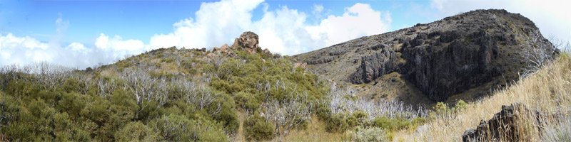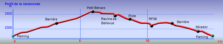 La randonnée débute par le sentier Mario (Photo 1) qui coupe quelquefois les lacets de la route forestière du Haut Tévelave avant de rejoindre le mirador de surveillance, proche du sentier des Tamarins. Le cheminement en pente moyenne s'effectue de manière très agréable sur l'herbe, la terre ou un long nid de feuilles de tamarins, à l'ombre de ces grands arbres (Photo 2). A partir du mirador, le trajet se poursuit sur la piste caillouteuse et recouverte d'herbes jaunes (Photo 3). Très vite on trouve de nombreux raccourcis qui évitent de longer les lacets de la route. Ce sentier, étroit, impossible à perdre, est principalement entouré d'herbe, de branles verts ou de fougères (Photo 4). Après avoir traversé la route 4 ou 5 fois, on parvient à une barrière ouverte avant la profonde vallée de la Ravine de Bellevue. Sur la gauche, débute le sentier du Petit Bénare qui domine la rive droite de la ravine. De là, on peut à loisir regarder vers l'horizon et voir la totalité du parcours hors sentier qu'on effectuera à partir du Petit Bénare (Photo 5). La ravine, plus haut, montre un canyon plus impressionnant de loin qu'à franchir une fois sur place. La montée, maintes fois décrite, n'est jamais forte mais toujours caillouteuse (Photo 6). On n'en finit pas d'enjamber ou d'éviter les innombrables cailloux de toutes tailles et il faut près d'une heure pour enfin parvenir au premier point de vue sur le Cirque de Cilaos. Le véritable Petit Bénare est à moins de 400 m sur la gauche et un détour pour l'atteindre ne comporte aucune plus-value. Un coup d’œil sur la droite permet d'apprécier la pente presque nulle qui va s'effectuer en total hors sentier (Photo 7). La marche peut commencer. Le terrain est tel qu'il est facile de marcher à peu près partout. Le parcours ci-dessous a été réalisé en tentant de rester constamment au plus près du rempart vertigineux qui domine le cirque. Les paysages, au fur et à mesure de la progression, s'observent sous des angles inhabituels (Photo 8). Les rares petits détours d'une vingtaine de mètres permettent d'éviter des roches plus hautes que les autres qui ralentiraient le passage (Photo 11). Ailleurs, c'est souvent le désert et il n'est même pas besoin de chercher où poser le pied (Photo 9). Ne pas hésiter à s'arrêter le plus souvent possible pour admirer le cirque et ses îlets (Photo 12). On domine l'Îlet à Cordes et quelques îlets autour du Bras de Saint-Paul. Des portions sont totalement recouvertes de hautes herbes fleuries pour une balade reposante (Photo 13). La végétation qui a totalement brûlé en 2010 et 2011 reprend ses droits. Quelques zones épargnées peuvent procurer de l'ombre pour les moments de repos (Photo 15). Les bois de rempart (Photo 14) et barbes de Jupiter (Photo 16) sont omniprésents. On parvient à la source de la Ravine Bellevue entourée de hautes collines rocheuses qui peuvent impressionner (Photo 18). Pas d'inquiétude pour le franchissement car le meilleur passage est également le long du rempart, peu dangereux à cet endroit. Les 60 m de descente s’effectuent sur un terrain rocailleux où il est parfois nécessaire de s'asseoir sur des rochers afin de descendre prudemment. On retrouve quelques traces de passage prouvant que des marcheurs viennent admirer ces paysages. Des zones plus rocheuses que d'autres se contournent également par de courts écarts qui ne ralentissent pas (Photo 21). On marche ainsi, toujours aussi facilement jusqu'à la fin des zones incendiées (Photo 22). Arrive ensuite le mur de végétation que l'on pourrait croire infranchissable (Photo 23). Dès les premiers mètres, on se retrouve sur un ancien sentier encore en très bon état (Photo 24) et c'est sans effort particulier qu'on arrive à un enregistreur de températures (Photo 25). L'appareil, planté là sur un petit poteau par l'Université de la Réunion sert de point de repère pour ne pas manquer la piste qui redescend vers le sud-ouest. Quand on regarde l'enregistreur, partir par la gauche du petit tamarin (Photo 25) puis effectuer 15 mètres un peu plus difficiles que ce qui vient d'être fait pour arriver à la piste. Cette large voie, qui a beaucoup souffert, aurait du mal à rendre le service pour lequel elle a été construite car les camions de pompiers ne pourraient plus franchir quelques ornières. Le sol est un peu terreux et pierreux (Photo 26) mais surtout herbeux. Certaines parties sont même carrément herbues mais un sentier trahissant quelques passages permet de marcher sans effort (Photo 27). Sur la droite, la vallée de la ravine est parfois constituée de hautes falaises et de grottes qu'on peut admirer par de courtes incursions dans les brandes. On se retrouve assez vite à la piste forestière de la Scierie. Prendre à droite sur la large voie caillouteuse (Photo 28) et se diriger vers la Ravine de Bellevue qui forme ici un véritable canyon. La pente est faible et l'on parvient assez vite à la barrière au départ du sentier du Petit Bénare. Le reste de trajet de retour emprunte le même circuit que celui utilisé au départ.