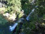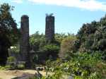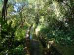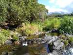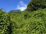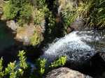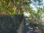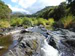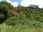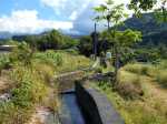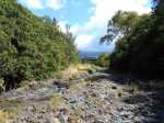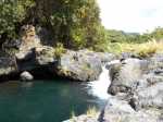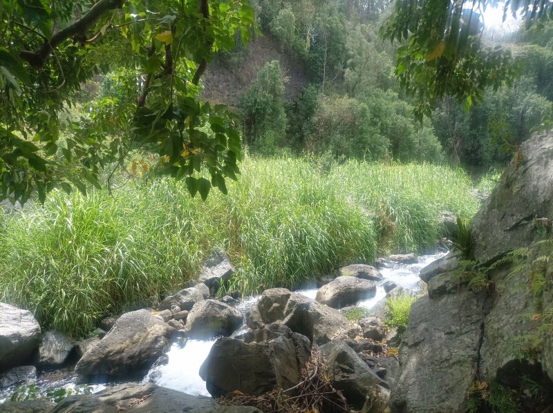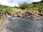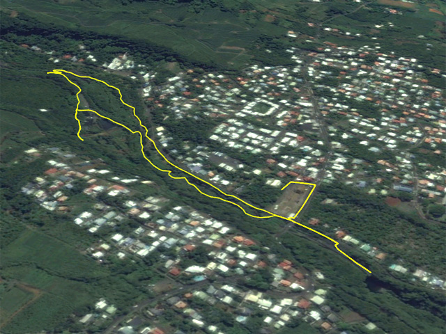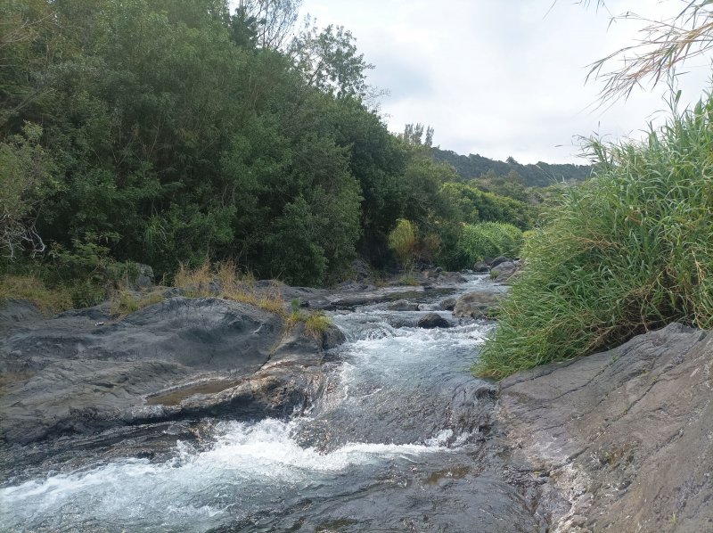 La courte randonnée débute ici à la zone de transit de la canne. De juillet à décembre, un quart d'heure passé ici avant de démarrer la boucle permet de voir arriver les tracteurs, d'assister à la pesée puis au prélèvement d'une carotte qui permettra de calculer ensuite la teneur en sucre. Le chargement est ensuite soulevé par de hautes grues (Photo 1) avant d'être déchargé dans des camions imposants ou sur des tas en attente. Reprendre la route et rejoindre le pont puis chercher sur la droite l'escalier qui se termine sous le pont (Photo 2). Un large sentier bétonné longe la rivière et l'Impasse de la Digue qui se termine en cul de sac près du pont (Photo 3). A la fin de ce véritable trottoir pour planches à roulettes, préférer le talus bétonné qui descend vers la rivière au sentier abrupt dans les arbustes. On se retrouve sur cette caractéristique vallée plate que l'on aperçoit depuis le pont (Photo 4). Le cheminement, presque à plat s'effectue sur de très solides plaques de basalte qui se terminent au cassé de la cascade Jacqueline (Photo 5). On peut s'approcher du bord pour admirer le large bassin 20 mètres plus bas et la cascade qui retombe en deux paliers (Photo 6) mais attention aux déjections de pigeons ou au éclaboussures qui rendent la roche glissante. Devant l'impossibilité de descendre au bassin, reprendre le chemin inverse et repasser sous le pont puis poursuivre sur ce sentier bétonné jusqu'à la route de Grand Galet (Photo 9). Inutile d'emprunter cette route car on peut immédiatement rejoindre la berge. De là, la remontée est aisée sur des roches qu'il faut parfois enjamber (Photo 10) ou en sous-bois herbeux (Photo 12). Plus loin, la végétation disparaît et on retrouve les plaques basaltiques de la rive (Photo 13). La rivière est toujours aussi agréable et des familles se baignent dans le bassin en amont alimenté par une agréable petite chute d'eau (Photo 14). On peut ainsi remonter jusqu'au Bassin Bleu en suivant la rivière ou la petite route. Le circuit décrit ici coupe la rivière pour rejoindre, juste en face, le Canal Langevin. Traverser à gué sur une zone facile comportant plusieurs bras (Photo 15) et reprendre en rive droite jusqu'au bassin précédent. Remonter le mur rocheux, surplombé par un arbre, qui domine le bassin (Photo 16). Ce sera le seul écueil de la boucle qui, grâce aux branches, ne comporte aucune difficulté. On se retrouve près du canal transportant l'eau depuis le captage situé à quelques dizaines de mètres mais envahi de végétation difficile à pénétrer (Photo 17). Après avoir remonté jusqu'à la fin du sentier praticable, reprendre le chemin inverse et suivre ce canal, tout d'abord dans le sous-bois (Photo 18) puis, après la traversée de la route, dans un champ (Photo 20). On marche le plus souvent, sans difficulté, sur la murette large et plate. Plus loin, on aperçoit les deux cheminées de l'ancienne sucrerie Kerveguen (Photo 21) qui sert désormais de dépôt et de pépinière à la commune de Saint-Joseph. L'usine a été construite en 1854 par Le Coat de Kerveguen, grand industriel, armateur et propriétaire terrien de tout ce qui pouvait produire de la canne. Elle est tombée doucement en ruine à l'abandon de celle-ci dans les années 1920. L'eau termine sa course avec fracas par de larges trous dans la tuyauterie en fonte, là où se trouvait la roue à aube. Il faut alors faire demi-tour car la propriété de la commune est interdite au public. A la route (Photo 22), prendre à droite et la longer sur moins de 200 mètres. C'est l'occasion d'approcher de plus près cette ruine en assez bon état car récupérée par la municipalité (Photo 23). Très vite on se rapproche de la rivière, il suffit alors de quitter la route et de longer l'eau sur des sentiers créés par les multiples passages. De l'usine jusqu'au pont, ce sera une succession de toboggans (Photo 25), de petits bassins (Photo 26) ou de grandes étendues d'eau (Photo 28) qui inciteront à la trempette. Un dernier gué avant le pont permet de changer de rive et de regagner le véhicule par la balance ou par l'escalier emprunté à l'aller.
