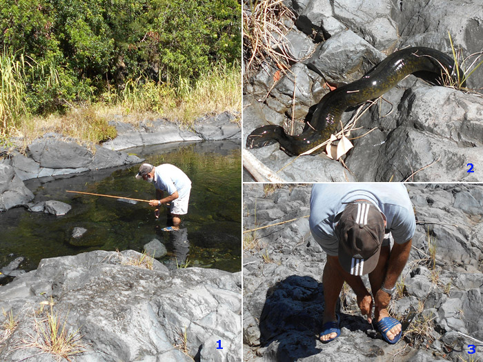 Marche à suivre : Prendre un fil de pêche terminé par un hameçon sur lequel est enfilé un ver de terre. Tenir l’hameçon au bout de la baguette et glisser le ver sous une pierre (1). Mettre la canne en bouche pour garder les mains libres et attendre que la ligne frémisse. A la moindre alerte, tirer et sortir l'anguille de l'eau. Le spectacle est original mais lorsque l'anguille tente de fuir (2) sa vie s'achève par un coup mortel porté au couteau à l'arrière de la tête (3).