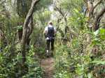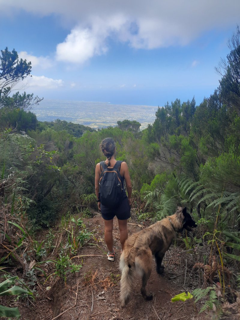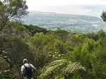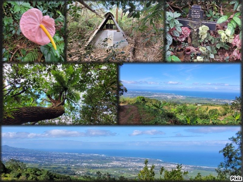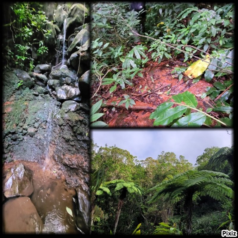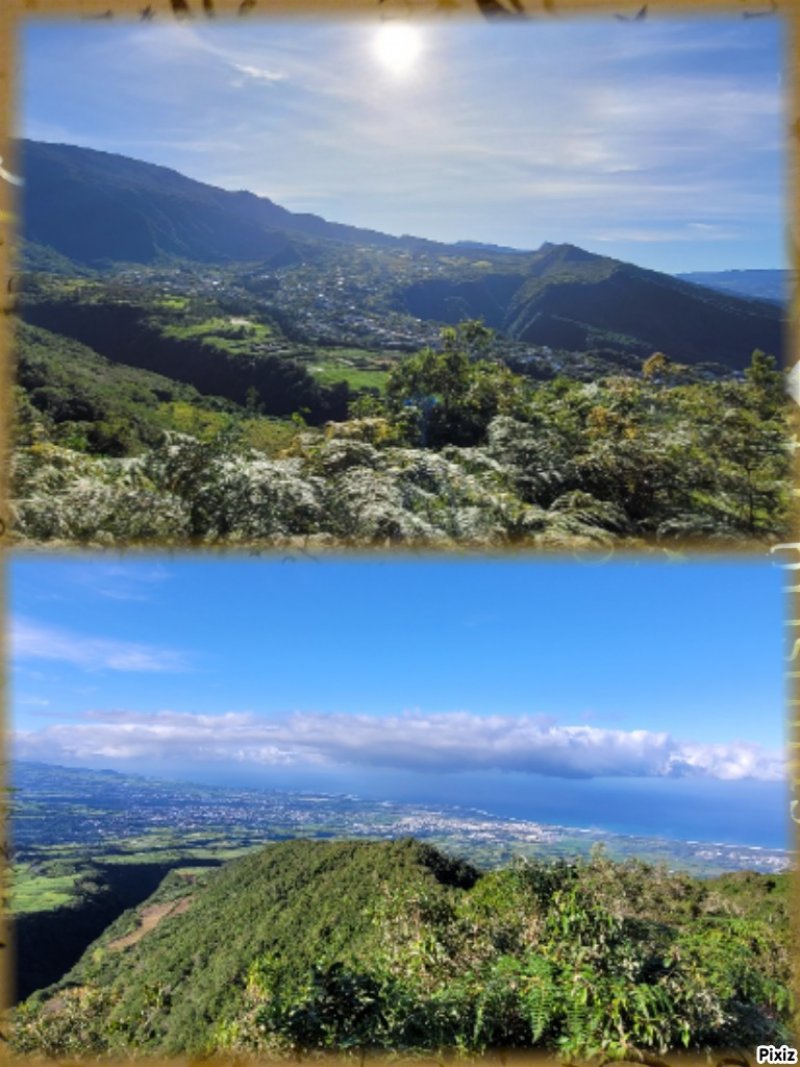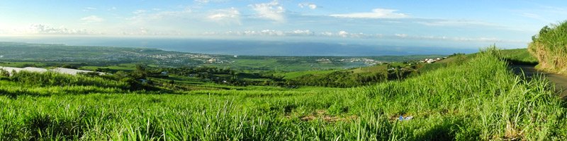 La randonnée peut débuter n'importe où sur les routes empruntées selon que l'on désire commencer ou terminer par le goudron ou le béton. La fiche propose un stationnement un peu avant la Pièce Louise. La circulation n'est pas très importante sur la RD3. Seul le gros gabarit des bus impose plus d'attention. Ces deux kilomètres s'effectuent sans difficulté en profitant des panoramas sur les villes littorales, les champs de canne et d'ananas (Photo 1). Après la Ravine du Grand Maniron, bifurquer sur la gauche et entamer une pente moyenne vers la Pièce Jeanne, un paisible hameau entouré de cannes à sucre (Photo 3). On peut emprunter l'une ou l'autre des deux routes qui mènent aux habitations. Les pistes sont si nombreuses que le GPS est recommandé. De plus, il est très aléatoire d'emprunter des pistes clairement définies sur la carte mais qui finissent immanquablement en cul de sac car obstruées par la haute végétation. Il faut donc rester le plus longtemps possible sur la route. Ce n'est qu'à la fin du béton qu'on cherche la meilleure piste qui part vers la gauche (Photo 6). Profiter des derniers panoramas sur la côte avant de pénétrer en forêt (Photo 5). Les pistes qui mènent au sentier sont de bonne qualité (Photo 7) et la pente assez faible. Un premier panneau de l'ONF rassure sur la direction choisie. Prendre à droite à l'enclos où une vache esseulée a pour compagnie une dizaine de chèvres peu farouches qui tendent le museau à travers le grillage. Prévoir de cueillir de l'herbe verte avant d'arriver à l'enclos pour quelques instants ludiques et odorants ! Poursuivre sur la piste jusqu'aux nouveaux poteaux de l'ONF (Photo 8) et débuter la montée vers les Makes sur un sentier constitué de lacets et de quelques marches (Photo 9). La montée est assez facile et comporte très peu de raidillons. Les bois sont groupés par espèces. On traverse ainsi des surfaces couvertes de bois de perroquet, de jamrosats (Photo 10) ou de bois de remparts (Photo 11). Les fougères sont nombreuses, très hautes et les longoses de plus en plus présentes. On aperçoit les Makes dans les premières trouées de la végétation qui envahit le haut de la crête (Photo 12). Le sentier s'élargit par endroits (Photo 14) et la végétation permet de plus larges points de vue (Photo 15). On entend couler des cascades dans la Ravine de Bellevue. Les longoses deviennent de plus en plus touffues (Photo 16) avant d'être remplacées par les lisandras Nom donné à la Réunion à Tibouchina urvilleana. Plante ornementale originaire du Brésil, introduite pour la beauté de ses fleurs mais qui s'est très vite naturalisée jusqu'à devenir envahissante de classe 4/5. Sa croissance est très rapide et elle peut facilement atteindre 5 m de haut. Egalement appelée Fleur araignée en raison de ses 10 étamines.(Photo 17). Autant la fleur est magnifique, autant les tiges poussent vite et dru, empêchant tout passage sans coupe-coupe (Photo 18). Des surfaces très importantes recouvrent le haut de la crête. Le sentier grimpe un peu, effectue quelques lacets et plus loin un coude à 90°. Cet angle droit est remarquable et ne peut se manquer cependant le sentier qui débute exactement au coin est plus difficile à imaginer (Photo 19). Cette reconnaissance a été effectuée sans "outils destructeurs d'envahissantes" et c'est en rampant que les 15 mètres de lisandras ont été franchis. Après deux ou trois passages de randonneurs prévoyants, ce sentier deviendra un grand classique de la région. Une fois l'obstacle franchi, le sentier apparaît (Photo 20). Il devient de plus en plus agréable et de plus en plus large au fur et à mesure de la descente. On retrouve lors de cette descente les mêmes types de paysages et végétation que ceux rencontrés lors de la montée. A la saison, des tronçons recouverts de pétales de lisandras sont du plus bel effet (Photo 21). Plus loin, les curieux seront sans doute tentés de descendre le sentier aperçu à droite qui plonge dans le Petit Bras vers les sources la Boue. Quelques marches (Photo 23), quelques glissades sur la terre humide (Photo 22), des portions plates (Photo 27), une croix commémorative de la mort de Mario Payet (Photo 26) et le sentier se termine à une cabane métallique et son antivol pour motos. On retrouve, comme de l'autre côté, les pistes qui débutent dans une immense bananeraie fort bien entretenue (Photo 28). Suivent quelques cultures et de la canne à sucre jusqu'à la petite route bétonnée qui rejoint la RD3 à l'arrêt de bus du N° 199, fin de la boucle.