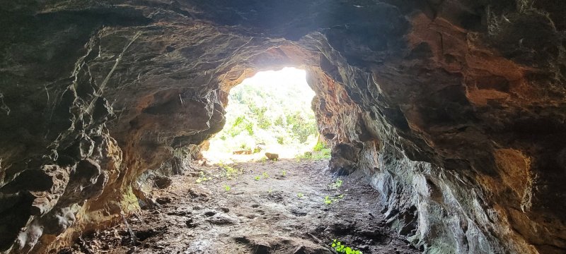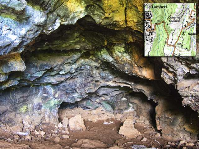 Si, pour se rendre à la Pièce Jeanne, on emprunte la D110 entre l'Etang Salé les Hauts et la Route Hubert Delisle, on passe très près du petit village du Lambert, ce qui permet d'effectuer une courte halte à la Caverne Thomas. Au premier croisement, prendre la D110 vers le Lambert et stationner au plus près de la Ravine des Cafres. La grotte se rejoint par un très court sentier en lacets qui débute près du radier en rive gauche. On rejoint en moins de 5 minutes cette bouche de tunnel qui est assez profonde et se poursuit dans l'obscurité. Ne pas oublier d'emporter sa frontale pour profiter des couleurs chaudes de la grotte et hélas de quelques détritus laissés là. Il faut dire que la table-palette fixée à l'entrée incite au pique-nique et que la cavité pourrait contenir des années de déchets laissés après le casse-croûte !!