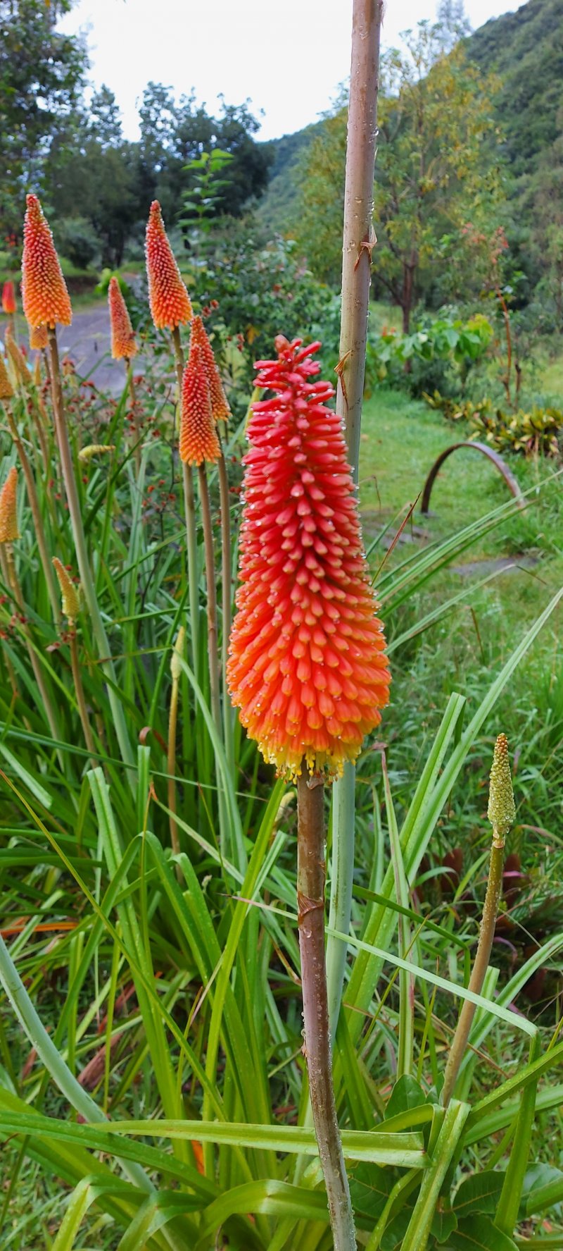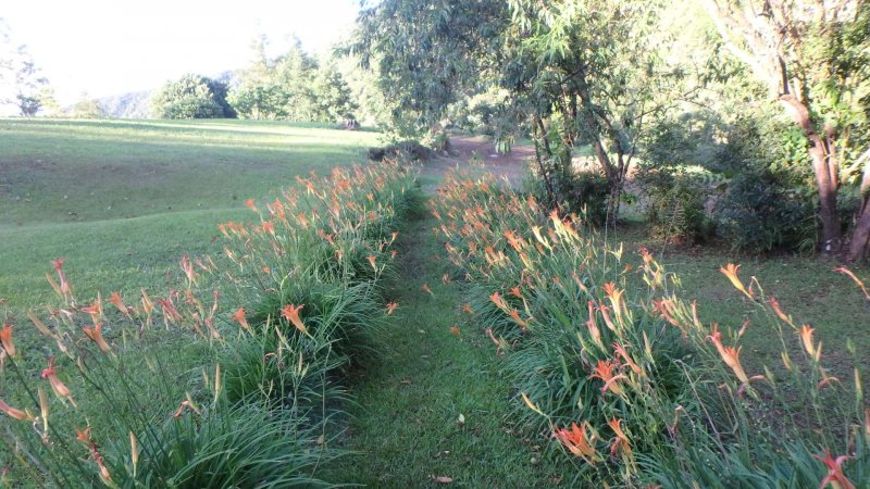 Pas de description détaillée ici tellement le circuit est court avec impossibilité de s'égarer. Il a été pratiqué en effectuant tout d'abord le tour en restant au plus près des limites naturelles de la Ravine de Bellevue ou artificielles le long des champs puis en suivant les pistes ou sentiers bordés de belles fleurs oranges, des lanternesKniphofia uvaria, une liliacée également appelée tison de Satan qui fleurissent surtout en mai (Photo 1 et 8). Au centre poussent quelques platanes qui sont à l'origine du nom du lieu (Photo 12). Ils sont bordés de beaux pieds de camélias de plusieurs mètres de hauteur qui procurent une ombre agréable (Photo 18). L'endroit est également un lieu de prière abritant un oratoire rouge où l'on s'attend à voir un grand Saint-Expédit alors qu'il est surtout occupé par des petites statuettes de la Vierge (Photo 11). L'endroit est idéal en semaine pour un bivouac et du repos entre deux randonnées dans la région montagneuse des Makes.