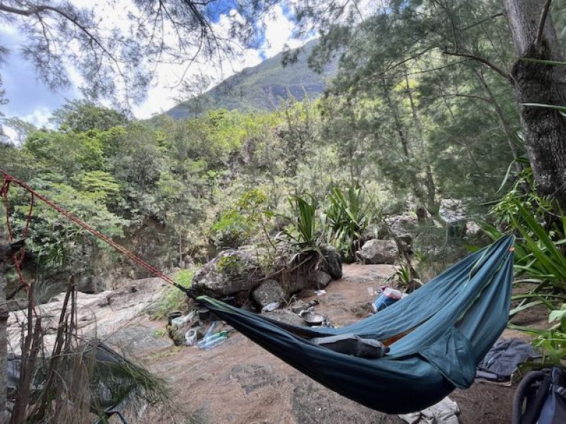 La randonnée débute à Dos d'Ane où de nombreux emplacements de stationnements sont disponibles à l'église, plus deux au départ du sentier. On ne décrit plus cette longue descente, ici effectuée de nuit, qui prend 1h30 à sauter de marche en marche ou de roche en roche ou utiliser échelles ou câbles qui facilitent les franchissement. On profite peu des panoramas sur les crêtes car le soleil se lève à peine (Photo 1). Les parties plates sont assez fréquentes et permettent de souffler un peu. On frise les 800 m de dénivelé et il faut, dès le départ, savoir qu'on devra remonter, fatigués de la sortie, à la lampe frontale si le départ a été tardif. Une fois à l'Îlet Albert, l'aventure peut commencer ! Traverser le gué sur le Bras de Sainte-Suzanne et emprunter la piste qui part sur la gauche (Photo 3) et se termine en cul de sac près d'une mer verte et jaune de hautes cannes fourragères. Elles sont si serrées qu'il devient impossible de se perdre à condition que des âmes charitables aient pris soin de tailler à chaque passage pour créer l'indispensable tunnel (Photo 4). En longeant cet itinéraire on marche dans ces hautes herbes, on traverse le bras de Ste-Suzanne sur de petits gués ou l'on marche en rive droite dans une végétation assez touffue (Photo 5). Le sentier, assez facile puisque plat, se rapproche des pitons rocheux qui forment un étroit canyon et servent de repère pour remonter le Bras des Merles (Photo 6). Ce sentier qui rejoint Aurère, malmené par la végétation, est assez difficile à repérer une fois le dernier gué franchi avant le barrage (Photo 7). On se retrouve sur l'ancienne piste ayant servi à la construction du barrage. Elle est méconnaissable, envahie d'une végétation dense mais se suit sans problème. Curieusement, l'eau rencontrée lors des passages de gués a disparu et la progression, lorsqu'elle n'emprunte pas la vieille piste, s'effectue parfois en rive droite ou dans le lit de la rivière. Lorsque le torrent a beaucoup d'eau, on rencontre de magnifiques bassins d'eau claire remplis par des résurgences. La remontée se poursuit en sautant de galet en galet. Repérer, sur un gros rocher à droite, un beau pied de lilas de Perse ou margousier (Melia azedarach) dont le parfum a indiqué sa présence 100 mètres avant d'arriver au rocher (Photo 8). Sa fleur en grappe est magnifique. Plus haut, le discret sentier remonte près des rochers et des vestiges de la piste vers une plateforme également couverte d'arbustes (Photo 9). On passe au-dessus ou près des deux tunnels bétonnés bien visibles sur la carte mais désormais cachés par le feuillage. C'est là que débutent des kilomètres de galeries creusées sous la montagne pour transporter l'eau vers l'ouest. On parvient au barrage qui récupère une grande quantité d'eau par d'ingénieux systèmes (Photo 11). Le sentier vers Grand Îlet débute de l'autre côté de la rivière. Après avoir escaladé la dizaine de mètres de roches bétonnées, il est facile à deviner dans les langues de belle-mère (Sansevaria). C'est parti pour une longue remontée du bras sur un sentier assez facile à suivre dans les chocas la plupart du temps (Photo 13). La visite de l'Îlet Natte est réservée aux amateurs de griffures, piqûres et rampés sous les lianes papillon. Le sentier s'élève plus vite que le cours d'eau que l'on domine en frôlant quelques précipices protégés par des branches puis redescend au gré du relief très chaotique du fond de la vallée. Si le chrono le permet, ne pas manquer les trois bassins alimentés par de belles chutes d'eau. Le petit sentier qui rejoint la berge se devine facilement avant la grande montée sableuse de la Photo 16. Une fois à la rivière, traverser au pied du troisième bassin (Photo 14). Poser les sacs sous l'arbre et entreprendre la grimpette qui permet de contourner deux nouveaux bassins dont le Bassin Bleu. Les cascades qui les alimentent ne sont pas excessivement hautes ; l'endroit (également dangereux), dominé par le piton qui surplombe le Bras Détour, est enchanteur et invite au repos et à la baignade (Photo 15). Il faut pourtant poursuivre en retrouvant le sentier. Après la forte pente où les feuilles de chocas servent de main courante, on se retrouve en haut du Bassin Bleu pour un dernier coup d'œil sous un autre angle (Photo 17). Le sentier est toujours aussi facile à suivre (Photo 18). Le Bras Détour surgit de la falaise sur la gauche. Il sort d'un étroit canyon dont on peut en remonter une partie après quelques acrobaties sur les rochers. Plus haut, le paysage est réservé aux canyonistes. Le confluent comporte une dent de roche sédimentaire friable très facile à repérer (Photo 20). Traverser à gué à cet endroit et remonter la rivière en rive gauche jusqu'aux filaos, 200 mètres plus haut (Photo 21). Repartir en rive droite et repérer le nouveau départ de sentier (voir § ci-dessous). Chaque replat du terrain comporte des traces de vie concrétisées par des espaces empierrés, des murettes (Photo 22), des arbres fruitiers ou des bananiers produisant encore des régimes (Photo 23). On trouve même la tombe de Joseph, mort à 32 ans et enterré à deux pas du sentier. Il faut dire qu'à des kilomètres de la civilisation, beaucoup d' habitants de ces microscopiques îlets naissaient, vivaient et mouraient sans avoir mis un jour les pieds dans le chef-lieu. Un cimetière existerait, mais la végétation trop dense enlève à l'émotion que dégagent ces lieux. La plupart du temps, le sentier conserve son aspect. Il faut parfois suivre de très courts tronçons de ravine à l'instinct mais l'on devine facilement la reprise de la trace (Photo 24). Un seul endroit peut inquiéter et mérite plus d'attention : il s'agit d'un ancien éboulis au sol incertain, étroit, sableux et glissant (Photo 25). 300 mètres plus loin, des bêlements attirent l'attention. On se retrouve à l'emplacement d'un ancie