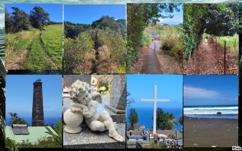 La randonnée commence à la Pointe des Avirons où un petit parking accepte une quinzaine de véhicules. La montée débute par la route jusqu'au pont de la route des Tamarins. Chercher le sentier discret qui part sur la gauche juste avant l'ouvrage (Photo 1). Il se rapproche de la Ravine des Avirons dans de hautes herbes puis devient très facile à suivre. On remarque ça et là des traces de pneus de VTT ou de moto, preuve que ce sentier est connu et fréquenté. Mais il est principalement utilisé par les pêcheurs de la Croix et du Bois de Nèfles Cadet pour se rendre au plus vite vers les roches poissonneuses de la Pointe des Avirons. Il longe toujours au plus près la falaise de la Ravine des Avirons, bien protégé du vide par les épineux. Il alterne parties terreuses et rocheuses (Photo 2) et aboutit en moins de 30 minutes de marche aux premières cases du village de Bois de Nèfles Cadet. Débute une première partie urbaine passant près de la maison de Quartier du Ruisseau et son baobab (Photo 3) suivie de certaines portions en très forte pente (Photo 4). Ces rues en pente se terminent à la RD11, totalement à plat pour une courte pause de 1000 m passant devant un calvaire proche du panneau de la ville (Photo 5). Le pont est un magnifique ouvrage comportant des ouvertures dans chaque pile. La rivière coule rarement entre de gros rochers usés par les crues. Plus loin, le chemin Boussole longe le très long village de l'Entre-Deux. Sachant que le village est également rejoint par une longue route en lacets, on peut imaginer que celui utilisé, rectiligne et en direction du nord, a pu un jour servir à donner une direction ! La pente est forte et les vététistes préfèreront sans doute les lacets. On profite à cette altitude de magnifiques panoramas sur l'Etang Salé et son Bassin Pirogue (Photo 7) ou sur des champs de canne jusqu'à la Pointe au Sel (Photo 8). Une ferme importante sur la droite donne à voir des dizaines de taureaux et bovins enfermés dans une immense étable ouverte au vent. Plus haut, on rencontre la très longue prairie qui sert en partie à les nourrir. La piste longe ensuite cette prairie mais finit hélas dans les galaberts et autres plantes inextricables. Il faut alors suivre la bordure des herbes vertes sur une centaine de mètres sans empiéter sur la récolte et dénicher, dans la pointe, le départ d'un magnifique sentier qui débute par quelques fougères (Photo 10) puis chemine en ligne de crête (Photo 11). Heureusement la végétation a envahi les abords car les personnes souffrant du vertige auraient du mal à parcourir cette portion qui longe également une tuyauterie (Photo 12). Le sentier se termine à la Route Hubert Delisle dans un agréable environnement vallonné et boisé autour de la Ravine des Avirons (Photo 13). De là, on voit très bien le Piton Forcade et son modeste bois de filaos et acacias entouré de cultures (Photo 14). Rejoindre le Chemin de l'Alambic qui contourne en partie le modeste piton en empruntant ou non un raccourci dans les cannes (Photo 15). On parvient sans gros efforts au "sommet" et au col en partie occupé par une vingtaine de chevaux qui guettent la verdure dans la main du marcheur car ils vivent ici dans la poussière. La descente vers les Avirons débute par une nouvelle petite route agréable qui rejoint rapidement la Route Hubert Delisle. La croix du Père Martin, ancien curé du village, vénéré par les habitants est enfermée en propriété privée et les prières s'effectuent désormais à la stèle située 100 m en amont du croisement de la route du Tévelave (Photo 16). Ne pas manquer, tout près d'ici, l'originale Maison Cadeau qui ne laisse personne indifférent (Photo 17). Marcher en direction des Avirons est alors un vrai plaisir en empruntant de nouvelles ruelles étroites et bétonnées (Photo 18) ou bordées de verdure (Photo 19) qui coupent les nombreux virages de la route de la Chapelle ou des Bananes. Une courte halte au Pont Bananes, en descendant dans le lit en rive gauche amont, permet d'étudier son architecture (Photo 21), de voir la petite cascade qui alimente un modeste bassin repéré par les enfants du village pour les baignades dominicales. Un peu plus bas, le Chemin des Vétiverts comporte de nouvelles portions étroites dans la verdure (Photo 22) pour une marche à l'ombre, dans la nature en pleine ville. De nouvelles ruelles longent le Lycée et on se retrouve naturellement au pied de l'église, du mausolée du Père Martin et d'une belle fontaine sculptée. Dans le superbe petit parc, situé entre la mairie et l'église (Photo 23) on peut y voir également la représentation du soleil dans le cadre de l'opération Kosmos (voir § ci-dessous). Après une visite des lieux, on peut poursuivre en flânant dans les rues. On voit très bien la cheminée de l'ancienne usine Monjol Mondon et les vagues qui se brisent sur le récif de l'Etang Salé (Photo 24). Le petit détour à la chapelle du Carmel Notre Dame du Large permet de visiter un endroit serein et calme pour une dernière pause avant la dernière descente (Photo 25). On emprunte alors la longue et pentue Allée du Cimetière qui se termine au monument dédié aux militaires morts en Afrique et au cimetière où poussent des dizaines de frangipaniers dont certains sont centenaires (Photo 27). On retrouve le Chemin Pavé qui passe sous la Route des Tamarins et se termine près du véhicule. Ne pas manquer la dizaine de pêcheurs sur les rochers ou les dernières vues sur la plage et le village de l'Etang Salé (Photo 28).