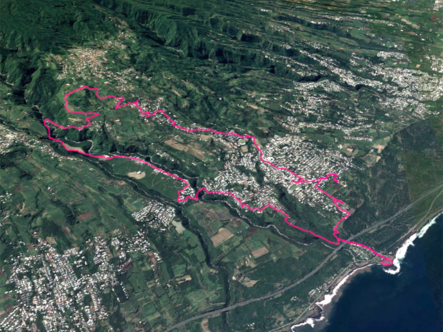 Se rendre à l'Etang Salé à partir de l'échangeur de la RN1 - Tourner à droite au premier rond-point et filer vers Saint-Leu - Franchir la Ravine du Ruisseau puis bifurquer immédiatement à gauche sur la petite route vers la mer pour stationner à l'extrémité - Reprendre la ruelle jusqu'à la RN1a qu'on traverse en direction du pont de la route des Tamarins - Emprunter à gauche, avant le pont, le sentier qui remonte vers le Bois de Nèfles Cadet - Au village, suivre la Rue de l'Océan puis le Chemin Belda jusqu'à la D11 - Partir sur la gauche, traverser le pont de la Ravine des Avirons et prendre la première route à droite, le Chemin Boussole - Remonter longuement avant de parvenir à une grande ferme d'élevage - Poursuivre par la piste qui longe la prairie puis terminer par le sentier en ligne de crête jusqu'à la Route Hubert Delisle qu'on prend vers la droite pour franchir à nouveau la ravine - Aux premières maisons du hameau de la Route Delisle, utiliser les raccourcis qui coupent les lacets et emprunter sur la gauche le Chemin de l'Alambic - Contourner le Piton Forcade puis redescendre vers les Avirons par le Chemin Parc à Mouton - Effectuer ou non l'aller-retour de 100 m jusqu'à la stèle du Père Martin puis reprendre la coupée des lacets de la Route des Vacoas par le Chemin Boyer, d'autres ruelles puis le Chemin des Jamblons avant de parvenir au Pont Bananes sur la Ravine du Ruisseau - Aussitôt après le pont, emprunter le Chemin des Vétyvers qui comporte une portion en ruelle étroite dans la verdure - Poursuivre par ce chemin et de nouveaux raccourcis jusqu'à l'église et la mairie - Repartir sur la D11 en descendant ou non vers le Carmel en aller-retour et en utilisant la forte descente de l'Allée du Cimetière - Passer dans ou près du cimetière et retrouver le Chemin Pavé qu'on suit jusqu'au véhicule ou, conseillé, jusqu'à la plage et aux rochers de la Pointe des Avirons.