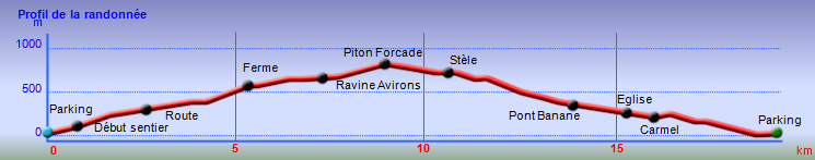 Nouvelle boucle réalisée dans l'ouest sur les conseils de JPV9740 qui aime y rechercher les sentiers oubliés ou les adorables petites ruelles qui traversent certains quartiers. Comme souvent dans cette région, on débute au plus près de l'océan pour en profiter au retour avant de rentrer. La montée est constante jusqu'à 825 m pour découvrir une quasi plaine appelée piton. Les cultures qui le recouvrent ou les chevaux qui piaffent dans la poussière ne semblent guère souffrir de la pente. L'endroit est cependant charmant et permet de magnifiques points de vue sur l'océan et sur les prairies vers le Tévelave et le Piton Deveaux. La boucle comporte aussi de longues et agréables portions de routes où l'on apprécie les abords fleuris, les cases modestes ou luxueuses et la gentillesse de certaines personnes si l'on prend le temps de leur adresser la parole. Sur 19,5 km de circuit la route ne représente que 4800 m. La petite ville des Avirons donne très vite envie d'y vivre et recèle de nombreux points d'intérêt. Cette boucle méconnue pourrait être classée familiale si elle n'approchait pas les 20 km. Les amateurs de vélo se feront un plaisir de la parcourir car la seule difficulté du circuit est justement utilisée par ces sportifs. La description ci-dessous reste généraliste : pour suivre l'itinéraire sereinement, il est conseillé d'imprimer le § Itinéraire ou télécharger la trace qui se révèlera utile en cas d'hésitation.
