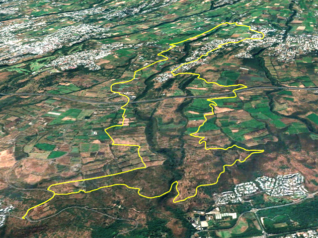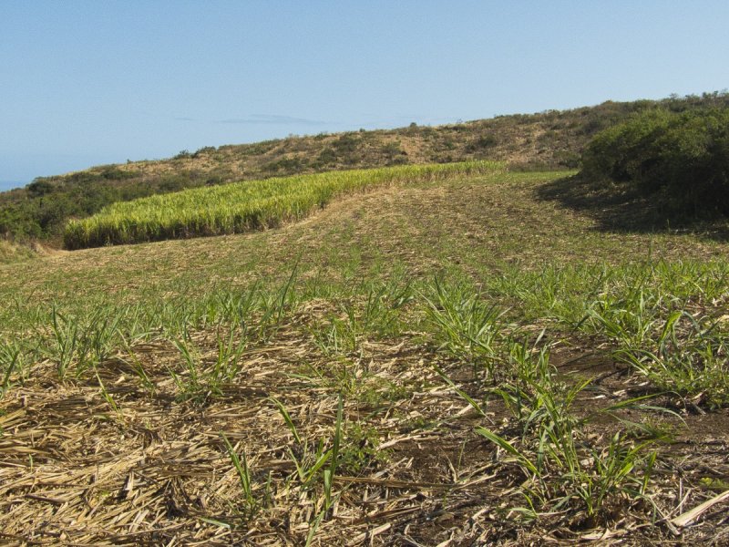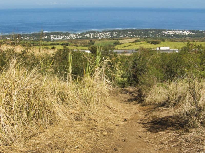 Cette nouvelle boucle de près de 20 km dans la région surchauffée de l'Ermitage emprunte un peu de route, beaucoup de pistes et de sentiers difficiles à suivre par moments. Grand nombre d'entre eux sont créés par les chasseurs qui semblent nombreux à en juger par les étuis de cartouches vides laissés au sol. Les lièvres et cailles ont ici un terrain idéal pour se cacher. La région est couverte d'épineux qui peuvent facilement égratigner au passage et de hautes herbes qui interdisent toute envie de fumer. Comme le montre la trace ci-dessous, le circuit part dans tous les sens. On marche sur des sentiers n'apparaissant plus sur les cartes. Inversement, on cherche vainement des yeux le sentier dont on a la trace sur la carte. Il est sans doute impossible de se perdre mais il semble facile de s'égarer. La meilleure solution pour les amateurs de randonnées surchauffées et parfois aléatoires, est de se munir d'un GPS et télécharger la trace qui présente l'avantage d'avoir été reconnue. Ne pas oublier l'eau même si l'on sait pouvoir se ravitailler au village à mi-parcours. Si des centaines d'hectares sont plantés de canne, de prairies ou de légumes, on traverse des milliers d'hectares abandonnés qui ont, en leur temps, produit canne à sucre, café ou coton dont on retrouve des pieds revenus à l'état sauvage. Il faut aux agriculteurs qui travaillent encore cette terre comportant 80% de cailloux, plus de courage que dans bien d'autres régions de l'île. La description ci-dessous nécessiterait plusieurs pages si on désirait être très précis, aussi, est-il de nouveau conseillé de se munir de la trace.