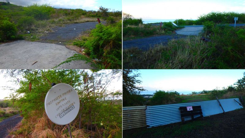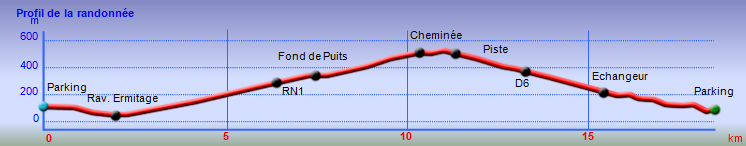 La randonnée débute au croisement de la route de Roquefeuille où quelques emplacements entourés d'ordures attendent les courageux marcheurs habitués à la chaleur. Après 200 m de route assez passante, bifurquer à droite sur la première piste rencontrée à la fin de la murette longeant la partie goudronnée. La piste est en très bon état (Photo 1) jusqu'à des installations où l'on est accueilli par la bande de chiens de Monsieur Cyril Jean-Jacques (Photo 2, voir § ci-dessous). Le sentier, très net sur la carte l'est beaucoup moins sur le terrain et il est difficile à trouver malgré les conseils du sympathique agriculteur. Ce sera la partie la plus difficile et aventureuse de la boucle. Le but est de dénicher ce sentier, ancienne piste pavée du siècle dernier, appelé ici le Chemin des Anglais. Un hors sentier s'avère souvent nécessaire (Photo 4). Une fois sur cette piste rejointe en suivant les multiples traces laissées par les chasseurs, on ne rencontrera plus de difficulté de terrain après avoir franchi la Ravine de l'Ermitage au fond rocheux (Photo 6). En revanche c'est plus délicat avec l'orientation. Une fois sur le Chemin Pavé, bien visible (Photo 7), le suivre longuement en profitant des vues sur Bruniquel, sa cheminée et l'océan tout proche (Photo 11). Partir sur la gauche à angle aigu et marcher jusqu'à une échelle franchissant les clôtures (Photo 14). A partir de là, suivre pistes et sentiers jusqu'à la piste principale passant sous la Route des Tamarins. Après le tunnel, préférer partir à droite pour être certain de marcher sur de belles pistes (Photo 17). Suivre de nouvelles pistes plus ou moins envahies de hautes herbes (Photo 15). Après les champs de canne, ne pas manquer le départ très discret du sentier qui se termine dans le hameau de Fond de Puits (Photo 19). Le sentier est agréable malgré les hautes herbes qui le bordent. Détourner les yeux en arrivant près des habitations car les ordures ne manquent pas .... Le village de Fond de Puits, dans les faubourgs de l'Ermitage est situé à la fin d'une voie sans issue (Photo 21). Le premier raccourci débute à gauche d'une chapelle rectangulaire sans architecture particulière. Les autres sont faciles à trouver ou deviner si l'on n'a pas de carte (Photo 22). Le village de l'Ermitage les Hauts est beaucoup plus petit que celui de la Saline de l'autre côté de la ravine et sa traversée s'effectue très rapidement. La deuxième partie de la boucle débute en passant près du lycée qu'on remarque de loin à la taille imposante des bâtiments modernes. La cheminée qui apparaît derrière le lycée est celle encore intacte de l'usine sucrière de Vue-Belle, bâtie en 1874 et fermée en 1969, d'où son apparent bon état (Photo 24). Elle produisait jusqu'à 400 tonnes de sucre par an avant d'être revendue ou réorientée dans sa production. Elle vient de subir un bon nettoyage en juillet 2018 qui laisse augurer d'une nouvelle vie pour les bâtiments dont certains ont déjà été employés pour le parc nautique et la piscine attenants. Longer la piscine et poursuivre vers la RD4. Marcher vers le nord et franchir la très discrète Ravine de l'Ermitage avant d'entreprendre une longue descente sur piste presque rectiligne jusqu'à la RD6 (Photo 25). A mi-descente, la piste est moins employée sur une centaine de mètres mais on ne perd jamais la trace. Une fois sur la RD6, attention à la circulation car on emprunte la seule vraie portion de route de la boucle sur 2800 m. A l'aire de déchargement de la canne, c'est le grand échangeur de l'Ermitage qu'il faut traverser. Passer un rond-point et bifurquer à gauche au deuxième pour emprunter sur quelques mètres une piste en terre et cailloux. Très vite, prendre sur la droite et alterner pistes herbeuses, parfois herbues (Photo 26) ou terreuses à travers d'anciennes cultures depuis longtemps abandonnées et recouvertes d'épineux. Quelques plantations tentent tant bien que mal de vivre malgré l'arrosage (Photo 27). On se retrouve ainsi après une demi-douzaine de bifurcations à la belle piste qui se dirige vers la route du départ (Photo 28). Cette piste, parallèle à celle employée au départ passe devant les cultures de Cyril, annonçant ainsi la fin proche de la boucle. Il ne reste qu'une courte portion de goudron pour retrouver le véhicule au début de la route de Roquefeuille.