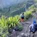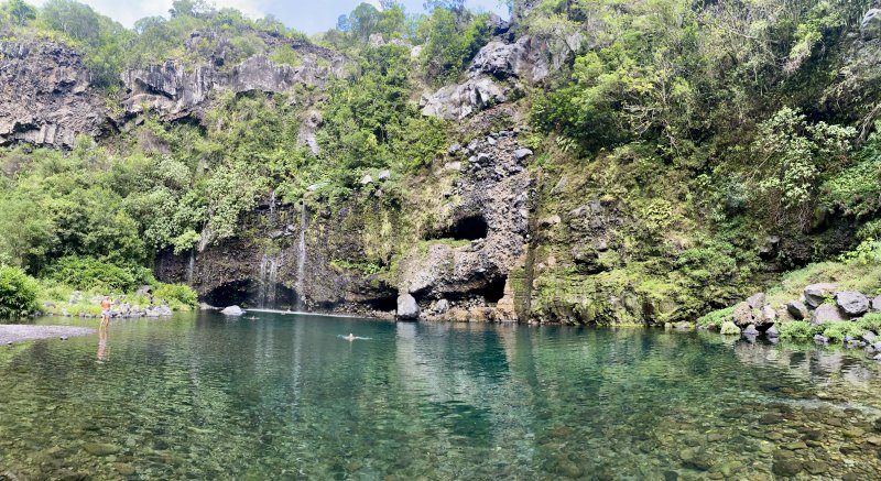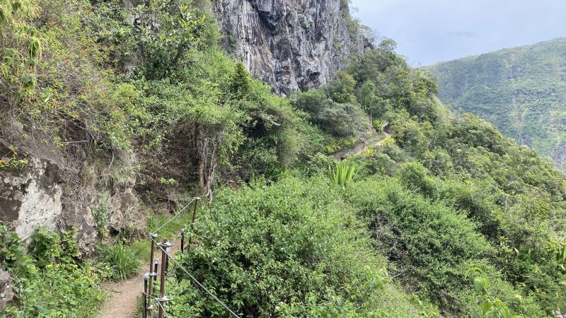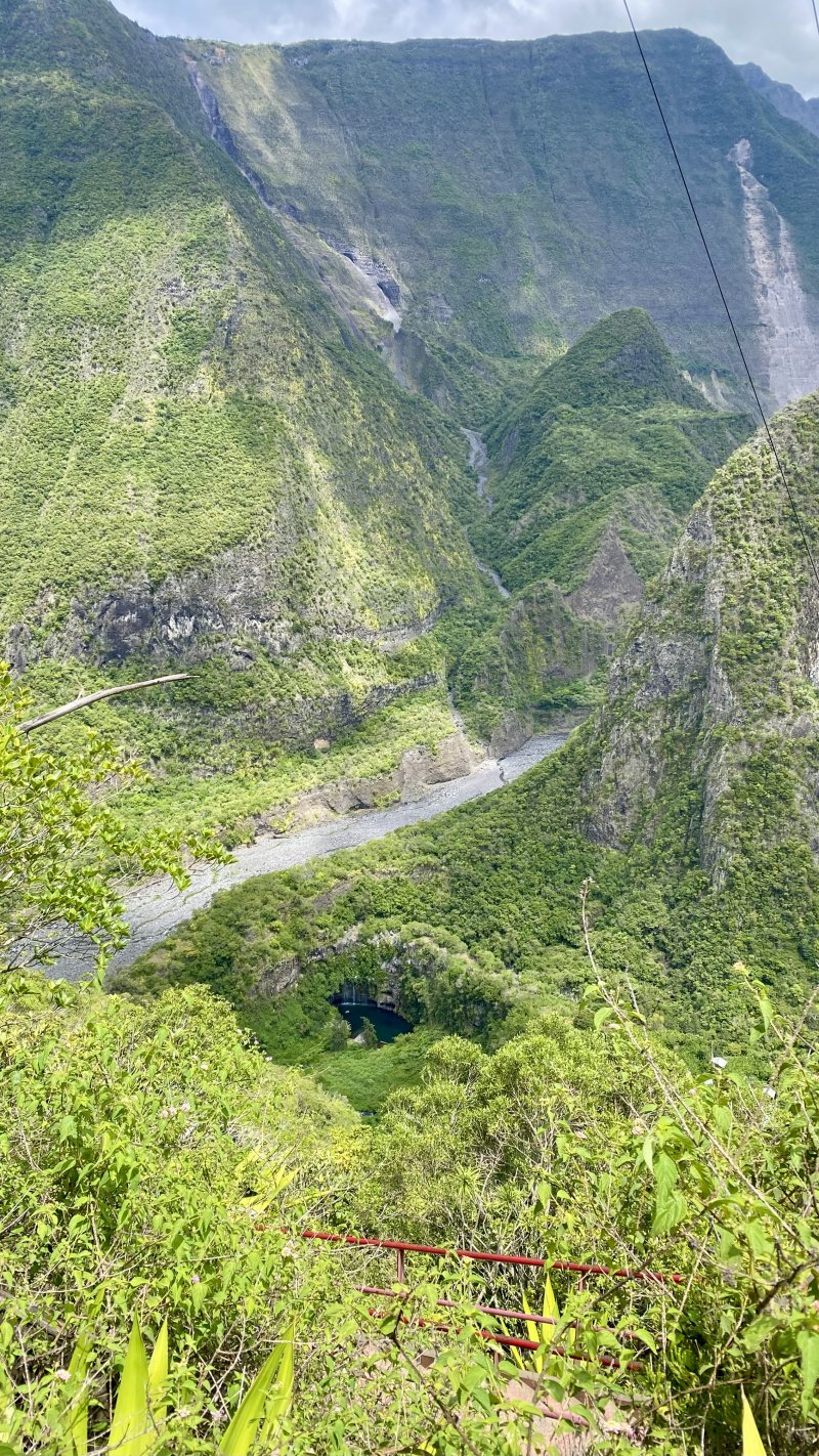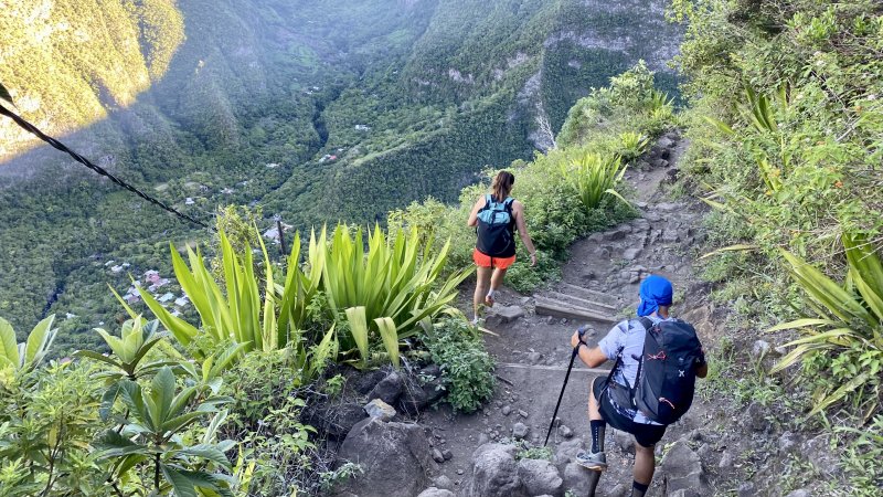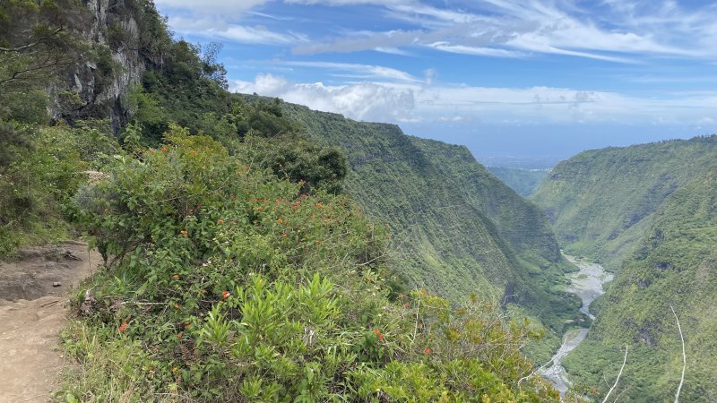 La randonnée débute à deux pas de l'ancienne horloge à eau désormais remplacée par un monument à la mémoire d'Edgar Avril et du Captage. Un belvédère au-dessus du vide permet de contempler le village 700 m plus bas et d'apercevoir le bassin du Voile de la Mariée (Photo 1). Tout près, le téléphérique sert au ravitaillement et l'on peut voir la petite nacelle qui attend les marchandises. On pourra même visiter l'autre extrémité du câble une fois à Grand Bassin. Le sentier débute près du téléphérique et longe le rempart protégé du vide par la végétation. Goyaviers, bringeliers et lantanas constituent une grande part de la végétation empêchant de profiter du spectaculaire panorama. Après un petit kilomètre d'une marche facile, le sentier se met à plonger sans transition. Les marches en béton du début sont remplacées par celles en pierre, plus nombreuses et souvent très hautes. Cette descente qui semble ne jamais finir se poursuivra jusqu'au Bras Sec avec seulement une partie plate longeant une haute falaise basaltique (Photo 2). On passe près de l'oratoire dédié à Ste-Rita le long de cette falaise, après avoir franchi l'éboulis qui vaut au sentier d'être régulièrement fermé durant les longues remises en état. La descente se poursuit, sans grande difficulté hormis de hautes marches. Si elles paraissent faciles lors de la descente,au retour il en sera tout autrement (Photo 3). Les vues sur les différentes vallées sont de plus en plus belles au fur et à mesure que le soleil s'élève. On devine souvent le bassin et sa cascade sur la gauche du village qu'on domine encore pour longtemps. On rencontre à mi-parcours les nouvelles installations de transport d'eau. De récentes canalisations posées sur les anciennes laissent imaginer un vertigineux chantier. Cela ne rajoute rien à l’esthétique du lieu mais doit gagner en efficacité. De nombreuses passerelles et de hauts escaliers permettent de franchir les ouvrages sans danger de glissade sur les tuyaux humides. Une DZ domine les installations de pompage. Elle s'atteint facilement pour mieux profiter du paysage (Photo 4). A partir des dernières canalisations, la descente est plus facile et l'on aperçoit très bien la vallée du Bras Sec ou le rempart séparant de Cilaos vers le Rond des Chevrons (Photo 5). Les derniers hectomètres comportent encore de hautes marches sur un sol rocheux (Photo 6). La passerelle franchissant le Bras Sec marque la fin de la descente et le début de Grand Bassin (Photo 7). Un coup d'œil sur le chemin parcouru permet d'apprécier la pente et de deviner le belvédère du départ (Photo 8). On se retrouve vite dans ce petit village sans rues mais parcouru de larges sentiers bordés de murets en pierres sèches (Photo 9). Les gîtes rivalisent de beauté par les couleurs de leurs façades ou les jardins fleuris qui les bordent. De belles treilles de vigne créent de l'ombre pour le repos des randonneurs restés dans les gîtes (Photo 10). Au premier croisement de ces sentiers, prendre à gauche et descendre vers le Bras de Sainte-Suzanne qu'on entend depuis les habitations. La visite de la chapelle, en partant à droite, ne prend que 5 minutes (Photo 11). Dans la descente, repérer le petit sentier de gauche, non renseigné, menant en moins de 100 m aux installations du monte-charge pour de nouvelles vues en direction de Bois Court (Photo 12). Reprendre la descente jusqu'au gué, facile à franchir en sautant de roche en roche si le niveau de l'eau est assez faible. Une beauté de la nature constituée d'une cascade tombant dans un bassin surmonté d'une arche basaltique se visite à 150 m du gué sans se mouiller les pieds. Partir vers l'amont en cherchant le meilleur passage, principalement en rive gauche (Photo 13). Le torrent est toujours vif et ne se prête pas du tout à la baignade (Photo 14). Quand un bassin semble empêcher la remontée, repérer dans la falaise le sentier étroit qui grimpe assez fortement, passe près d'une échelle et se termine au pied du bassin (Photo 15). L'accès à la grotte s'effectue sur les basaltes lisses où les prises sont assez rares (Photo 16). Il faut donc prendre toutes ses précautions pour l'atteindre, renoncer si les roches sont mouillées et ne pas l'effectuer avec un enfant. Une fois atteint le haut de la grotte, le spectacle est au rendez-vous (Photo 17). L'eau de la petite cascade se jette dans un bassin profond entouré de grottes (Photo 18). Ne pas laisser de déchets en ce lieu magique. Reprendre la descente du cours d'eau en empruntant le même itinéraire et repartir sur la droite au gué en direction de la cascade. Les plus aventureux voudront tenter les quelques cordes permettant de rejoindre le Bras des Roches Noires. L'aventure est de courte durée mais peut s'avérer ludique en prenant garde cependant aux passages étroits en corniche ou aux pierres qui s'effritent et peuvent blesser "les premiers de cordée" (Photo 19). Le départ se situe 50 m avant le haut de la cascade. Grimper quelques mètres le long de la ravine caillouteuse à sec en visant la première corde, discrète, une dizaine de mètres en amont. Le sentier monte fortement jusqu'au balcon d'où l'on bénéficie de superbes vues sur le bassin et la vallée du Bras de La Plaine. Il traverse un sous-bois et longe ensuite le bras après les longues descentes encordées (Photo 20). Descendre dans le lit de la rivière, très large et couvert de galets pour se balader à l'envie (Photo 21). La remontée du Bras des Roches Noires nécessite une journée spéciale. Entamer la descente du bras en passant au pied de l'Îlet Cicielle désormais abandonné mais toujours en propriété privée. On aperçoit la canalisation des Hirondelles sur le rempart d'en face (Photo 22). Le Bras des Roches Noires est rarement à sec mais se traverse assez facilement sans se mouiller les pieds. On parvient très vite au confluent avec le Bras de La Plaine en sauta