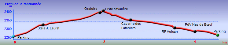 Cette courte balade familiale sur le GRR2 en direction de l'Oratoire Sainte-Thérèse permet aux randonneurs peu entraînés d'emprunter certains sentiers au-dessus de 2300 mètres et profiter ainsi de magnifiques panoramas sur le Piton des Neiges, la vallée de la Rivière des Remparts ou le Fond de la Rivière de l'Est. Le point de départ est une aire très verdoyante recouverte de petits tamarins des Hauts, idéale pour le pique-nique au retour de la boucle. Les plus courageux poursuivront après l'Oratoire vers le Plateau des Basaltes. Le retour peut emprunter le même sentier mais la piste cavalière, à quelques dizaines de mètres de là, semble plus facile tout en proposant les mêmes panoramas ou paysages. Ne pas manquer, dans la montée, la Stèle Josémont Lauret ainsi que la Caverne des Lataniers dans la descente. Cette cavité, peu évidente à dénicher si on en ignore l'emplacement, se rejoint par un petit sentier discret et se repère aux pierres empilées sur le rocher qui la domine. .