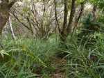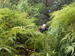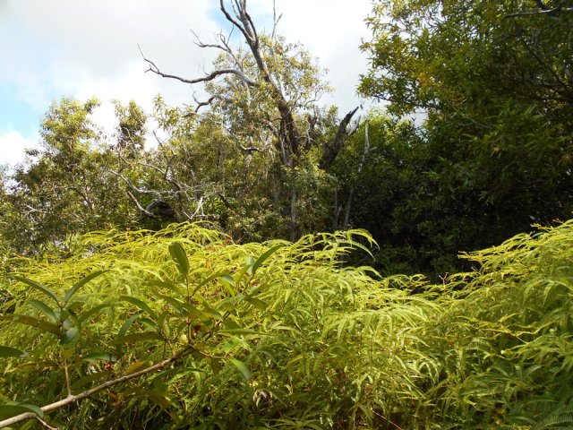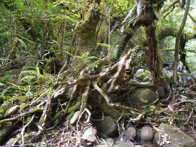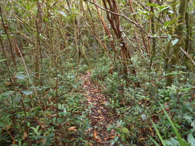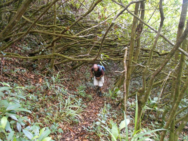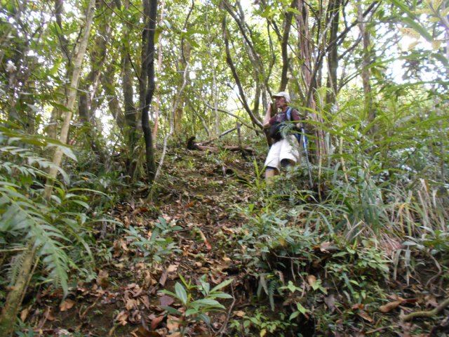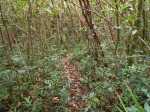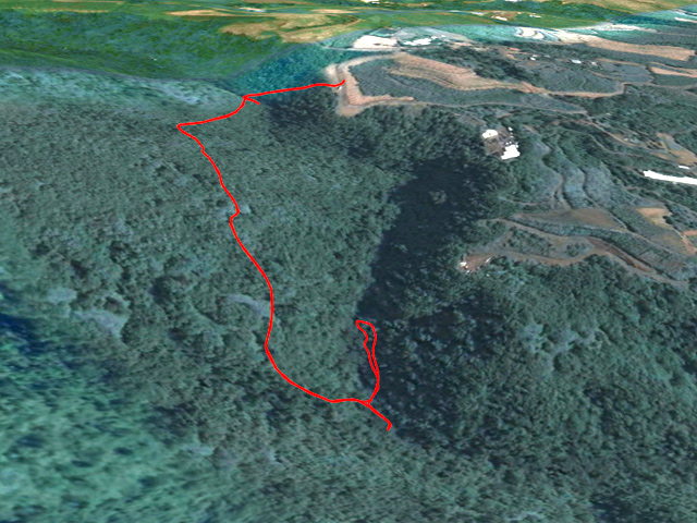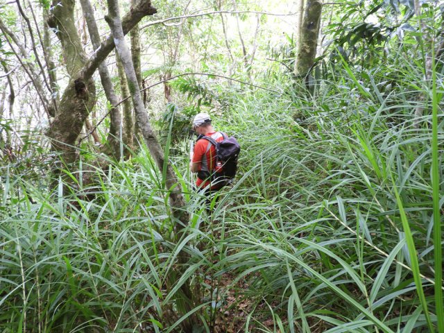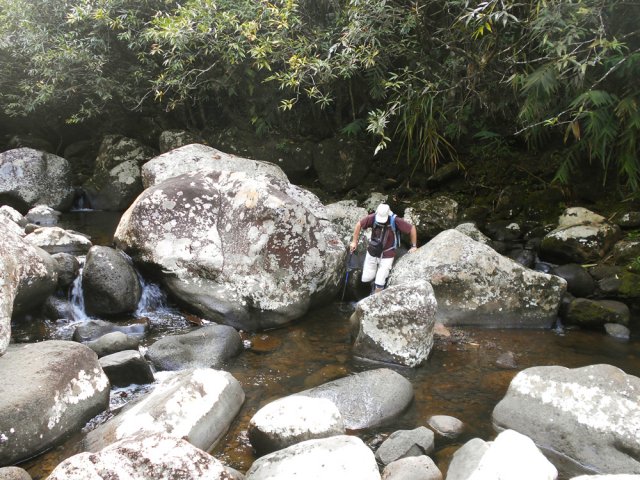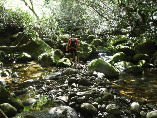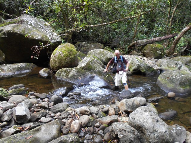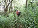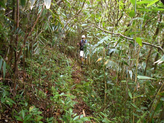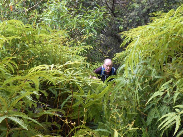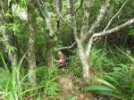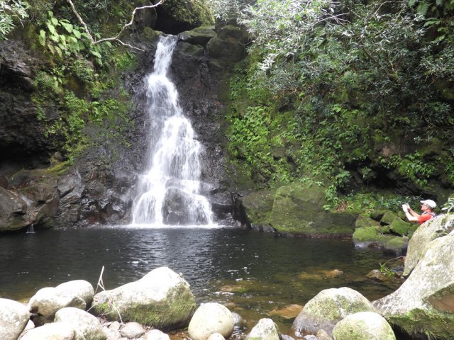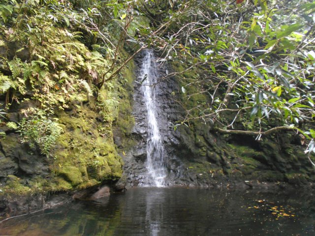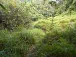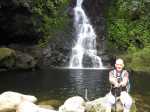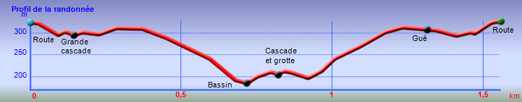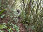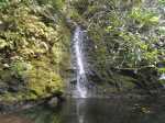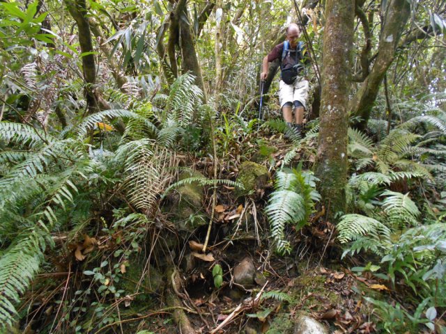 La randonnée débute à quelques mètres du grand virage à gauche au milieu des cannes à sucre tout près d'un triangle non cultivé servant de parking (Photo 1). Une marque de peinture bleue indique le départ TRÈS difficile à repérer si l'on passe près du champ sans trop y prêter attention. Une très courte pente amène à un sous-bois arboré en haut du rempart (Photo 2). Les herbes hautes cachent le sol et il faut regarder attentivement pour rester sur la trace (Photo 3). Suivre ce très étroit passage qui descend vers la première cascade entre goyaviers et bambous balais (Photo 4). Le terrain est un peu glissant mais les arbustes aident au maintien. Très vite, on entend puis on aperçoit la chute d'eau entre les branches. Il faut, pour s'en approcher, traverser le ruisseau à gué (Photo 5). On ne voit que le haut de la chute depuis le gué. Pour l'apprécier ou la photographier, descendre prudemment les rochers en rive droite et gagner un promontoire qui donne un très bon angle de vue (Photo 6). L'endroit est moussu et glissant et demande une grande prudence (Photo 7). Pour atteindre le bas de la haute chute, partir du promontoire et récupérer un étroit sentier scabreux qui descend rapidement sur les rochers occupant le lit de la ravine. Remonter et poursuivre sur le sentier qui se poursuit en direction de la prochaine cascade par une très légère montée (Photo 8). On rencontre un peu plus loin un beau sous-bois de jamrosats penchés qui obligent à se courber un peu (Photo 9). Ces arbres ne disparaissent pas mais on passe près de certains bois de couleurs aux troncs recouverts de fougères (Photo 10). Il faut également franchir de minuscules ravines dont certaines sont parfois en eau. La pente devient plus forte et ces arbres sont fort utiles pour ralentir la descente (Photo 12). On longe plus loin le rempart sur un sentier plat et assez bien marqué (Photo 13). On se retrouve dans une vaste zone de fougères (dicranopteris linearis) et de hautes herbes où le sentier donne l'impression de disparaître (Photo 14). En écartant les rameaux, le trajet est facile à suivre. Ne pas manquer une discrète bifurcation dans les fougères et partir légèrement à droite en évitant la trace qui a été créée par les erreurs d'intrépides marcheurs qui ont risqué leur vie sur une descente de fou. Faire attention dans les mètres qui suivent car le sentier dans les bambous balais ne fait pas 10 cm de large (Photo 15). La longue descente semble interminable. Les 50 derniers mètres de D- s'effectuent plus ou moins acrobatiquement en cherchant toujours la racine pour le pied et la branche pour la main qui freinera la plongée (Photo 16). Nouveau bruit de cascade quand on aperçoit les galets et le torrent. Sur la droite en arrivant à la ravine, repérer un bassin d'eau sombre alimenté par une petite chute (Photo 17). Entamer une courte remontée de la Ravine Terre Rouge en cherchant le meilleur passage (Photo 20). Les rochers sont très hauts parfois et il faut les enjamber (Photo 21) ou les contourner, quitte à se mouiller un peu les pieds (Photo 22). Une dernière escalade permet d'approcher le bassin (Photo 23). Le lieu, qui comporte une agréable cascade tombant d'un goulet, une grotte sur le côté et un bassin profond est de toute beauté et permet une halte reposante avant d'entamer la montée (Photo 24). Les amateurs de descentes de ravines pourront tenter de poursuivre vers l'aval en prenant garde aux galets luisants et moussus. Le retour demandera beaucoup plus d'énergie en raison de l'inclinaison du sentier (Photo 27).