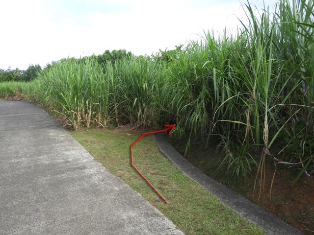 Se rendre à Bras Panon en venant de Saint-Benoît - Emprunter la D48-1 vers la Rivière du Mât - Avant le village, prendre à gauche le Chemin Maillard (D59) puis poursuivre par le Chemin Carreau Morin - Quatre kilomètres plus loin, quand la route s'approche du rempart et effectue un grand changement de direction vers l'ouest, stationner au début du sentier (Photo 1) - Trouver dans les cannes à sucre le très discret sentier et rejoindre la Ravine de Terre Rouge près d'une haute cascade - Poursuivre sur le sentier en forte descente jusqu'au bassin d'un petit affluent de la ravine - Remonter la Ravine de Terre Rouge jusqu'à la deuxième cascade et faire demi-tour par le même itinéraire.