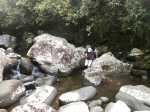 Très difficile de faire aussi court comme sortie non familiale mais on y arrive lorsque l'on est dans la région de Vincendo à la Rivière du Mât. Il faut donc, pour aller voir de plus près cette belle ravine sauvage, organiser une randonnée dans les parages comme les bassins du Bras des Lianes ou la boucle du sentier de Terre Rouge. Toutes les ravines et rivières de la région proposent des cascades plus ou moins hautes et puissantes qui sont connues et pratiquées par les canyonistes. Les discrètes marques bleues, les anneaux fichés sur les rochers ou des restes de cordes près des cascades indiquent que l'on se trouve près de leur terrain de jeu qui est plus aquatique que celui du randonneur. Le sentier pris en aller-retour pour s'approcher de deux belles chutes de la Ravine de Terre Rouge n'est emprunté qu'en montée par ces professionnels de sorties aquatiques. Une partie de la descente est très raide mais sans grands dangers. A la remontée, l'effort est plus intense mais la sensation de danger disparaît car on ne voit plus le vide.