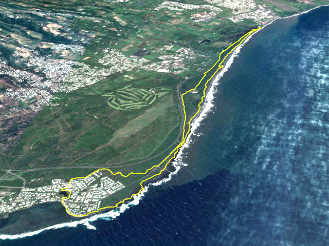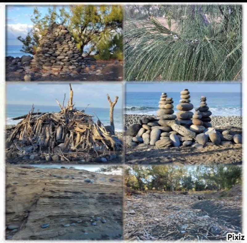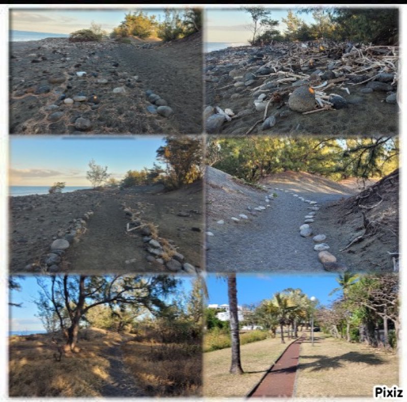 Voici une randonnée à réserver pour la période hivernale. Effectuée durant l'été austral par 32° à l'ombre, on marche au soleil avec des températures avoisinant les 40°C. Autant dire qu'il faut prévoir de l'eau car on ne pourra compter sur aucune cascade ou source pour s'alimenter. Le sol est constamment plat mais l'effort est soutenu car plus de la moitié de la boucle s'effectue sur, ou plutôt dans le sable très fin. Le pied s'enfonce allègrement et les chaussures se remplissent doucement. L'océan est toujours proche et si on ne le voit pas, on entend toujours rouler les galets. Ce bruit permet d'expliquer facilement à des enfants comment la mer arrive à créer un galet rond en quelques semaines. Inutile de tenter d'éviter ces zones sableuses car toute la région, de Saint-Louis jusqu'à l'Etang Salé est constituée de hauteurs parfois impressionnantes de ce sable gris, très instable. Les arbres, principalement des filaos et des épineux ont envahi les dunes et les maintiennent en place. Ne pas manquer les tâches d'eau au sol au petit matin (grand matin à la Réunion). Les filaos, qui ont profité de la fraîcheur de la nuit et des embruns venant de la mer, se sont recouverts d'une fine pellicule d'eau qui coule aux premiers rayons. Aucune crainte de s'égarer car la boucle est située entre la RN2 et les vagues. Des dizaines de sentiers partant dans tous les sens permettent de se créer une randonnée à la carte. La fiche propose de rallier l'Etang Salé en marchant au plus près de la mer et de revenir en suivant la voie rapide. On rencontre, tout au long du parcours, des étendues importantes de bois flottés, des sculptures mêlées aux ordures parfois ramassées et entreposées, un champ de cairns, des bassins et des ports naturels où viennent se briser les vagues. La balade dans le village permet de s'approcher de l'étang puis d'emprunter un circuit qui revient vers la route en traversant le Domaine de la Roche Carangue. En cas de fatigue il est possible d'effectuer un long parcours sur la piste cyclable mais le goudron surchauffé a vite fait de décourager et incite à prendre les sentiers un peu plus ombragés.