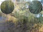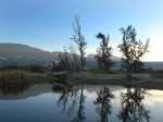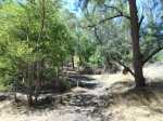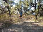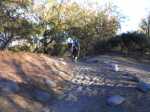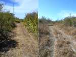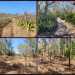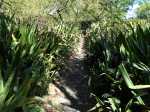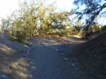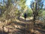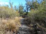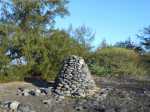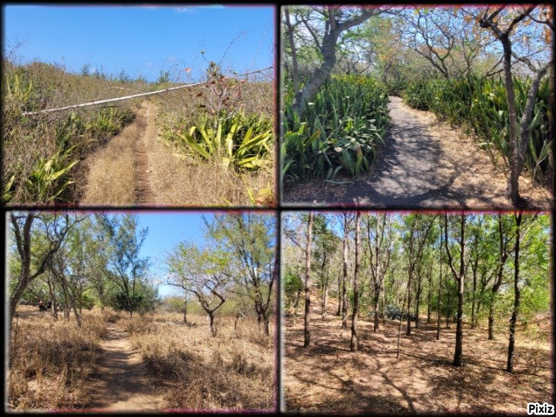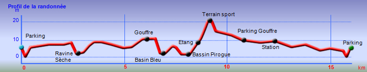 La randonnée débute près des temples de la rue Valmy à la zone de pique nique de Bel Air. Du parking, on a de magnifiques vues sur le Dimitile et la Chaîne du Bois de Nèfles (Photo 1). L'étang, calme, sans une vaguelette, est dominé par les collines qui entourent le Tévelave ou les Makes (Photo 2). Partir en direction de l'océan et traverser la partie basse en marchant sur les galets avant de rejoindre le sentier. Prendre à gauche au premier croisement sur un sentier sableux bordé de galets. On a donc dès les premiers mètres le type de cheminement qui variera très peu jusqu'au retour. Le sentier est large et bordé d'amoncellements importants de bois flottés (et bien sûr d'ordures) apportés par les vagues lors des derniers cyclones. Il n'y a pas à réfléchir puisque le passage est bien délimité (Photo 3). Le sentier ondule horizontalement pour suivre la plage de galets ou verticalement pour passer des dunes. Ces passages dans le sable demandent un bon effort car le pied s'enfonce. Le paysage est toujours le même : sentier sableux bordé de galets sous les filaos ou en bordure d'océan recouvert de bois morts. Tôt le matin, avant que le soleil ait tout évaporé, remarquer les filaos qui pleurent sans doute de voir arriver les premières chaleurs (Photo 4). On rencontre ça et là de grands cairns érigés jusqu'à deux mètres de hauteur (Photo 5). La verdure est rare. Le sol est souvent recouvert de lianes de patates à Durand reconnaissables à leurs fleurs roses. Les paysages sont rares sur les collines (Photo 9). Le sable garde toutes les empreintes laissées par les oiseaux, rongeurs, chats, chiens et surtout par les marcheurs (Photo 12). En restant près de l'océan, on se retrouve près d'une petite falaise friable qui est facile à suivre au milieu des minuscules filaos qui peinent pour pousser. Après tout ce sable, c'est un vrai plaisir de marcher sur un sol plat et dur. On remarque de plus en plus de cairns constitués de galets empilés avant de parvenir à un champ ou chacun aura rivalisé pour construire les plus haut, en équilibre instable sur une roche rarement plate (Photo 13). La plage de galet a pris fin ; elle est remplacée par de hauts rochers battus par les vagues (Photo 14). Attention en s'approchant car ils sont acérés et la chute peut être douloureuse. Le sentier est plat sur le sol dur et on parvient très vite à la Roche des Oiseaux puis au gouffre entouré de toutes parts par des croix (Photo 15). La clairière qui entoure ce lieu très touristique se termine par le sentier vers l'Etang Salé. Il chemine dans les arbustes, en majorité épineux, qui souffrent beaucoup de la sécheresse (Photo 16). On parvient ainsi très vite aux premières habitations de l'Etang Salé mais il est aussi possible de s'approcher de la mer en prenant garde aux chutes faciles sur les rochers surchauffés qui abritent du regard de jolis petits bassins (Photo 17). Bassin Sardine ou bassin Bleu attirent en fin de semaine les baigneurs recherchant un peu de fraîcheur à l'abri des prédateurs (Photo 18). La meilleure manière de découvrir quelques curiosités consiste à suivre au plus près la plage de l'Etang Salé. On y découvre ainsi les vestiges du Parc à Huitres avant d'arriver au Bassin Pirogue qui abrite une cinquantaine de petites embarcations (Photo21). En face des bateaux au mouillage, emprunter une courte impasse et rejoindre la rue principale. La traverser et filer en face sur les berges de l'étang qui est envahi par les roseaux (Photo 22). Un sentier plat en dur en fait le tour en passant sous quelques arbres qui procurent une ombre qui n'est même pas salutaire. Il est de plus en plus difficile de voir les tilapias qui partaient au moindre mouvement depuis que les roseaux recouvrent cette grande mare qui a donné son nom au village. Un panneau cartographie les différents peuplements de la mare. Remonter vers les terrains de sport ; le chemin le plus court emprunte la Rue Hippolyte Hoareau. Un grand panneau indique la piste DFCI de la Zac Carangue (Défense des Forêts Contre l'Incendie). Le Domaine Roche Carangue est un large triangle de sable entre l'autoroute et le village, recouvert des classiques essences qu'on retrouve dans la forêt de l'Etang Salé. Plusieurs sentiers le traversent, soit en longeant les habitations, soit en traversant le triangle. C'est tout d'abord un sentier qui longe les habitations et s'élargit graduellement. On longe d'un côté les murs d'enceinte bordés de chocas bleus et de l'autre la végétation d'épineux (Photo 23). Les traces de passages et même de crottin des chevaux du club indiquent la bonne direction. Après quelques dunes où les nombreux passages peuvent créer des hésitations, on se retrouve au début d'une piste qui sillonne le domaine qui se transforme de plus en plus en savane (Photo 24). Le bruit des voitures grandit et on se retrouve à la route littorale bordée par la longue piste cyclable. Cette piste est tentante en cas de fatigue mais la chaleur y est insupportable. Préférer le sentier qui lui est parallèle et serpente sous les arbres rares qui la bordent en traversant de très grandes surfaces de sansevières (langues de belle mère : Photo 25). Avant le pont vers le golf, emprunter sur la droite la large route en direction de la station d'épuration du Trou d'eau. Juste avant les bâtiments, bifurquer sur la piste fermée d'une barrière. C'est toujours le même type de végétation qui borde cette piste recouverte de gravier (Photo 26). La piste cesse d'un coup et se transforme en espèce de petit canyon d'un mètre de hauteur parcouru par un long tuyau noir. A la fin, on rencontre la seule difficulté de la boucle qui dure moins de 20 mètres car il faut se baisser pour passer sous les branches épineuses avant de retrouver la Ravine Sèche qui se traverse sans difficulté (sauf peut-être en période fortement pluvieuse). Remonter la rive par un hors sentier de 5 mètre