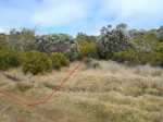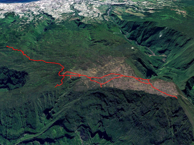 Notons enfin le fin trait noir qui part du point 1440 en direction de la rivière St Denis : le sentier en dents de scie est bien marqué et suit des barbelés jusqu'au bout ou presque. Des poisons anti rats tous les 20 m empêchent de se perdre...
