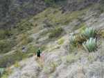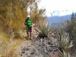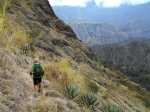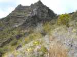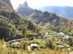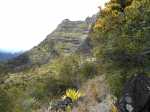 La randonnée débute au petit village de Peter Both reconnaissable aux deux pitons pointus qui le dominent (Photo 1). Sur la droite, le plus impressionnant est le Piton Papangues qu'un habitant du village a grimpé un jour pour y déposer un drapeau. Un coup d’œil sur la pointe permet de constater qu'il était sportif mais surtout intrépide. Sur la gauche, le Piton Fougères paraît plus insignifiant et a donné son nom à l'îlet situé entre les maisons et le piton. Cette courte randonnée emprunte une partie du sentier et de l'ancienne piste pour remonter vers l'Îlet Fougères. On passe tout d'abord devant la petite chapelle et sa vierge sur le parvis (Photo 2). L'endroit, très fleuri, offre de beaux points de vue sur le Dimitile (Photo 3). La remontée s'effectue tout d'abord sur la route avant de bifurquer à gauche sur un sentier avant le grand virage à droite. Seuls quelques filaos donnent une touche de vert au milieu de cette savane qui a remplacé les champs de l'époque (Photo 4). Plus on monte et plus le sol est aride autour de l'ancienne piste où peu de gens passent désormais (Photo 5). Une fois sur le bord du plateau, la vue sur le village et les pitons qui l'entourent est magnifique et l'on distingue même l'entrée du tunnel de Peter Both (Photo 6). Des bêlements et meuglements indiquent que l'îlet est toujours occupé par les bêtes même si aucune habitation ne subsiste. L'endroit est privé, inutile donc de pousser plus avant surtout que le sol est recouvert de galaberts très épineux. La descente s'effectue par le même itinéraire. Passer la chapelle et emprunter le Chemin des Vétivers en partant sur la gauche. Une bonne partie de ce sentier est goudronnée et bordée de cases ou de verdure (Photo 7). Plus haut, on retrouve l'ancien sentier très caillouteux qui redescend vers la route de Cilaos (Photo 8). En arrivant sur la route, repartir sur la gauche en direction du tunnel (Photo 9). Une centaine de mètres plus loin, dans le lacet, vers la gauche, débute le très ancien sentier, abandonné après l'éboulis et officiellement fermé par l'ONF. Il grimpe le long du rempart en longeant une ravine. Quelques hautes herbes ou cannes fourragères cherchent à envahir mais n'y sont pas encore parvenues depuis la fermeture (Photo 10). Les jouvences, en revanche, se plaisent de ce côté plus humide mais ne bouchent pas non plus le passage (Photo 11). L'eucalyptus qui donnait de l'ombre aux randonneurs n'a guère grossi mais il est beaucoup plus entouré de jouvences (Photo 12). Certaines portions montent assez fortement alors que d'autres sont plus plates et encore en bon état (Photo 14). Il faut moins de 15 minutes pour atteindre le col entre les deux pitons pointus. Le paysage change totalement et les panoramas impressionnants sur la vallée du Bras de Benjoin apparaissent. C'est la savane qui l'emporte en raison du sol pauvre et sec (Photo 15). Le sentier, même lorsqu'il est recouvert d'herbe jaune, est très visible. Quelques cailloux ont dévalé la pente ou les ravinements ont déposé un peu de terre mais le cheminement ne comporte aucun danger (Photo 16). Dans la descente si le Piton Papangues paraît plus petit, le Gros Morne de Gueule Rouge est toujours aussi impressionnant (Photo 17). La pente n'est jamais très forte et comporte de nombreux lacets (Photo 18). Les aloès semblent ne pas avoir grandi depuis une décennie. Ils perdent les feuilles du bas qui sèchent tandis que de nouvelles prennent la place sans grandir pour autant (Photo 19). Les lacets s'approchent parfois de vertigineux à-pics. On voit très bien le Bras de Benjoin 300 mètres plus bas ainsi que de courts tronçons du très vieux sentier passant par Cap Noir qui a subi d'importants éboulis (Photo 21). La végétation s'intensifie en fin de descente avec plus d'arbres que de savane (Photo 22). Il faut affronter une nouvelle série de lacets herbeux d'où l'on devine progressivement la vallée étroite du Bras de Benjoin (Photo 23). Le sentier est fermé depuis très longtemps mais l'on retrouve bientôt quelques panneaux de l'ONF tels qu'on les installait à l'époque, laissés là comme une invitation à la randonnée (Photo 24) ! A partir de ces panneaux, les filaos jaunissants se multiplient et le sol se recouvre de longues aiguilles glissantes (Photo 25). Puis ils verdissent, le sol devient alors pour la première fois sujet à plus d'attention. Les cailloux sont nombreux, parfois instables et toujours recouverts d'aiguilles (Photo 26). Par moments, on a même du mal à distinguer l'ancienne trace, on se prépare à abandonner mais le bruit de la chute du Cap Noir est si violent qu'un coup d’œil s'impose entre les branches des grands arbres (Photo 27). On est à moins de 100 mètres de la ruine du pont et l'on peut admirer la presque totalité de la cascade (Photo 28). Les éboulis sont devenus plus imposants et plus aucun vestige de l'ancien sentier ne subsiste. Il est alors plus prudent de faire demi-tour et de regagner Peter Both par le même itinéraire.