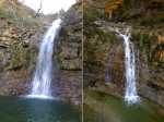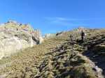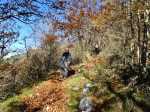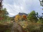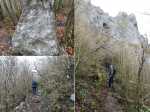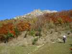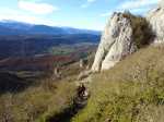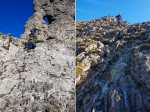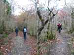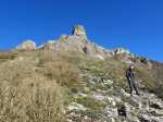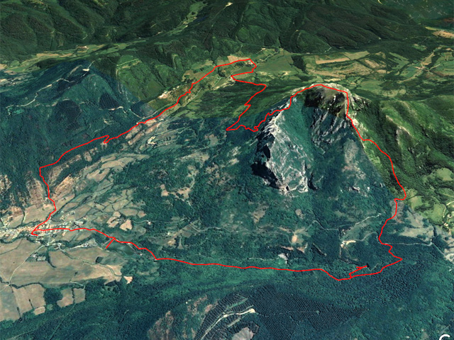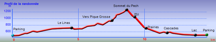 La randonnée débute en bordure du village où plusieurs emplacements permettent de stationner sans difficulté. Partir dans le village et suivre quelques rues étroites (Photo 1) avant d'entamer le sentier qui débute entre un talweg et un mur en pierre. Prendre à droite au premier embranchement et entamer une longue traversée en sous-bois. La montée vers le Col du Linas est faible et permet une agréable mise en jambes. La marche s'effectue principalement sous des hêtres, des chênes envahis le plus souvent de broussailles. Ne pas manquer, sur la gauche du sentier, les vieilles bâtisses abandonnées (Photo 2). Des murs de pierres sèches et certaines parties plates indiquent que la région fut sans doute cultivée avant l'envahissement par les forêts. Les maisonnettes sont accolées aux petites falaises calcaires qui les abritaient des intempéries. La deuxième est même construite entre deux barres rocheuses, économisant ainsi beaucoup de matériaux de construction. Plus haut, les bois diminuent, les brandes l'emportent et les prairies sont de plus en plus présentes. Le sentier passe entre des clôtures (Photo 3). Les premiers panoramas sur le Pech de Bugarach sont très agréables avec le lever du soleil. Le sentier se transforme en piste pour une promenade agréable le long des prairies occupées par les bovins et les chevaux (Photo 4). On se retrouve assez vite au petit hameau isolé du Linas qui est le point de départ pour les randonneurs ne désirant pas effectuer de boucle. Traverser le hameau puis partir en face sur une piste qui offre également de belles vues sur la face nord du Pech (Photo 5). En moins de 10 minutes, on atteint le panneau placé en début de montée. La pente d'abord faible s'intensifie doucement. La piste est très boueuse et glissante, on est alors tenté d'utiliser les petites sentes créées pour éviter la gadoue. Les buis deviennent de plus en plus présents jusqu'à représenter la seule essence végétale du lieu (Photo 6). Ils ont beaucoup souffert de l'invasion de la Pyrale du Buis (Cydalima perspectalis) et ont perdu toutes leurs feuilles. Le sentier se rétrécit, la pente ralentit la cadence tout en en accélérant le souffle (Photo 7). De petits promontoires permettent de bénéficier de beaux points de vue sur la montagne. On se retrouve au pied de la Pique Grosse constituée de dents rocheuses (Photo 8). Un sentier part sur la droite qui permet de les voir de plus près. Puis la montée reprend le long de nouvelles dents rocheuses en direction du sommet qui se trouve encore à 200 m de grimpette (Photo 9). Les panoramas portent jusqu'aux Pyrénées aux sommets enneigés une bonne partie de l'année (Photo 10). Le sentier serpente encore dans les buis avant d'arriver dans des zones dénudées et couvertes d'herbes rases (Photo 11). Le sommet s'atteint facilement pour profiter d'un 360° d'exception (voir film). La partie la plus technique débute avec la descente vers la vallée de la Planque qu'on distingue facilement (Photo 13). Avec du temps et de la patience, il est possible d'apercevoir des isards qui vivent en permanence sur les flancs escarpés de certains pics (Photo 12) ou vers la Pique Grosse (Photo 14). La pente, très forte par moments s'effectue sur un sentier caillouteux sur lequel les pieds glissent facilement (Photo 15). Cette descente est d'ailleurs déconseillée aux débutants et il est vrai qu'il vaut mieux être entraîné et ne pas avoir le vertige sur de courtes portions. On passe près du rocher caractéristique troué d'une grande lucarne ludique (Photo 17). La descente s'intensifie, il est préférable de poser les fesses au sol et de s'aider des mains (Photo 18). Cette désescalade au milieu des rochers dure près de 30 minutes avant de parvenir aux premières prairies (Photo 22). Bien refermer les portes dans les clôtures ! On traverse de nouveaux sous-bois jusqu'à la route de Bugarach par un sentier en pente régulière (Photo 23). Couper la route pour retrouver le sentier, juste en face, fermé lui aussi par une barrière. Il se transforme en piste après avoir franchi le gué de la Planque (Photo 25). Ne pas manquer le premier embranchement vers les cascades des Mathieux qui se rejoignent en deux minutes par un petit sentier (Photo 26). La première, sur la droite alimente un bassin entouré de hautes murailles coiffées de chênes en équilibre instable. La seconde, en aval se domine du regard. Elle remplit un bassin plus important dans un agréable cadre de verdure. Après avoir rejoint la piste, repartir à droite et marcher facilement sur un sentier agréable d'où l'on bénéficie de splendides panoramas sur la face ouest du Pech qui est la plus belle (Photo 27). Le parcours, nommé sentier Cathare, chemine sous les grands arbres et arrive sans difficulté au petit lac de la Vène, qui n'est rien d'autre qu'un étang entouré de roseaux. Cet endroit au calme offre également de belles vues sur la Pique Grosse (Photo 28). Le petit village de Bugarach est tout proche. En prenant la première rue à droite on peut visiter le minuscule cimetière, l'église Notre-Dame et quelques ruelles étroites avant de retrouver le véhicule.