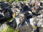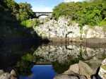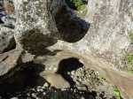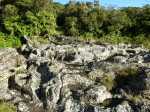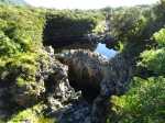 Randonnée plus sportive : C'est le même circuit que présenté ci-dessus mais qui comporte en plus une descente de la Ravine Sèche à partir du sentier bétonné du Bassin Cadet puis une autre à partir du radier. Ces écarts s'adressent aux curieux de la nature sauvage que représente le fond de cette ravine exceptionnelle mais dangereuse (Photo 10). Si la roche est sèche, marcher à l'instinct vers l'aval où l'on sera obligatoirement arrêté par le prochain cassé du bassin qu'on devine depuis le Bassin Cadet. Outre les magnifiques flaques piégées par des marmites en formation (Photo 12), on peut dégoter en cherchant un peu des fenêtres ressemblant à des hublots, creusés siècle après siècle par les galets charriés par les crues (Photo 11). Les plantes viennent parfois compléter le tableau en créant de belles natures mortes qui ne résisteront pas à une forte pluie (Photo 14). On trouve également quelques arches basaltiques créées par l'érosion, si fines parfois qu'elles ne résisteront pas non plus à des phénomènes météorologiques (Photo 15). Cette exploration peut prendre tout le temps nécessaire surtout qu'on ne quitte jamais le pont de vue (Photo 13).