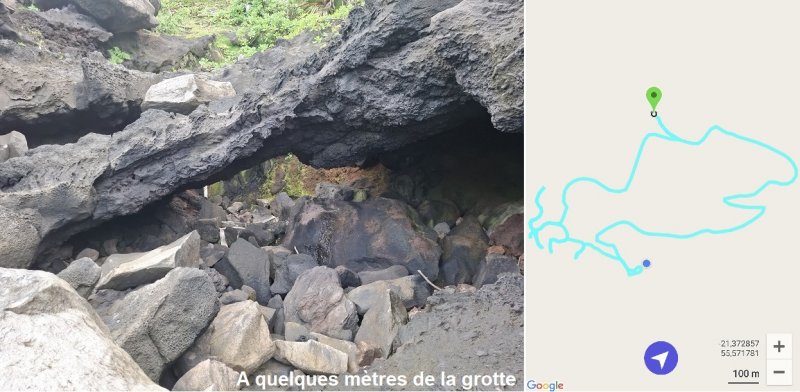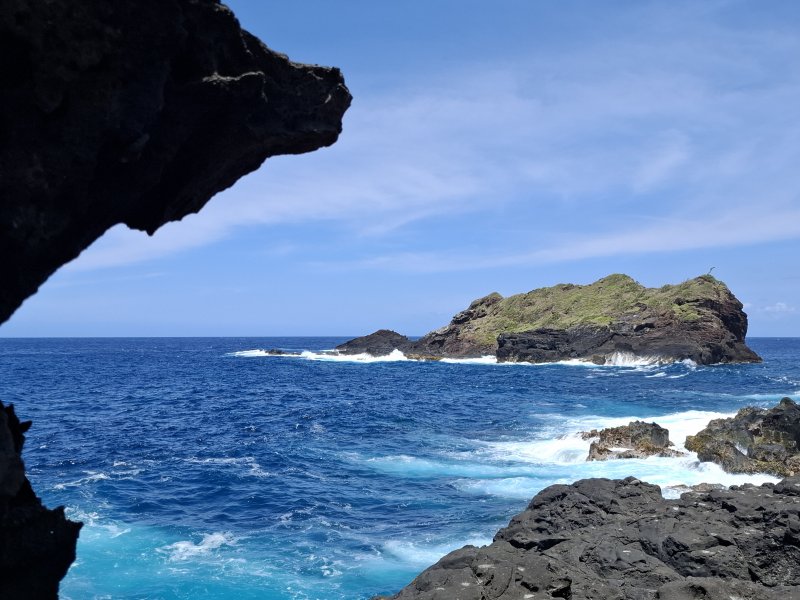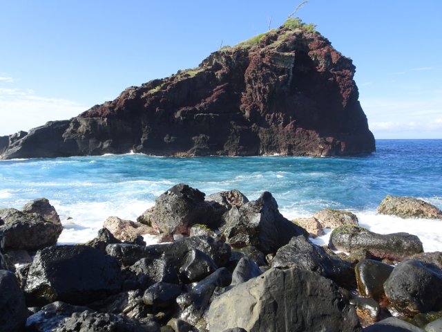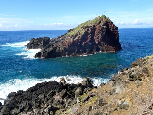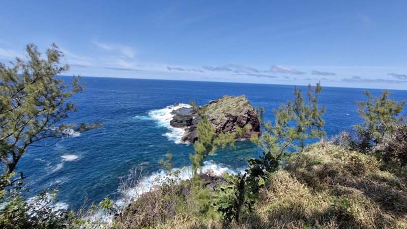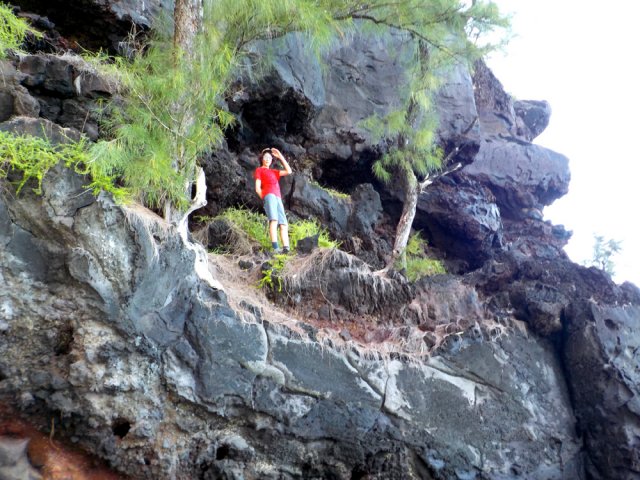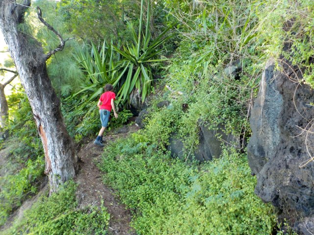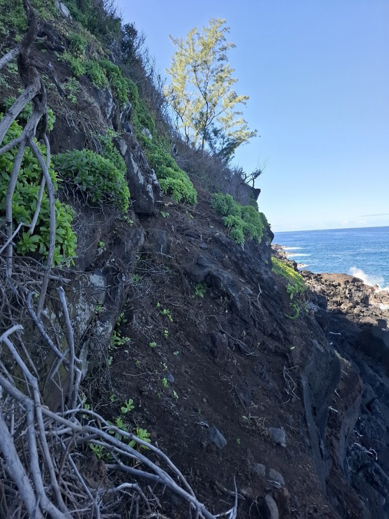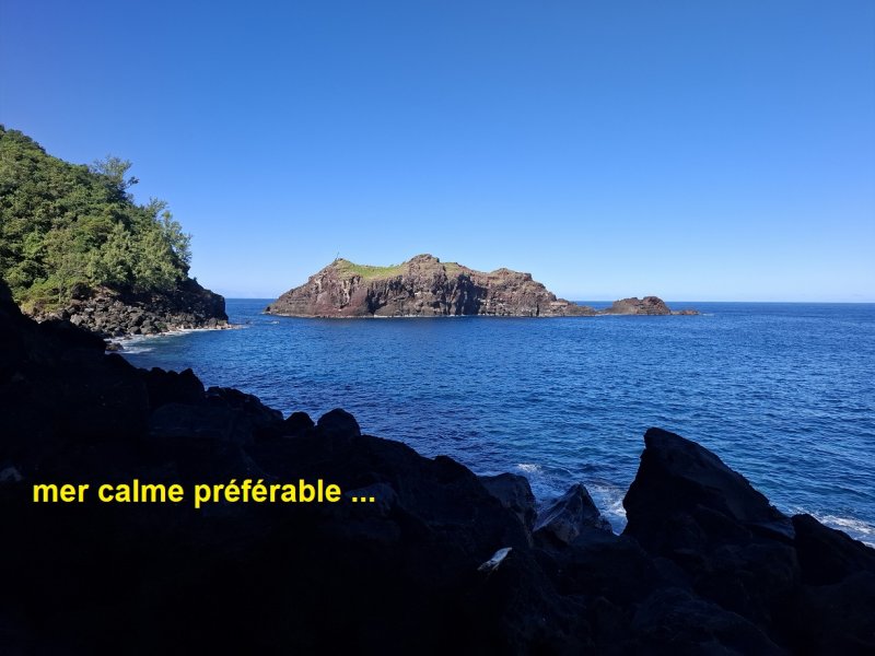 Randonnée sportive et plus aventureuse : Le point de départ se situe dans la descente avant un virage à gauche de la piste. La trouée, souvent à demi-bouchée par les herbes, est tout de même facile à trouver (Photo 4). Le sentier descend dans le bois puis plonge littéralement vers la mer pour une descente de 100 m. Il faut prendre son temps pour éviter branches, racines et pierres en travers (Photo 5). Le sentier se termine au gros filao et aux énormes rochers du littoral. Avant de partir vers les points de vue, il est possible de visiter la Ravine de Petite Île. Descendre les gros rochers en profitant des points de vue sur le Cap à Noël et le Piton de Grande Anse (Photo 6). La remontée de la ravine impose quelques petites escalades entre les énormes blocs (Photo 7). Le premier cassé rencontré se franchit aisément en choisissant les bonnes marches en basalte (Photo 8). Le second, moins haut, semble cependant difficile à passer (Photo 9G). Escalader les rochers en rive droite sous les arbres en prenant garde à la glissade. On parvient très vite à un 3ème cassé, très haut et moussu où du matériel est indispensable pour poursuivre vers l'amont (Photo 9D). Faire demi-tour et revenir au gros filao. Laisser le sentier pris en descente et partir à droite le long de la falaise verticale par endroits (Photo 10). On bénéficie alors des vues sur la façade ouest de l'îlot (Photo 11). Le plus dangereux à cet endroit est de glisser sur les déchets laissés par les pêcheurs ou de se prendre le pied dans les fils nylon coincés entre les roches ! Trouver le sentier qui remonte le long du rempart à partir d'un autre filao (Photo 11). Après une forte montée, on peut repartir à droite pour se rapprocher du bord. Plusieurs sentiers se rejoignent et peuvent prêter à confusion (Photo 13). L'un d'entre eux redescend de nouveau assez fortement en direction de la mer. Il n'y a pas d'arbuste pour se retenir et le cheminement doit s'effectuer prudemment (Photo 14). On se retrouve au point de vue sur la face nord (Photo 15). Avec prudence, il est possible de faire comme les pêcheurs et de se rapprocher du bord si les vagues ne sont pas trop fortes (Photo 16). Si les roches ne sont trop glissantes, chercher les différentes espèces de crabes, les oursins tortue ou les blennies sautant au moment où les vagues arrivent (Photo 17). En revenant et en prenant un autre sentier pour remonter, on est aidé par une longue corde qui facilite l'ascension (Photo 18). Quelques minutes plus tard, on passe au belvédère décrit au §1. Un sentier se remarque dans le bois. Même peu entretenue, on distingue très bien la trace nettoyée régulièrement par les pêcheurs (Photo 19). Seules les feuilles de pandanus peuvent griffer au passage. Repérer le croisement de trois petits sentiers discrets. Partir à droite pour se retrouver à nouveau face à une forte descente étroite souvent en corniche (Photo 20). Comme on s'est éloigné un peu, l'île paraît plus petite et montre sa face est (Photo 21). L'étroit sentier glissant passe près d'un rocher déchiqueté caractéristique doté d'une superbe cheminée gazeuse circulaire (Photo 22). Là également, si la mer est calme, on peut s'approcher du bord à la recherche de bassins et de la faune littorale. On traverse ainsi de magnifiques rochers usés par l'érosion, le vent et les vagues (Photo 23). On remarque une grotte dans la falaise entourée de verdure. Les saliettes (Psiadia retusa) et lavangères (Delosperma napiforme), toutes deux endémiques, semblent en protéger l'entrée (Photo 24). En prenant garde de ne piétiner aucune plante, on peut se rapprocher de la cavité pour un dernier point de vue original (Photo 25). Une trace discrète remonte à partir de la grotte mais il vaut mieux revenir sur ses pas, soit jusqu'au belvédère, soit en partant à droite au croisement aperçu en descente. Dans ce cas, après une nouvelle montée, on finira le long du champ de canne à sucre. Voir le §1 pour le retour au parking.