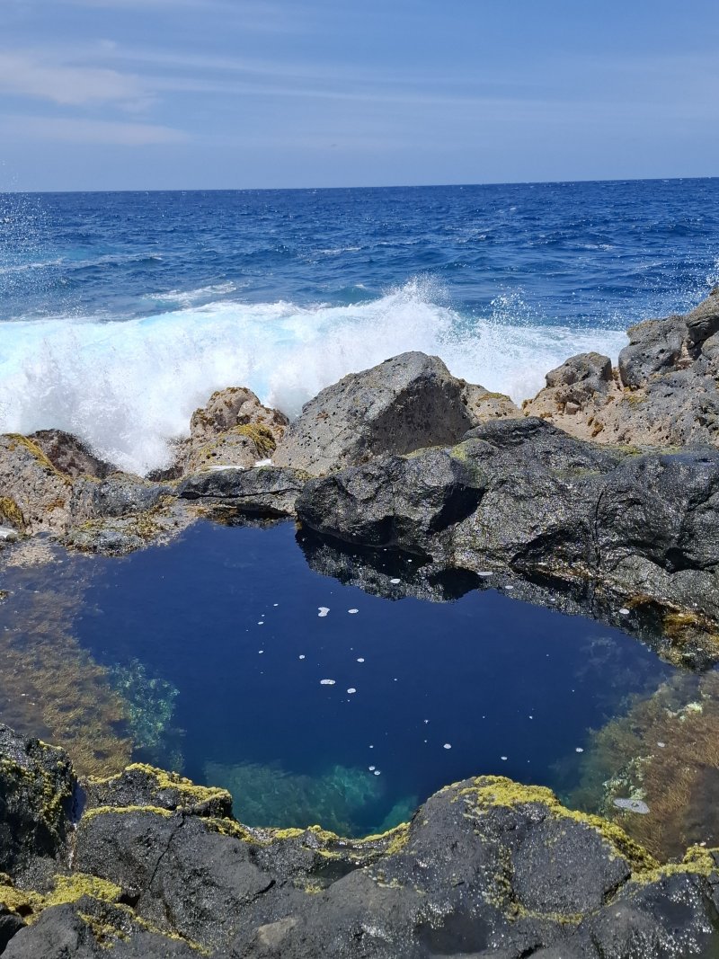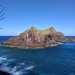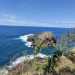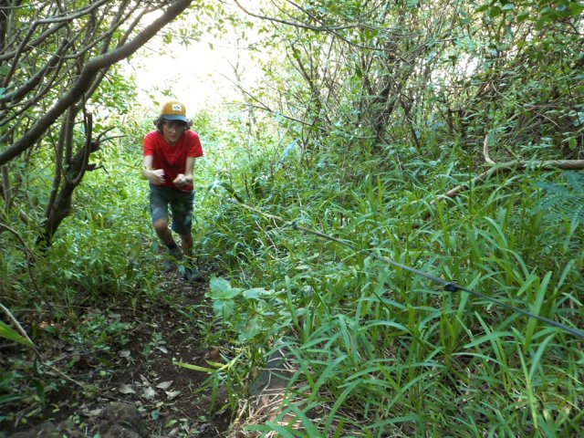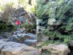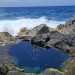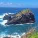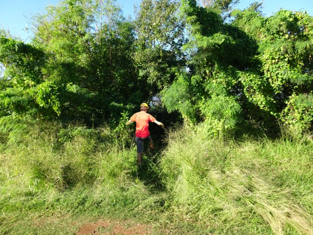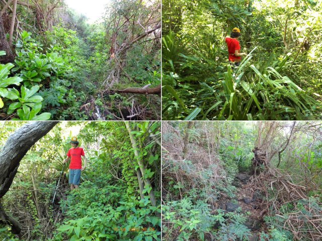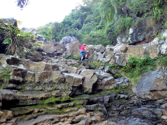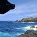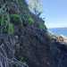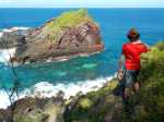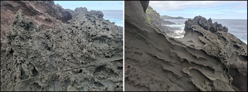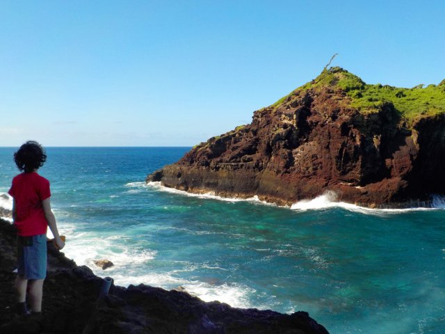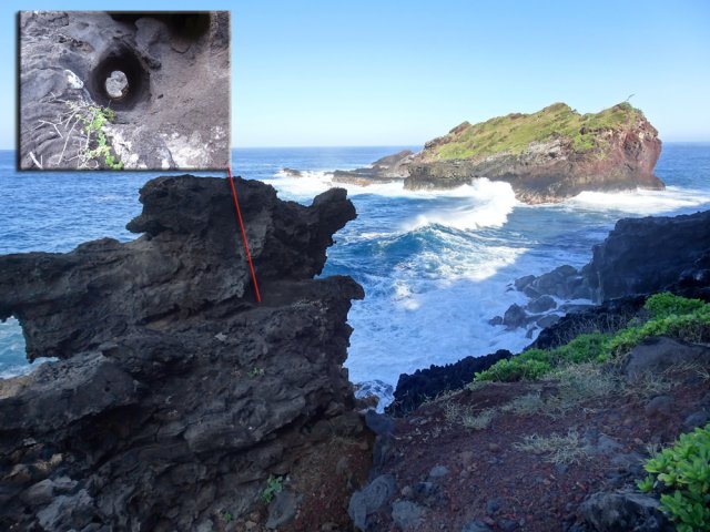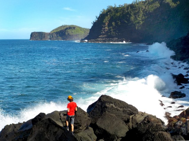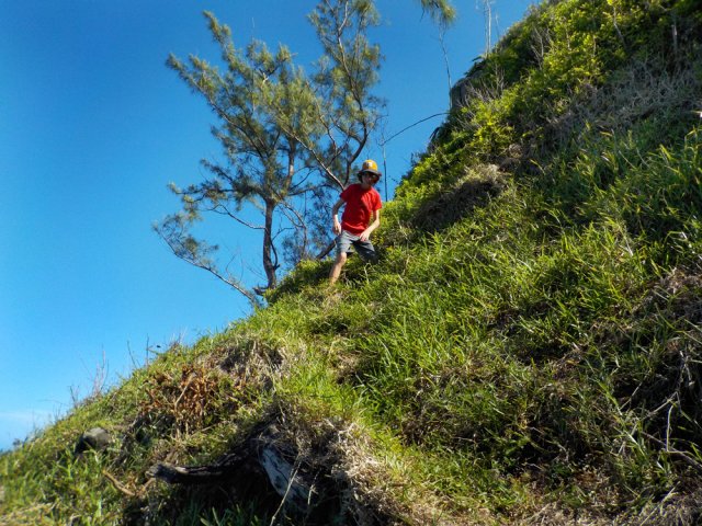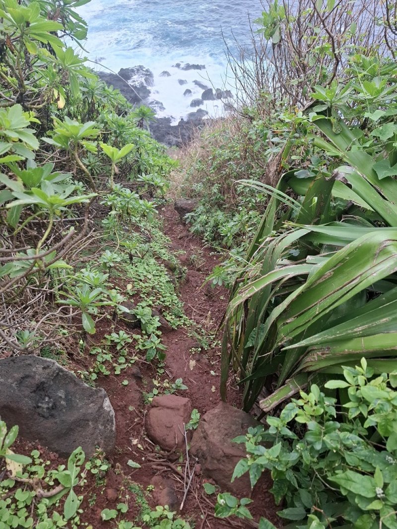 Randonnée sportive et plus aventureuse : Le point de départ se situe dans la descente avant un virage à gauche de la piste. La trouée, souvent à demi-bouchée par les herbes, est tout de même facile à trouver (Photo 4). Le sentier descend dans le bois puis plonge littéralement vers la mer pour une descente de 100 m. Il faut prendre son temps pour éviter branches, racines et pierres en travers (Photo 5). Le sentier se termine au gros filao et aux énormes rochers du littoral. Avant de partir vers les points de vue, il est possible de visiter la Ravine de Petite Île. Descendre les gros rochers en profitant des points de vue sur le Cap à Noël et le Piton de Grande Anse (Photo 6). La remontée de la ravine impose quelques petites escalades entre les énormes blocs (Photo 7). Le premier cassé rencontré se franchit aisément en choisissant les bonnes marches en basalte (Photo 8). Le second, moins haut, semble cependant difficile à passer (Photo 9G). Escalader les rochers en rive droite sous les arbres en prenant garde à la glissade. On parvient très vite à un 3ème cassé, très haut et moussu où du matériel est indispensable pour poursuivre vers l'amont (Photo 9D). Faire demi-tour et revenir au gros filao. Laisser le sentier pris en descente et partir à droite le long de la falaise verticale par endroits (Photo 10). On bénéficie alors des vues sur la façade ouest de l'îlot (Photo 11). Le plus dangereux à cet endroit est de glisser sur les déchets laissés par les pêcheurs ou de se prendre le pied dans les fils nylon coincés entre les roches ! Trouver le sentier qui remonte le long du rempart à partir d'un autre filao (Photo 11). Après une forte montée, on peut repartir à droite pour se rapprocher du bord. Plusieurs sentiers se rejoignent et peuvent prêter à confusion (Photo 13). L'un d'entre eux redescend de nouveau assez fortement en direction de la mer. Il n'y a pas d'arbuste pour se retenir et le cheminement doit s'effectuer prudemment (Photo 14). On se retrouve au point de vue sur la face nord (Photo 15). Avec prudence, il est possible de faire comme les pêcheurs et de se rapprocher du bord si les vagues ne sont pas trop fortes (Photo 16). Si les roches ne sont trop glissantes, chercher les différentes espèces de crabes, les oursins tortue ou les blennies sautant au moment où les vagues arrivent (Photo 17). En revenant et en prenant un autre sentier pour remonter, on est aidé par une longue corde qui facilite l'ascension (Photo 18). Quelques minutes plus tard, on passe au belvédère décrit au §1. Un sentier se remarque dans le bois. Même peu entretenue, on distingue très bien la trace nettoyée régulièrement par les pêcheurs (Photo 19). Seules les feuilles de pandanus peuvent griffer au passage. Repérer le croisement de trois petits sentiers discrets. Partir à droite pour se retrouver à nouveau face à une forte descente étroite souvent en corniche (Photo 20). Comme on s'est éloigné un peu, l'île paraît plus petite et montre sa face est (Photo 21). L'étroit sentier glissant passe près d'un rocher déchiqueté caractéristique doté d'une superbe cheminée gazeuse circulaire (Photo 22). Là également, si la mer est calme, on peut s'approcher du bord à la recherche de bassins et de la faune littorale. On traverse ainsi de magnifiques rochers usés par l'érosion, le vent et les vagues (Photo 23). On remarque une grotte dans la falaise entourée de verdure. Les saliettes (Psiadia retusa) et lavangères (Delosperma napiforme), toutes deux endémiques, semblent en protéger l'entrée (Photo 24). En prenant garde de ne piétiner aucune plante, on peut se rapprocher de la cavité pour un dernier point de vue original (Photo 25). Une trace discrète remonte à partir de la grotte mais il vaut mieux revenir sur ses pas, soit jusqu'au belvédère, soit en partant à droite au croisement aperçu en descente. Dans ce cas, après une nouvelle montée, on finira le long du champ de canne à sucre. Voir le §1 pour le retour au parking.