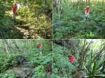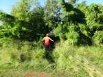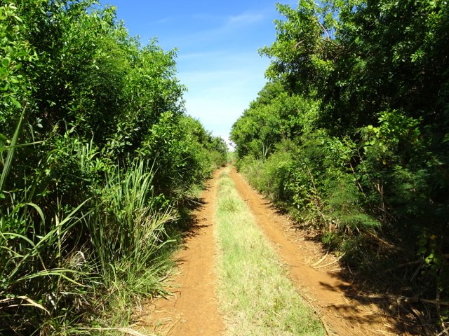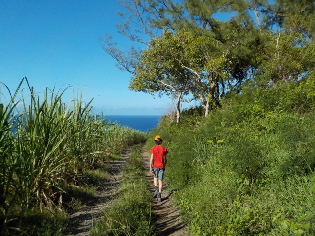 Randonnée familiale : Marcher vers Saint-Joseph jusqu'à la première piste partant sur la droite. On traverse tout d'abord quelques champs offrant de beaux points de vue sur l'océan (Photo 1). Après les maraîchages, on se retrouve à marcher le long des champs de canne et d'une petite forêt de filaos (Photo 2). Plus loin, ce sera le long de la profonde saignée de la Ravine de Petite Île. On aperçoit parfois quelques roches de la Petite île qui dépassent des filaos et, sur la droite, le Cap Auguste et le Piton de Grande Anse qui avancent dans la mer. La piste descend plus fortement pour parvenir à un endroit un peu plus large. Il faut partir sur la droite et marcher quelques mètres sous les filaos pour arriver au point de vue principal d'où l'on a un large panorama qui englobe tout le rocher (Photo 3). Il est possible après cette pause de revenir par le même chemin mais pourquoi ne pas partir de l'autre côté pour profiter de la nature sur une pente beaucoup plus faible entre poivriers et beaucoup de canne à sucre (Photo 26). Peu d'ombre durant cette remontée même lorsque la canne est haute ou lors de la traversée des fourrés de poivriers (Photo 27). Les pistes sont variées, usées par les pneus ou envahis par les plantes qui seront arrachées en période de coupe. Les 500 derniers mètres s'effectuent en montée régulière en longeant une grande bananeraie et se terminent au niveau de grands maraichages (Photo 28).