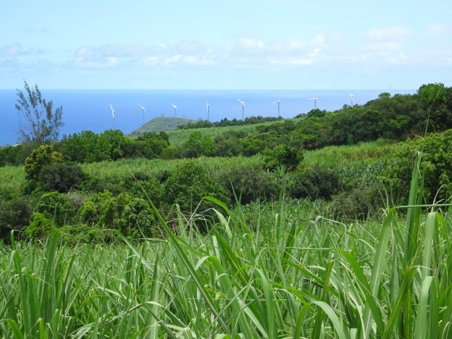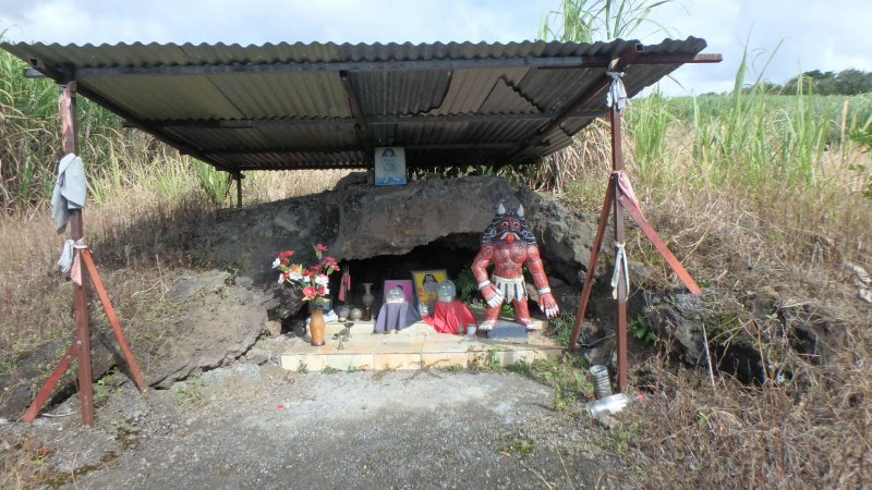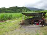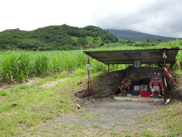 La randonnée débute à l'est de la canalisation venant des réservoirs de Sainte-Rose au deuxième croisement à partir du château d'eau. Une petite place de stationnement se trouve sur le bord de la route d'où l'on a déjà quelques points de vue sur la mer (Photo 1). Les panoramas sont plus larges en direction de Saint-Benoît (Photo 3). Le départ est en pente douce sur une route étroite filant en direction d'une habitation isolée (Photo 4). Très vite, on parvient au croisement d'où l'on surgira dans 90 minutes. Partir sur la gauche au milieu des cannes qui, coupées de juillet à décembre, permettent de meilleures vues sur la mer (Photo 5). Au deuxième lacet, on remarque le Piton Galets qui dépasse à 374 m. Il est recouvert de bois de couleurs d'où émergent deux filaos plus grands (Photo 6). La canne n'envahit pas tout car on passe parfois assez près de zones boisées qui bordent la Grande Ravine Glissante (Photo 7). Puis on s'approche de la petite colline, guère impressionnante quand on est tout proche (Photo 8). La descente continue, jamais forte sous quelques arbres procurant peu d'ombre ou d'autres colonisés par les tisserins (belliers à La Réunion ). Il y a si peu de circulation qu'ils vivent ici sans stress. Les nids au sol ne sont même pas écrasés (Photo 10). Une piste herbeuse part en direction du piton mais la carte montre qu'elle rejoindra plus bas la même route (Photo 11). En fin de descente, dans un virage à droite, repérer la ravine parallèle à la route. On peut rejoindre facilement le fond moussu occupé par un gros filao qui a su profiter des périodes humides où la ravine transporte de l'eau (Photo 13). La descente se poursuit encore avec quelques vues sur le village de la Ravine Glissante (Photo 14) ou la présence de quelques cases entourées de fruitiers (Photo 15). A quelques centaines de mètres de là, dans l'axe du Piton de Bellevue, on remarque les hélices des éoliennes qui tournent au vent (Photo 16). Une grande bananeraie vient faire mentir les propos ci-dessus sur la présence de la canne (Photo 18). Puis c'est une modeste chapelle qui a été installée à la sortie d'un très vieux tunnel de lave (Photo 19). Sans doute familiale, sa propreté indique qu'elle est certainement utilisée pour les prières (Photo 20). On parvient en fin de descente au croisement avec le Chemin Piton Galets qui file vers la nationale et Sainte-Rose. Prendre à droite et remonter immédiatement, bien sûr entre les cannes (Photo 22). Toujours ces champs à perte de vue avec la face est du piton qui apparaît derrière les champs (Photo 23). Hors période de coupe, le piton doit être plus difficile à distinguer (Photo 24). On retrouve quelques petites ravines mais qui sont plus difficiles à rejoindre que dans la descente. De lacets en lacets on s'approche du premier croisement. Il est alors rapide de rejoindre le point de départ avec des vues sur les hauteurs d'où l'on distingue très bien les citernes de l'usine hydroélectrique (Photo 26).