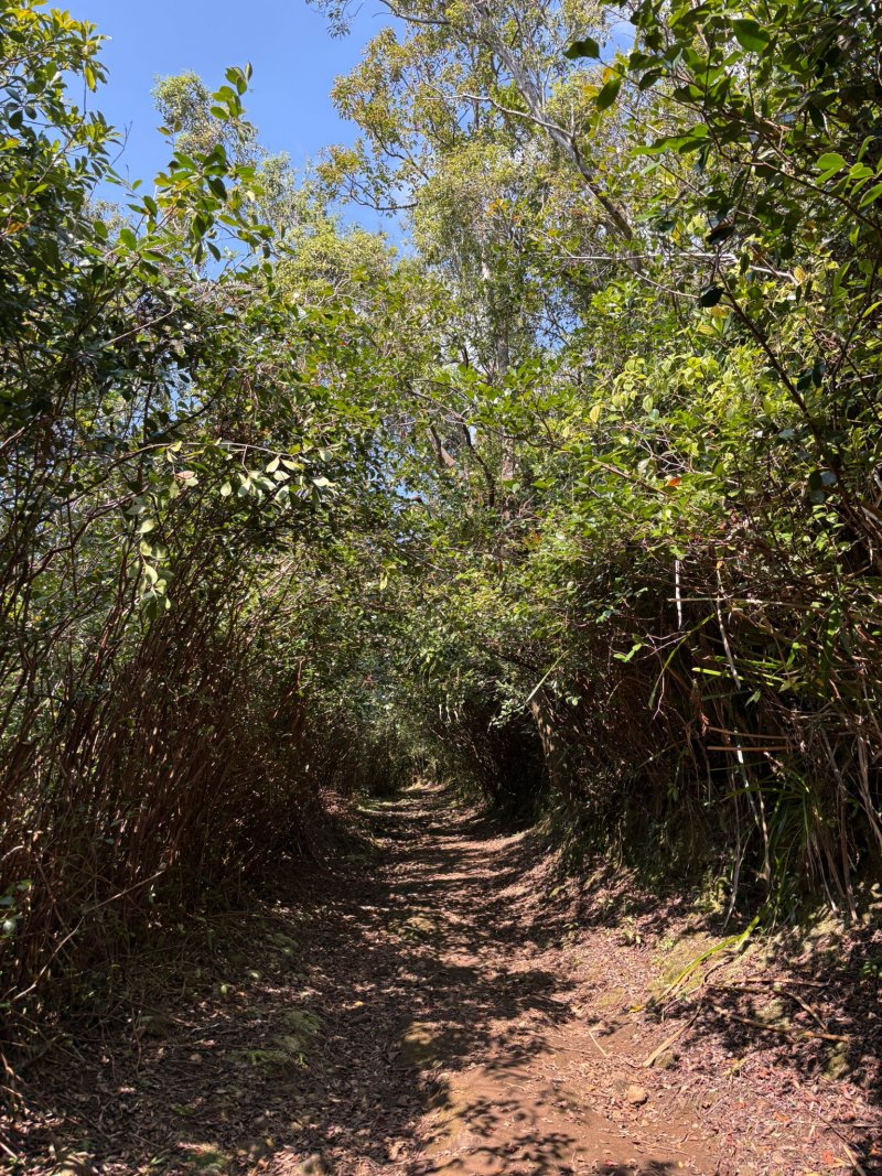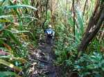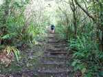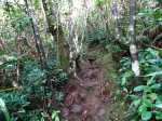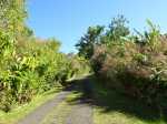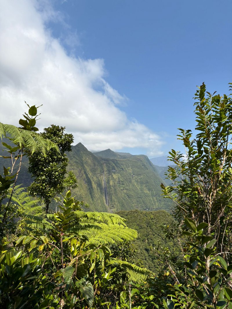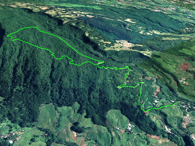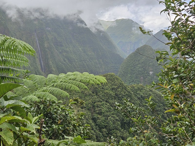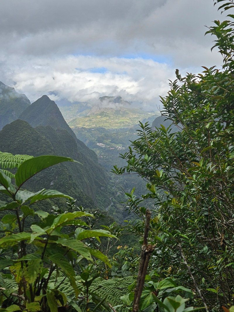La randonnée débute à l'aire de repos près du parking. Cependant il est conseillé d'effectuer la première montée par la piste bétonnée pour profiter des superbes paysages alentour (Photo 1). La piste constituée de deux bandes de roulement traverse une belle forêt de bois de couleurs et de grosses touffes de bambous balais (Photo 2). Cette mise en jambe de 700 m est un pur plaisir. Sinon, se lancer à partir du panneau qui donne d'intéressantes explications sur l'aire, la flore et la faune de la région (Photo 3). Tout près, une barrière empêche les véhicules d'abîmer la belle pelouse recouvrant la piste (Photo 4). Les seules traces proviennent des équipes d'entretien ou de reboisement dont on aperçoit les dernières plantations en bord de piste (Photo 5). Après une agréable montée en douceur, on parvient à un grand kiosque bordant une vaste clairière recouverte de pelouse (Photo 6). Cet espace est en même temps le départ et la fin de la boucle. Partir tout droit et entamer une montée plus forte qui donne le ton de l'effort pour la jonction avec le point de vue sur Salazie (Photo 7). Des panneaux sont régulièrement plantés sur le bord du sentier pour guider même si on ne peut pas s'égarer (Photo 8). Le sentier, toujours en pente, est surtout bordé de goyaviers qui chassent lentement mais sûrement tous les endémiques ou bois de couleurs de cette belle forêt (Photo 9). La montée est assez régulière mais comporte cependant quelques raidillons plus marqués qui coupent un peu le souffle (Photo 10). On longe parfois des petites ravines insignifiantes. D'autres, qui se rejoignent facilement, comportent bassins et petites chutes le plus souvent à sec (Photo 11). Les portions plates sont assez rares. Elles comportent le plus souvent des racines glissantes ou des parties boueuses (Photo 12). Les goyaviers ne cessent jamais mais les pailles sabres deviennent de plus en plus nombreuses (Photo 13). Des glissades sont possibles lorsque le sentier est taillé dans la terre et que les racines servent de marches (Photo 15). Les bois Noël prennent le dessus par endroits mais ce sont surtout les pandanus des hauts (pimpins) qui couvrent le sol à l'approche du dernier kiosque (Photo 16). S'il fait beau, l'effort est récompensé et l'on peut bénéficier de larges panoramas sur le Cirque de Salazie (Photo 17). Le regard porte jusqu'au Gros Morne et au Piton d'Anchain. On devine très bien la Cascade Blanche et plusieurs villages du cirque. Sur la droite, le regard porte jusqu'au Bé Massoune et au Piton de la Plaine des Fougères. Sur la gauche, ce sont le pic et le Morne des Lianes qui dépassent à l'horizon (Photo 18). Un kiosque attend au plus près du vide pour la pause casse-croûte avant d'entamer la descente par l'autre côté. On marche tout d'abord à plat dans les goyaviers qui ont refait leur apparition (Photo 19). Le sentier est étroit mais suffit amplement pour marcher à l'aise malgré la fréquence des plaques boueuses. Il arrive au bord de la vallée de la Ravine Sèche qui coule 100 mètres plus bas. Puis le sentier se met à descendre. Comme pour la montée, la pente est régulière mais comporte aussi quelques tronçons plus marqués où il faut prêter attention à ne pas glisser entre les racines (Photo 20). Sur la gauche, le vide est omniprésent mais bien protégé par une végétation touffue supprimant tout danger (Photo 21). Les premiers spécimens de bois de rempart font leur apparition. Plusieurs centenaires respectables sont implantés tout au bord du ravin mais tiennent bon. Leurs grosses branches sont parfois recouvertes d'épiphytes (Photo 22). Sur la gauche, de nombreuses petites barrières sont édifiées en fascines de goyaviers (Photo 23). Certaines ont mal vieilli ou sont très anciennes ; d'autres les ont remplacées pour quelques années (Photo 25). Après cette longue descente, le sentier oblique sur la droite et quitte le bord du ravin pour partir vers le sud. On retrouve les ambavilles, fougères et sabres (Photo 26). Il débouche de l'autre côté de l'aire couverte de pelouse qu'on a frôlée avant la montée (Photo 27). Traverser cette pelouse bien tondue et rejoindre le kiosque (Photo 28). Partir vers la gauche et retrouver la piste qui mène au parking du départ.