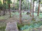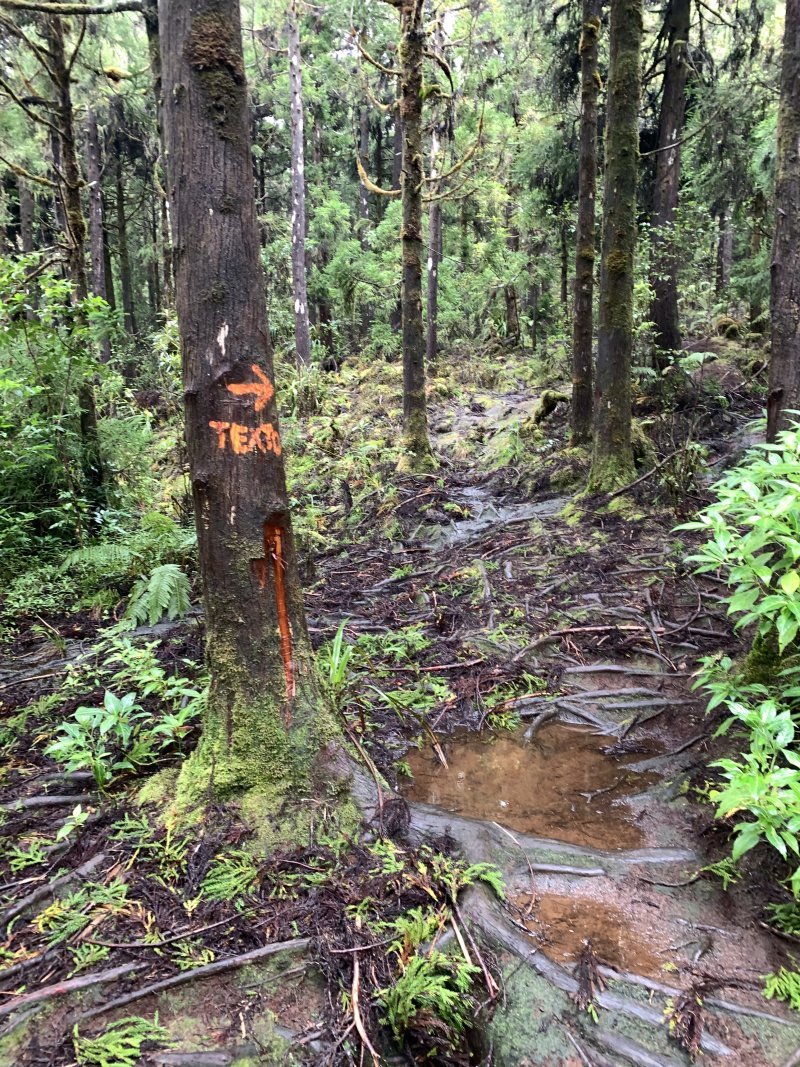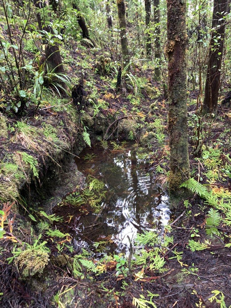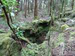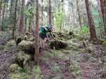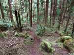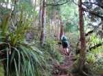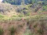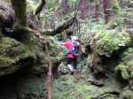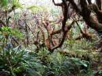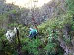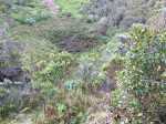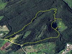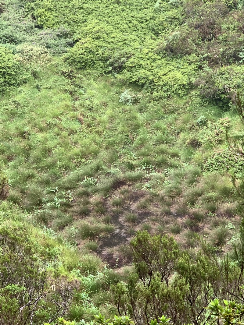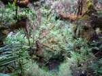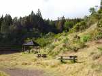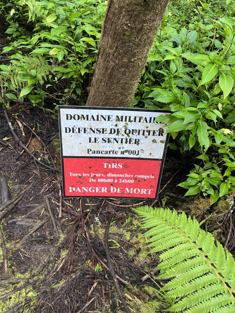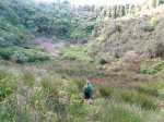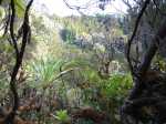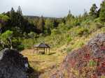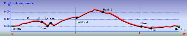 La randonnée débute au parking de l'aire de repos, proche des nombreux kiosques ou tables. Certains sont dans des clairières ensoleillées (Photo 1) tandis que d'autres permettent de profiter de l'ombre des grands cryptomerias (Photo 3). Plusieurs sentier débutent sous les conifères et se rejoignent pour former l'itinéraire qui remonte la pente jusqu'au Piton Textor. Comme toujours sous les cryptomerias, la marche s'effectue sur les racines qui servent de marches (Photo 4). La pente est raisonnable jusqu'au bord de cratère. Les flancs sont encore couverts des bois de couleurs originels tandis que l'autre côté est également couvert de cryptomerias (Photo 5). On repère très vite la petite sente qui descend vers le fond, au plus près du point de vue (Photo 6). On se retrouve dans les branles et de nombreux pieds d'azalées (Photo 7). On distingue très bien le fond humide couvert de joncs durant la courte mais sportive descente (Photo 8). La pente est forte et la glissade très facile ; il faut donc prendre son temps et les précautions habituelles pour dévaler sur l'herbe et dans les fougères (Photo 9). On se retrouve, moins de cinq minutes plus tard, dans les joncs sur un sol spongieux mais ferme (Photo 10). Sur le flanc qu'on vient de descendre, on remarque mieux les hortensias, azalées et chèvrefeuilles qui doivent recouvrir ce cratère de splendides couleurs en période chaude (Photo 11). La traversée est facile entre les touffes de joncs qui dépassent le mètre de hauteur (Photo 12). Les curieux tenteront une remontée par le flanc opposé en employant le fond d'une rigole dévorée par la végétation. La marche est malaisée mais on atteint assez vite une falaise moussue et suintante (Photo 13). Aucune trace ne permet d'entreprendre une traversée sans se griffer et la remontée au point de départ est recommandée. Reprendre donc la montée en direction du Textor sur les mêmes racines et sur une pente parfois assez forte (Photo 14). Plus haut, une trace grise sur la carte IGN indique un ancien passage mais il n'est plus guère utilisé. Si on part sur la droite, on se retrouve très rapidement sur le bord sud de ce même cratère. Ces 50 mètres permettent de se régaler du spectacle des branles moussus qui tapissent le rempart (Photo 15). Le sous-bois est inextricable mais offre quelques vues sur la pente descendue 15 minutes avant (Photo 16). ON peut, également, se balader en sous-bois vierge de toute invasive mais la pente est forte pour faire le tour du cratère. Faire encore demi-tour et rejoindre le sentier principal pour une nouvelle grimpette. Puis le sentier entreprend une descente vers une ravine au milieu des mâts et des fougères (Photo 17). Repérer, sur la droite du sentier, une vieille pancarte tordue indiquant la direction de la Plaine des Palmistes. Délaisser à cet endroit le sentier du Textor et partir sur la gauche sur un autre sentier bien marqué (Photo 18). Il longe jusqu'à l'arrivée la petite ravine en rive droite. La trace est impossible à perdre et quelques rubalises rassurent sur la direction (Photo 19). Sur la droite, une superbe tranchée couverte de mousse abrite un minuscule affluent de la ravine (Photo 20). Le sentier descend en effectuant de multiples virages pour éviter arbres ou roches (Photo 21). Quelques passage très pentus peuvent être glissants par temps humide (Photo 22). Un saut de cabri ludique est même nécessaire pour franchir le minuscule canyon. On se retrouve alors au plus près de la ravine dont on devine le fond une dizaine de mètres plus bas. Comme pour le cratère, les bords sont couverts de superbes branles mais gare à la chute si on s'approche trop près (Photo 23). Plus bas, on distingue très bien le fond de la ravine qu'il est possible de rejoindre en quelques secondes sans danger. La marche y est facile au milieu des pierres et rives moussues (Photo 24). On ne quittera plus guère cette superbe ravine sauvage jusqu'à la route (Photo 25). Le reste de la descente est toujours la même entre cryptomerias et rares fougères (Photo 26). En fin de descente, on remarque sur la droite une mare d'eau croupie sans doute plus belle lorsqu'elle est pleine et que les arums sont tous fleuris (Photo 27). Le sentier se termine à exactement 10 mètres du pont qui enjambe la ravine qu'on vient de suivre depuis le cratère (Photo 28). Partir sur la gauche et remonter une bonne centaine de mètres jusqu'aux premiers kiosques et au parking, fin de la boucle.