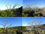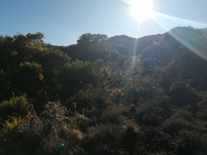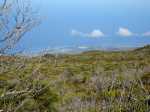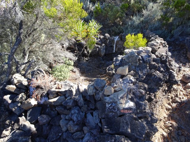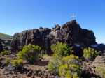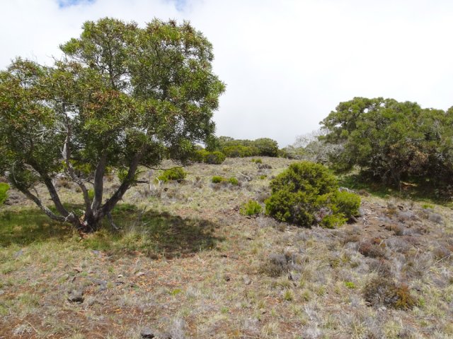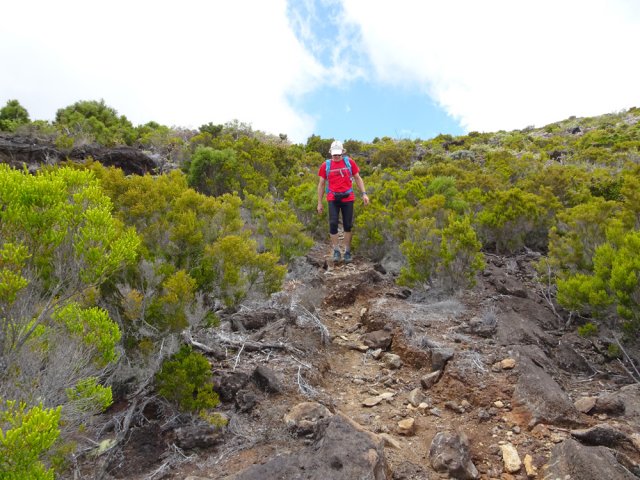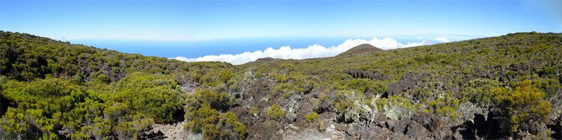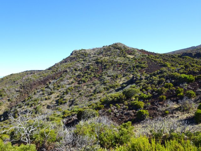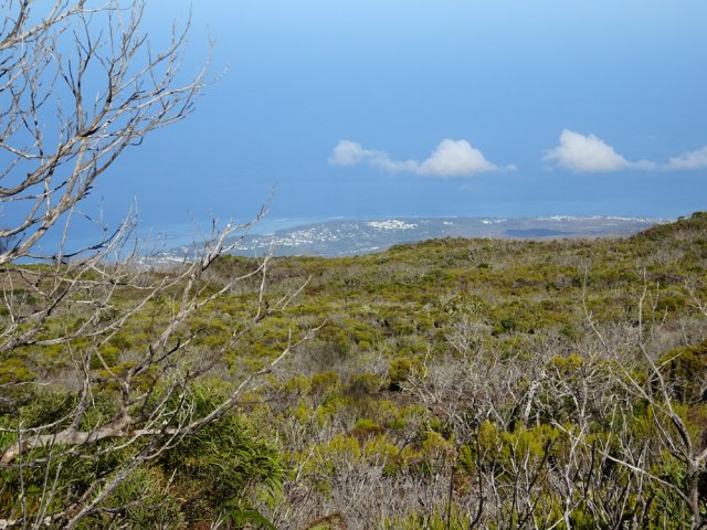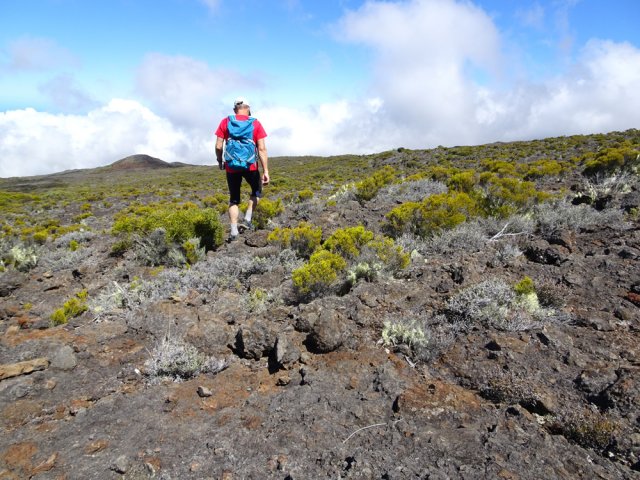 La randonnée familiale débute à quelques mètres du pont sur le Bras Sec. La montée débute par quelques marches proches de panneaux explicatifs de la vie du Roi Phaonce. Le sentier suit d'abord la Ligne du Bras Sec, une ancienne piste envahie par les acacias. La rosée du matin sur les herbes mouille les chaussures qui ne tarderont pas à sécher sur les parties en amont beaucoup plus sèches et arides (Photo 1). La montée est régulière entre branles verts, ambavilles et vestiges d'anciens incendies (Photo 2). Certains tamarins réduits à l'état de squelettes méritent quelques haltes (Photo 3). Plus on monte et plus la côte laisse voir ses villes littorales et ses lagons (Photo 4). On s'approche de plus en plus de la vallée de la Ravine de la Chaloupe aux flancs recouverts d'une végétation plus luxuriante qu'autour du sentier (Photo 5). Le Piton Rouge, que l'on a sous les yeux depuis le départ, grandit à vue d’œil (Photo 7). Au pied, des sentiers partent dans plusieurs directions. Avant d'en emprunter un pour poursuivre, chercher sur la droite un petit sentier marqué par un piquet esseulé. L'emprunter jusqu'à la Caverne du Piton Rouge cachée par quelques tamarins qui créent un endroit charmant (Photo 8). L'endroit, ombragé, est idéal pour la première pause. Reprendre le sentier et décider de monter au sommet ou, comme ici, le faire au retour car les nuages envahissent vite le cirque de Cilaos. La montée qui suit est assez difficile en raison des nombreuses pierres ou gros blocs de lave qui imposent de lever le pied. L'effort est court jusqu'au pied du dykeEn résumé, un dyke est un filon de roche dure qui a été injecté dans une fissure du sol existant lors d'une éruption. L'érosion a ôté les roches originelles, laissant apparaître le mur de roches plus jeunes. impossible à manquer avec sa petite croix blanche cimentée au sommet (Photo 9). A partir du Piton Rouge, le sentier est principalement constitué de laves où le pied accroche facilement, rendant la marche rapide et facile (Photo 10). Le sentier file plein sud en direction du rempart. On passe bientôt devant un amoncellement de pierres comportant quelques gris-gris vieillissants, donnant à penser qu'on se retrouve devant une tombe. Le sol étant constitué de lave dure, il y a fort à parier que jamais personne ne fut enterré ici. L'ensemble, de par sa taille, fait surtout penser à la murette d'un ajoupaCabanes faites de pieux et recouvertes de branches ou feuilles. En général, le bas était ceint d'un petit muret en pierre.. Un peu plus loin, un panneau de l'ONF indique la caverne du Roi Phaonce alors que la carte la situe un peu plus loin. De toute manière, le "royaume" de l'esclave en fuite devant couvrir toute la planèze jusqu'au Grand Bénare, les quatre cavernes rencontrées lui étaient certainement connues (Photo 12), tout comme celles aperçues en fond de ravines. On est au plus près de la Ravine de la Fontaine qu'il faut même traverser avant de poursuivre (Photo 13). On frôle la troisième caverne, indiquée sur la carte IGN et le sentier poursuit sa descente au sud avant de remonter vers le rempart de Cilaos. La dernière caverne, un tunnel de lave bouché, sert d'oratoire. Le sentier devient plat et l'on devine à l'horizon le Gros Morne qui dépasse de la verdure (Photo 14). Le spectacle de ce cirque, que les nuages commencent à recouvrir, est saisissant (Photo 15). On devine tout de même l'Îlet à Cordes au pied et Cilaos un peu plus loin. Faire demi-tour par le même itinéraire en ne manquant pas d'escalader le Piton Rouge au passage.