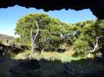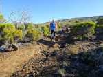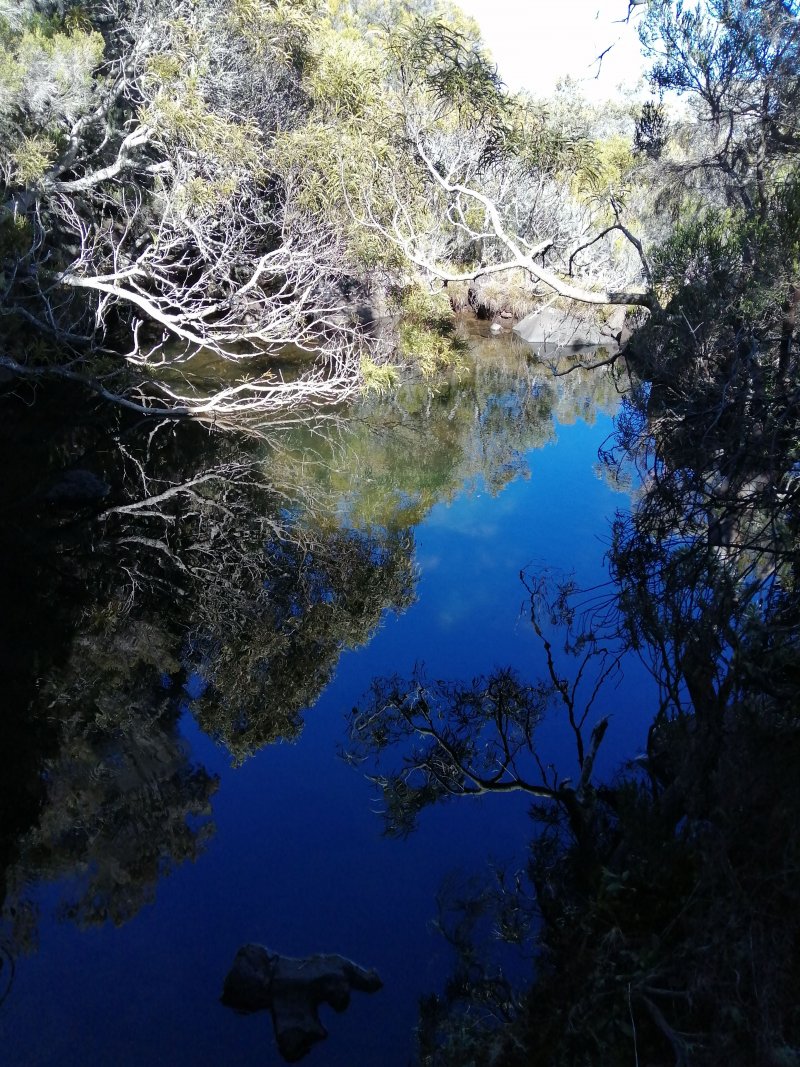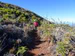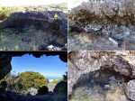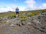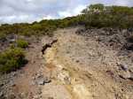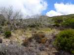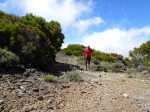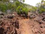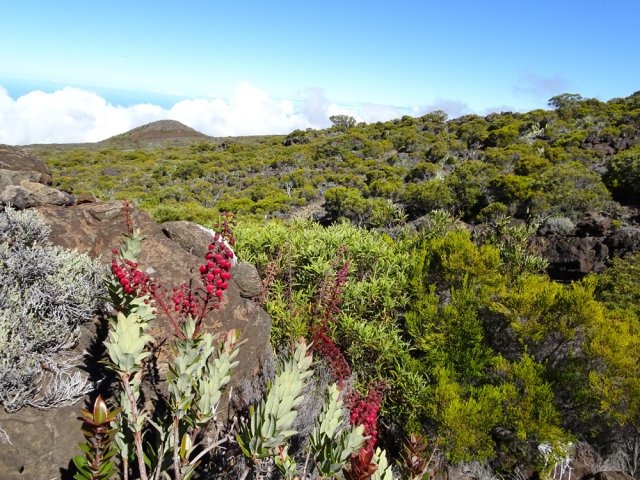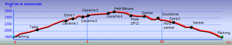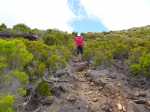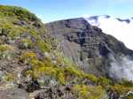 Randonnée plus aventureuse : Partir le long du rempart sur un sentier agréable comportant quelques marches hautes sur des blocs. Passer près du sommet invisible du Petit Bénare, bien repéré par un poteau de l'ONF. Admirer les précipices impressionnants tout en évitant de trop s'approcher du bord très fissuré par endroits (Photo 16). Plus haut, on arrive en rive gauche de la Ravine de la Fontaine. Le sentier part à gauche et escalade les rochers de la rive droite. Aussitôt sur le terrain plat, partir à gauche puis prendre le Piton Rouge comme repère s'il n'y a pas de nuages (Photo 17). La traversée n'a rien d'aventureux. Il suffit de marcher en direction du Piton rouge en cherchant toujours le terrain le plus agréable et le moins touffu (Photo 18). On distingue, plus bas, la piste DFCI qu'il est facile de rejoindre en rive droite de la ravine. Partir sur la droite et suivre cette piste défoncée par endroits (Photo 19). On peut s'étonner de la construction de telles pistes aussitôt après les incendies et très peu entretenues jusqu'au prochain !! En général, la piste est propre et facile (Photo 20). Les bouses de vaches qui la fument montrent qu'on peut facilement y rencontrer quelques bêtes. Plus loin, la piste rencontre le sentier de la Glacière. Partir à gauche sur quelques mètres, entamer un nouveau hors sentier, toujours aussi facile, avec le piton en point de mire. Grimper au sommet du Piton Rouge pour profiter du point de vue à 360° et poursuivre plein ouest jusqu'aux sculptures de Gilbert Clain (Photo 21). De là, avant de descendre, repérer au sud la barre rocheuse qui dépasse dans la végétation. Reprendre la descente par l'autre sentier qu'on quitte aussitôt pour un troisième hors sentier un peu plus vertical et glissant que les deux premiers. On se retrouve au plus près de ce nouveau dyke d'une quinzaine de mètres de hauteur (Photo 22). Le monolithe mérite le déplacement avant de partir vers le sentier du Piton Rouge à travers une végétation facile à traverser sans se griffer. Entamer la descente sur le sentier pris en montée, creusé parfois par les multiples passages (Photo 23). Deux cents mètres plus loin, ralentir le pas et repérer un croisement de sentiers. Celui de gauche, très discret, est tout de même facile à suivre des yeux. Plus on descend vers la Ravine de la Fontaine, plus il est marqué par endroits (Photo 24). Ne pas hésiter à le délaisser pour aller au bord du rempart repérer bassins, cassés verticaux, grottes d'effondrement ou amoncellements de rochers (Photo 25). Certains endroits sont accessibles, avec prudence et sans trop de danger, pour une baignade rafraichissante. La descente se poursuit sur ce sentier bien marqué qui peut disparaître par endroits si les bovins l'ont trop piétiné (Photo 26). Plus bas, le terrain s'aplanit et l'on traverse de véritables prairies d'altitude où de nouvelles bouses indiquent que l'herbe y est bonne (Photo 27). Très difficile alors de suivre une trace précise mais l'instinct (ou la trace GPS) a vite fait de désigner le prochain passage. On entend des voix à quelques dizaines de mètres et l'on devine que l'on marche en direction du sentier officiel. Ce parcours rejoint le sentier aux alentours d'une table de pique-nique aperçue en montant. Un sentier partant sur la gauche pousse à une nouvelle aventure, sans danger de s'égarer puisque le trajet est encadré par une ravine à gauche et le sentier du Piton Rouge. Une fois sur le sentier officiel du Piton Rouge, la descente est de tout repos jusqu'à la RF des Tamarins.
