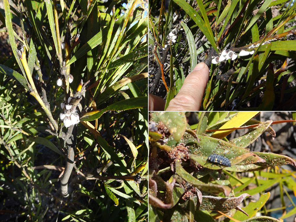 Après les psylles, ces minuscules cigales qui ont infecté les tamarins des hauts, les laissant dépérir dans la région du Maïdo, on remarque, tout au long de cette boucle une autre invasion qui pourrait peut-être devenir inquiétante. Le long du sentier ou lors des quatre hors sentiers proposés ici, on remarque ça et là des tamarins envahis de cochenilles dont la taille et le nombre peuvent impressionner. On voit très bien que les feuilles s’affaiblissent avant de tomber sans compter sur la fumagine collante et visqueuse qui recouvre les branches. Heureusement, en fouinant près des arbustes noircis mais ne comportant plus de cochenilles, on remarque de grosses larves de coccinelles à sept points qui tournent dans tous les sens à la recherche d'une nourriture encore vivante. Attention de ne pas gêner cette belle petite larve qui marche très vite.