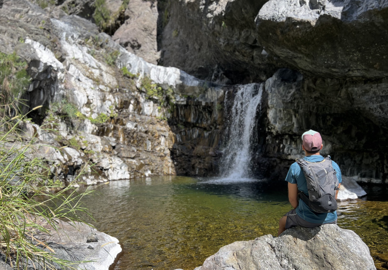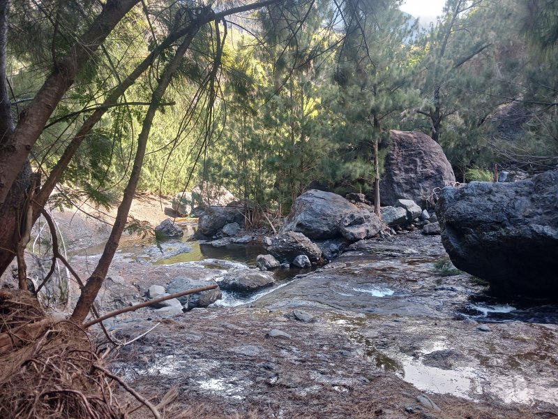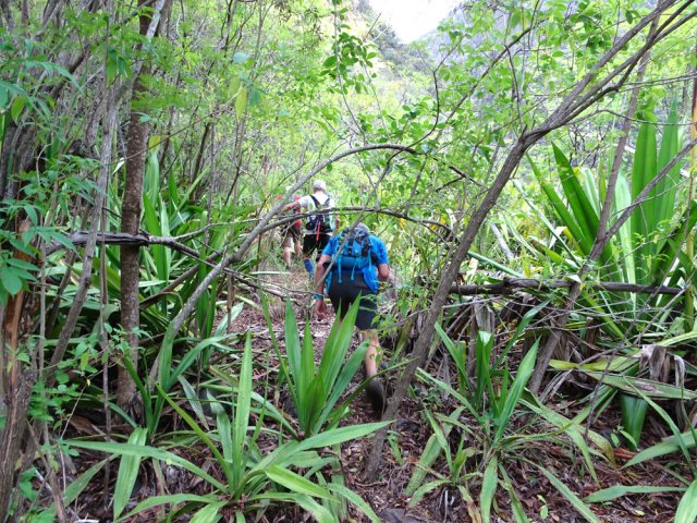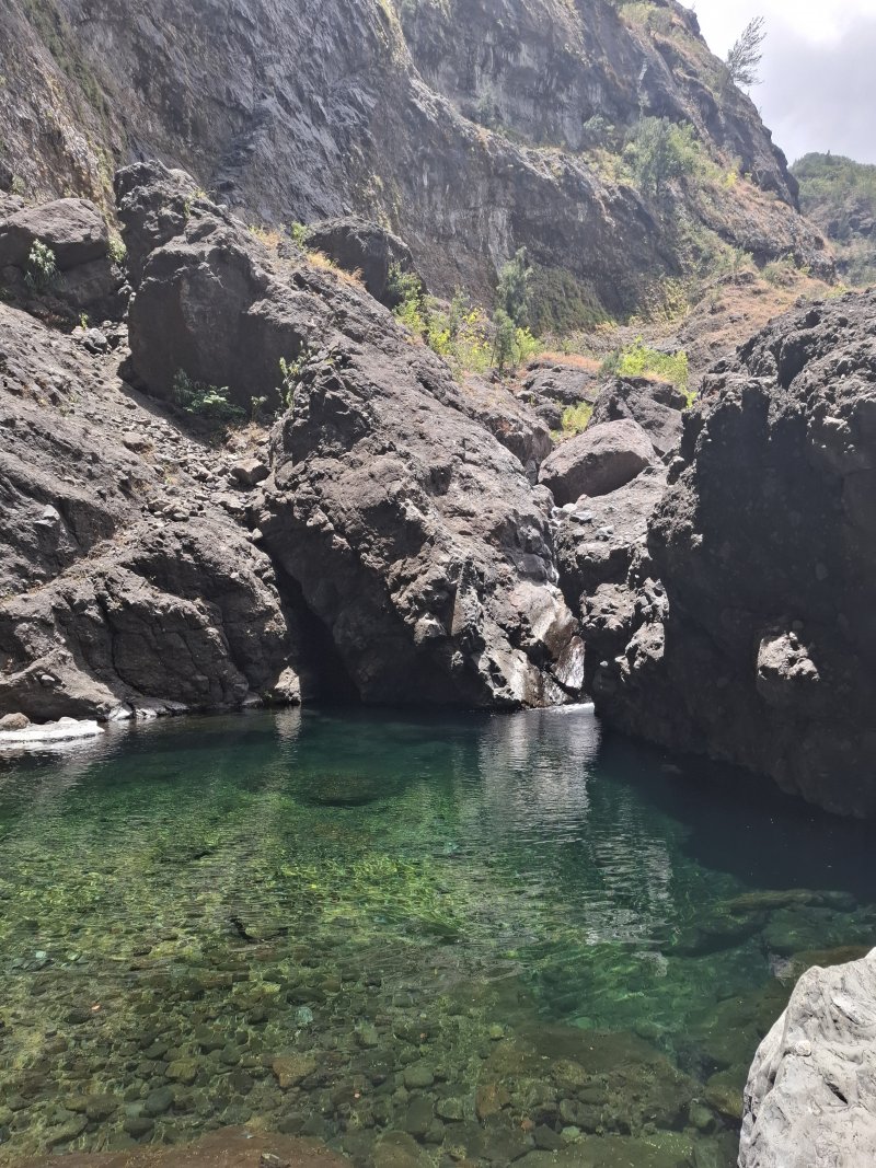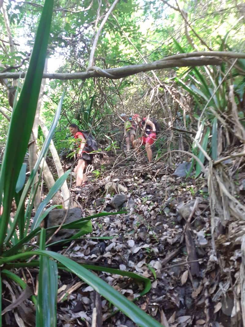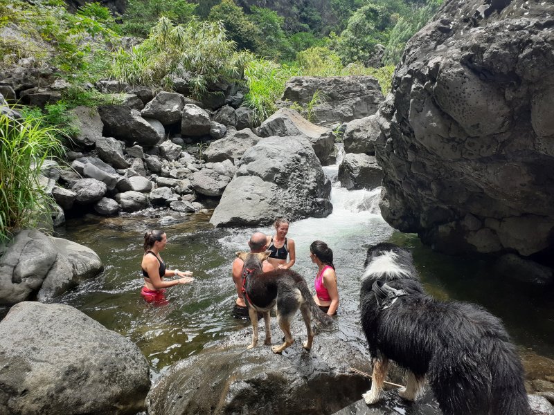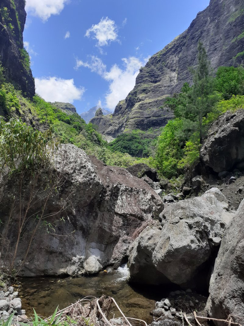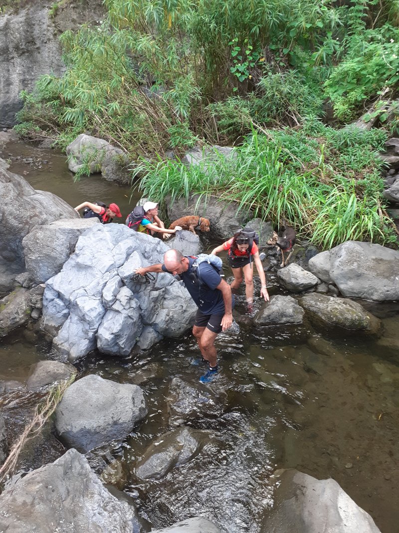Pour la parution de la 600ème randonnée du site, pas question de faire trop facile ou décontracté, au moins pour en garder des souvenirs durables. Les idées ne manquent pas pour de nouvelles fiches et c'est notre ami Ousarsiph2 qui nous a proposé de remonter le Bras d'Oussy pour une randonnée semi aquatique. Reconnue en 2017 par l'intéressé, le cours d'eau de l'époque, bien nettoyé par le dernier cyclone, représentait effectivement une agréable remontée de bassins en cascades. Le manque de phénomènes météorologiques violents depuis quelques années a favorisé la repousse de bois de chapelets, filaos mais surtout des hautes et solides cannes fourragères qui bouchent les passages plats et coupent facilement peau et tissus si on les agresse. Autant dire que cette sortie est réservée aux amateurs inconditionnels de ce genre de sport d'aventure. Après le passage d'un prochain cyclone, ce sera certainement une randonnée à classer dans moyenne en difficulté. Pour le moment elle mérite bien le "très difficile" du cartouche ci-dessus et ne devra être tentée que par des habitués. La première partie utilise des sentiers classiques pour se rendre dans le cirque. La descente vers le torrent est sportive mais pas impossible. La remontée du bras est un festival de magnifiques paysages sauvages, d'empilements de rochers énormes, de falaises abruptes, de bassins, chutes d'eau mais attention, également de pierres tombées des falaises friables. Les camps bracos et amoncellements de canettes de bière indiquent que, faute de randonneurs, le coin est tout de même visité. Un tiers de la remontée s'effectue sur les rives envahies, un tiers dans l'eau et un tiers à escalader de grosses roches tombées des sommets depuis bien longtemps. Les renseignements de la fiche sous formes de cartouches ou d’icônes doivent être correctement interprétés car on ne se lance jamais dans une randonnée de 11 kilomètres en 9 heures sans être vraiment entraîné.