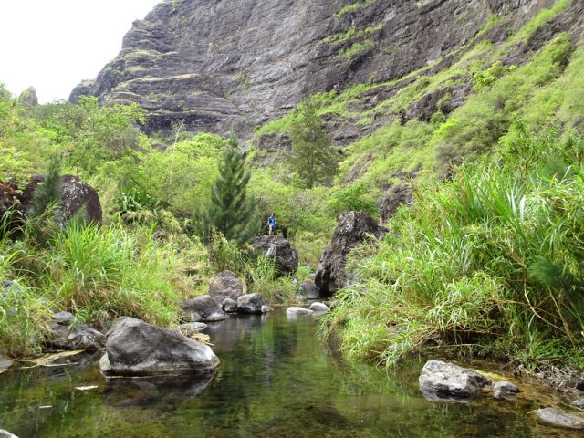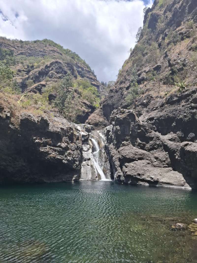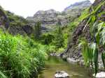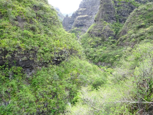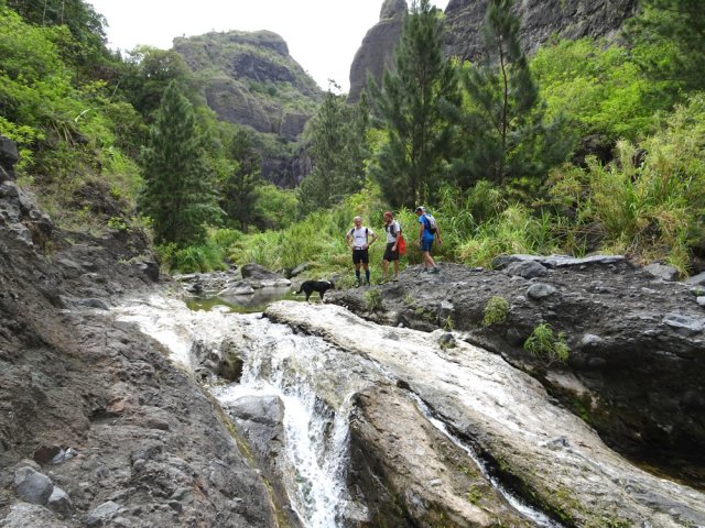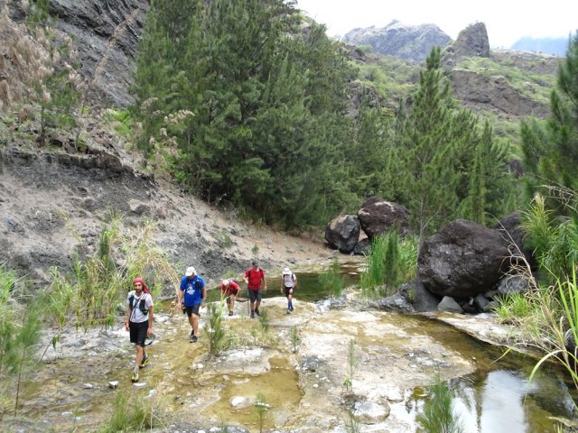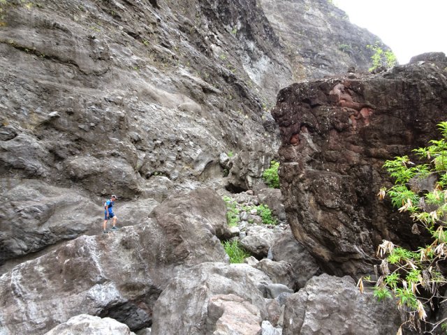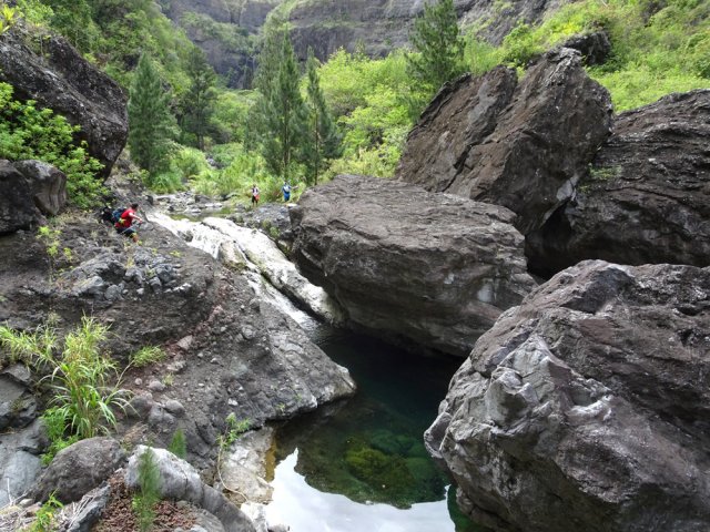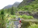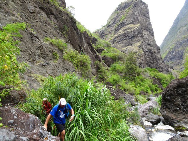 La randonnée débute au grand parking des hélicoptères de Deux Bras. La meilleure façon de s'y rendre est de prendre le 4x4 à la Rivière des Galets car la journée sera assez sportive sans y rajouter la jonction à pied, même venant de Dos d'Ane. Le sentier, large et de bonne qualité longe la rivière ou la traverse par des gués très bien aménagés de grosses pierres (Photo 1). On parvient rapidement et facilement à la Porte après avoir franchi une demi-douzaine de ces gués. A la Porte, reconnaissable à l'ouvrage béton situé dans la falaise en rive gauche, délaisser le sentier longeant la rivière et obliquer à gauche pour entamer une forte montée caillouteuse ou sur des marches en pierre (Photo 2). Le sentier s'assagit sur le haut des falaises longeant la rivière (Photo 3) avant de repartir en montée. Poursuivre vers la Passerelle du Bras d'Oussy par quelques dents de scie permettant d'échauffer les muscles. On laisse un premier embranchement vers Bord Bazar, puis un deuxième à l'approche de la passerelle qu'on distingue déjà, tout comme le barrage sur la Rivière des Galets (Photo 4). Ne pas manquer, avant de descendre vers le torrent, de rejoindre la passerelle pour admirer les bassins 50 mètres plus bas ou, mieux, la vallée vers l'amont que l'on remontera durant plus de trois heures avant de faire demi-tour (Photo 5). Pour trouver le sentier qui va littéralement plonger vers les bassins, faire demi-tour vers Deux Bras et repérer une fenêtre sur la gauche donnant un beau point de vue sur l'aval de la Rivière des Galets. En face, entre arbustes et chocas, on devine une trace à peine visible (Photo 6). S'engager sans hésiter, d'autant qu'il y a peu d'autres possibilités pour cette descente très abrupte. Après avoir rejoint un pied de jamblon, vert et un arbre couché par le vent, entamer la descente sur un sentier assez facile à suivre des yeux mais beaucoup plus délicat pour la marche. La pente, comme on a pu le voir de la passerelle, est très forte et le corps a tendance à être attiré vers le bas. Les pieds du marcheur sont souvent à la hauteur de la tête de celui qui précède (Photo 7). Les arbres sont très utiles pour freiner la descente qui s'effectue cependant sans danger. On se retrouve au bas du canyon vu depuis l'ouvrage qui domine et sur lequel on aperçoit des randonneurs nous observer dans cette vallée verdoyante. Le canyon est de toute beauté avec de petits bassins reliés par des toboggans (Photo 8). Il est également impressionnant de par son étroitesse (Photo 9). A partir de ce canyon, les explications deviennent inutiles car elles peuvent changer en fonction de la saison, de l'état de la végétation ou des préférences de marche de chacun. Une bonne partie, au départ, s'effectue en rive droite où l'on retrouve quelques traces de passages. Quand on se retrouve face à des murs infranchissables de végétation ou de roches, traverser simplement la rivière pour trouver en face un meilleur passage (Photo 10). Dès que possible, privilégier les rives pour gagner en vitesse (Photo 11). La marche est fatigante mais les paysages verdoyants et aquatiques sont le plus souvent agréables (Photo 12). Prendre garde aux roches et galets mouillés qui sont souvent glissants (Photo 13). Le minéral l'emporte parfois sur le végétal et l'on rencontre de plus en plus d'énormes rochers et des bassins profonds qu'il faut éviter (Photo 14). C'est sur la roche de la rive qu'il faut alors trouver son chemin (Photo 15). La pente est de plus en plus forte et le torrent tombe souvent en toboggans qui pourraient être ludiques si l'on disposait de suffisamment de temps (Photo 16). La vallée n'est jamais large et ne comporte pas de canyon (Photo 17). On rencontre de plus en plus de jolies petites chutes (Photo 18). Lorsqu'il fait chaud, les bassins offrent une agréable récréation qui rafraîchira le randonneur (Photo 19). Outre ces chutes, on rencontre un peu partout des curiosités qui méritent quelques secondes d'attention comme des grottes connues sans doute des braconniers, des roches colorées ou incrustées de quartz blanc, des coulées de laves ou plissements de laves dans les falaises, etc. (Photo 20). La dernière partie comporte de plus en plus de rochers qui demandent parfois quelques acrobaties pour les franchir (Photo 21). Il faut toujours rester attentif car la chute pourrait s'avérer très douloureuse. On marche sur les roches, entre elles si elles sont assez espacées ou même dessous quand il est impossible de faire autrement (Photo 22). Ces centaines de marches de plus d'un mètre ont tôt fait de rajouter du dénivelé à la remontée (Photo 23). Plus haut, le sol au pied de la falaise est assez facile mais il faut aussi se méfier des pierres qui viendraient à tomber (Photo 25). Pour avoir assisté à un petit éboulis durant la randonnée, éviter de stationner au pied des falaises. On arrive après trois bonnes heures d'effort à l'approche du Grand Benjoin près duquel est implanté l'Îlet à Bourse (Photo 26). La dernière centaine de mètres s'effectue assez facilement (Photo 27). Le Bras Bémale, un autre torrent du cirque, arrive du nord-est et termine sa course dans le Bras d'Oussy, annonçant la fin de cette remontée. Le niveau d'eau diminue, le sol est couvert de glaise glissante et humide (Photo 28). Le reste de la remontée sera sans doute possible dans les mois qui suivront un cyclone, mais pour le moment ce sont à nouveau les filaos et les cannes fourragères qui bouchent le passage. La pente s'intensifie et il vaut mieux faire demi-tour. Le trajet du retour s'effectue près de deux fois plus vite, d'autant plus qu'il est en descente. Une fois sous la passerelle, attaquer la courte montée extrêmement glissante et regagner le sentier officiel pour un retour au 4x4 en véritable balade d'agrément.