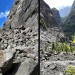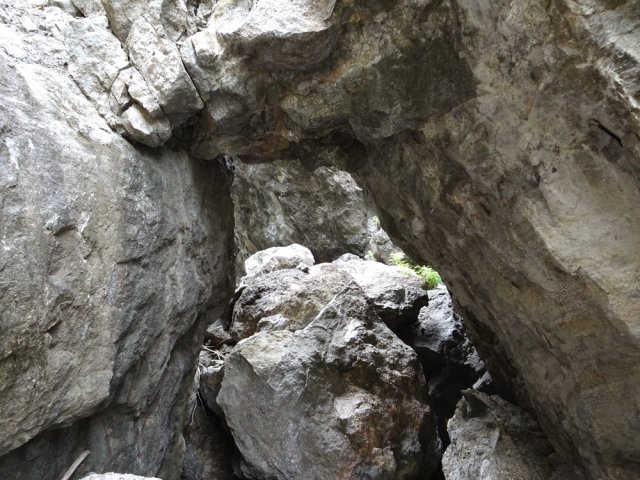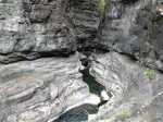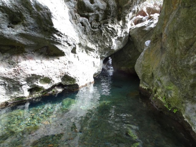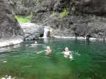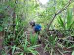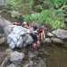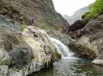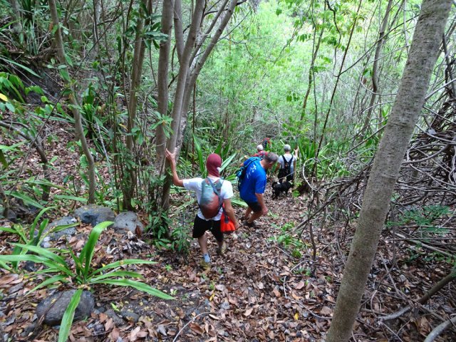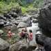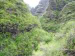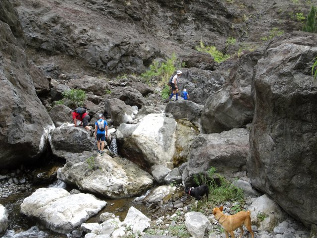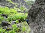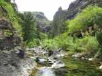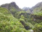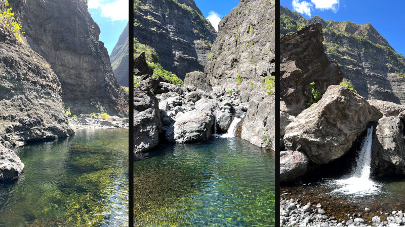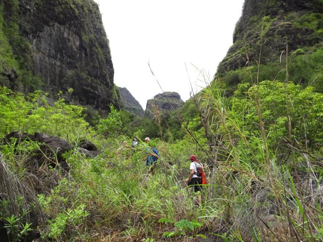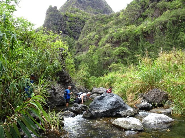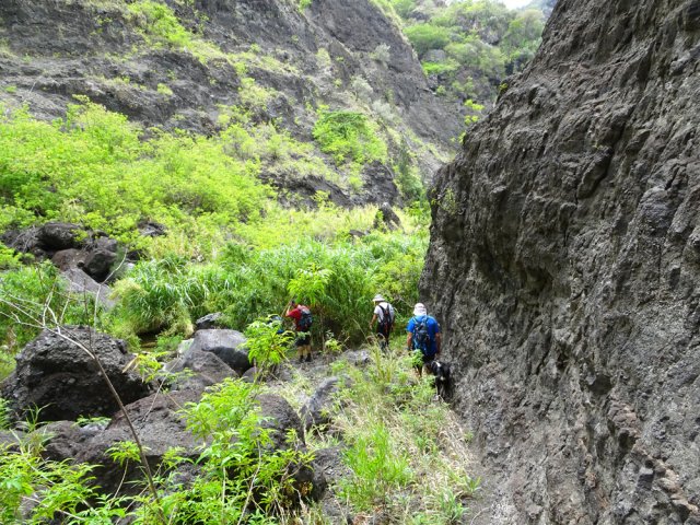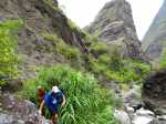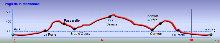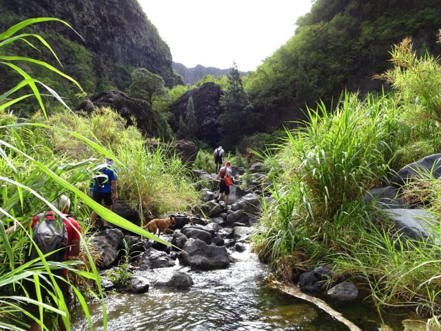 La randonnée débute au grand parking des hélicoptères de Deux Bras. La meilleure façon de s'y rendre est de prendre le 4x4 à la Rivière des Galets car la journée sera assez sportive sans y rajouter la jonction à pied, même venant de Dos d'Ane. Le sentier, large et de bonne qualité longe la rivière ou la traverse par des gués très bien aménagés de grosses pierres (Photo 1). On parvient rapidement et facilement à la Porte après avoir franchi une demi-douzaine de ces gués. A la Porte, reconnaissable à l'ouvrage béton situé dans la falaise en rive gauche, délaisser le sentier longeant la rivière et obliquer à gauche pour entamer une forte montée caillouteuse ou sur des marches en pierre (Photo 2). Le sentier s'assagit sur le haut des falaises longeant la rivière (Photo 3) avant de repartir en montée. Poursuivre vers la Passerelle du Bras d'Oussy par quelques dents de scie permettant d'échauffer les muscles. On laisse un premier embranchement vers Bord Bazar, puis un deuxième à l'approche de la passerelle qu'on distingue déjà, tout comme le barrage sur la Rivière des Galets (Photo 4). Ne pas manquer, avant de descendre vers le torrent, de rejoindre la passerelle pour admirer les bassins 50 mètres plus bas ou, mieux, la vallée vers l'amont que l'on remontera durant plus de trois heures avant de faire demi-tour (Photo 5). Pour trouver le sentier qui va littéralement plonger vers les bassins, faire demi-tour vers Deux Bras et repérer une fenêtre sur la gauche donnant un beau point de vue sur l'aval de la Rivière des Galets. En face, entre arbustes et chocas, on devine une trace à peine visible (Photo 6). S'engager sans hésiter, d'autant qu'il y a peu d'autres possibilités pour cette descente très abrupte. Après avoir rejoint un pied de jamblon, vert et un arbre couché par le vent, entamer la descente sur un sentier assez facile à suivre des yeux mais beaucoup plus délicat pour la marche. La pente, comme on a pu le voir de la passerelle, est très forte et le corps a tendance à être attiré vers le bas. Les pieds du marcheur sont souvent à la hauteur de la tête de celui qui précède (Photo 7). Les arbres sont très utiles pour freiner la descente qui s'effectue cependant sans danger. On se retrouve au bas du canyon vu depuis l'ouvrage qui domine et sur lequel on aperçoit des randonneurs nous observer dans cette vallée verdoyante. Le canyon est de toute beauté avec de petits bassins reliés par des toboggans (Photo 8). Il est également impressionnant de par son étroitesse (Photo 9). A partir de ce canyon, les explications deviennent inutiles car elles peuvent changer en fonction de la saison, de l'état de la végétation ou des préférences de marche de chacun. Une bonne partie, au départ, s'effectue en rive droite où l'on retrouve quelques traces de passages. Quand on se retrouve face à des murs infranchissables de végétation ou de roches, traverser simplement la rivière pour trouver en face un meilleur passage (Photo 10). Dès que possible, privilégier les rives pour gagner en vitesse (Photo 11). La marche est fatigante mais les paysages verdoyants et aquatiques sont le plus souvent agréables (Photo 12). Prendre garde aux roches et galets mouillés qui sont souvent glissants (Photo 13). Le minéral l'emporte parfois sur le végétal et l'on rencontre de plus en plus d'énormes rochers et des bassins profonds qu'il faut éviter (Photo 14). C'est sur la roche de la rive qu'il faut alors trouver son chemin (Photo 15). La pente est de plus en plus forte et le torrent tombe souvent en toboggans qui pourraient être ludiques si l'on disposait de suffisamment de temps (Photo 16). La vallée n'est jamais large et ne comporte pas de canyon (Photo 17). On rencontre de plus en plus de jolies petites chutes (Photo 18). Lorsqu'il fait chaud, les bassins offrent une agréable récréation qui rafraîchira le randonneur (Photo 19). Outre ces chutes, on rencontre un peu partout des curiosités qui méritent quelques secondes d'attention comme des grottes connues sans doute des braconniers, des roches colorées ou incrustées de quartz blanc, des coulées de laves ou plissements de laves dans les falaises, etc. (Photo 20). La dernière partie comporte de plus en plus de rochers qui demandent parfois quelques acrobaties pour les franchir (Photo 21). Il faut toujours rester attentif car la chute pourrait s'avérer très douloureuse. On marche sur les roches, entre elles si elles sont assez espacées ou même dessous quand il est impossible de faire autrement (Photo 22). Ces centaines de marches de plus d'un mètre ont tôt fait de rajouter du dénivelé à la remontée (Photo 23). Plus haut, le sol au pied de la falaise est assez facile mais il faut aussi se méfier des pierres qui viendraient à tomber (Photo 25). Pour avoir assisté à un petit éboulis durant la randonnée, éviter de stationner au pied des falaises. On arrive après trois bonnes heures d'effort à l'approche du Grand Benjoin près duquel est implanté l'Îlet à Bourse (Photo 26). La dernière centaine de mètres s'effectue assez facilement (Photo 27). Le Bras Bémale, un autre torrent du cirque, arrive du nord-est et termine sa course dans le Bras d'Oussy, annonçant la fin de cette remontée. Le niveau d'eau diminue, le sol est couvert de glaise glissante et humide (Photo 28). Le reste de la remontée sera sans doute possible dans les mois qui suivront un cyclone, mais pour le moment ce sont à nouveau les filaos et les cannes fourragères qui bouchent le passage. La pente s'intensifie et il vaut mieux faire demi-tour. Le trajet du retour s'effectue près de deux fois plus vite, d'autant plus qu'il est en descente. Une fois sous la passerelle, attaquer la courte montée extrêmement glissante et regagner le sentier officiel pour un retour au 4x4 en véritable balade d'agrément.