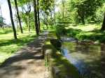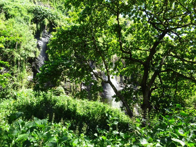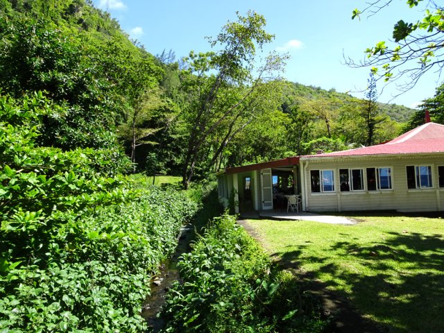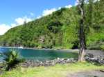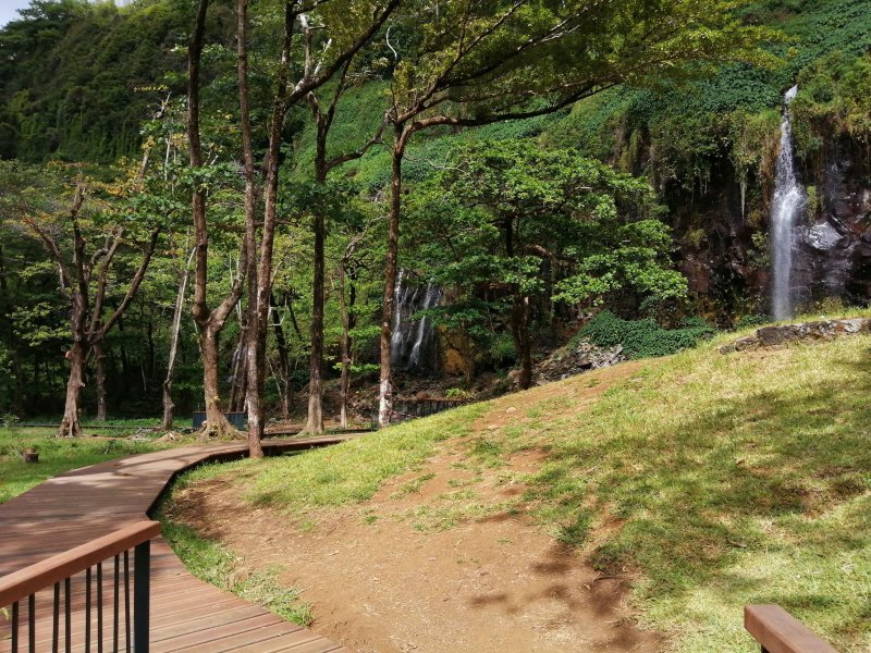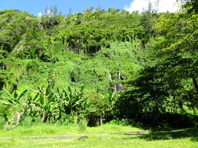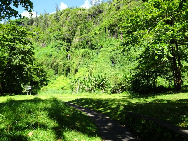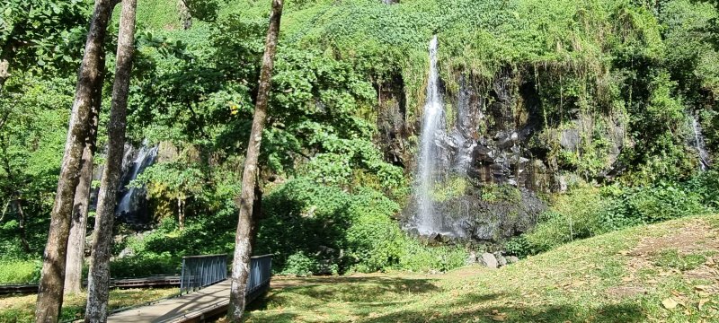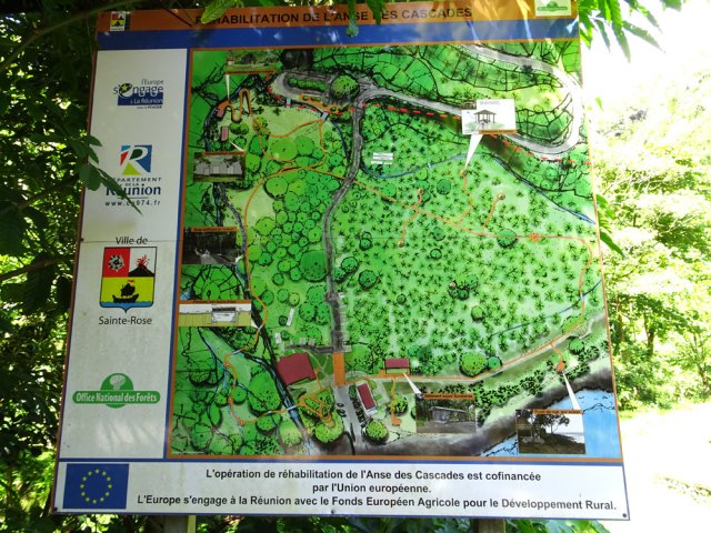 La randonnée débute au dernier parking avant la barrière, désormais cassée, donnant accès aux quelques emplacements autour du restaurant. Il est conseillé d'utiliser ce parking officiel car la pente légère sera plus facile à aborder à partir du point le plus haut. Repérer les lieux à visiter en étudiant les panneaux explicatifs ne précisant aucune date de fin de la réalisation des travaux de réhabilitation (Photo 1). Partir sur la droite en direction du vieux bâtiment des pompes qui est caché par de grands arbres (Photo 2). Le sentier effectue quelques virages dont un serré pour se rapprocher de la ruine couverte de verdure et de graffitis (Photo 3). Le panneau du début prévoit une réhabilitation future de cette ruine. Une fois cette visite terminée, reprendre le chemin inverse et partir sur la piste de droite (Photo 4). Plusieurs autres allées partent sur la gauche et pourront être effectuées une fois la boucle terminée (Photo 5). Elles mènent toutes à la route principale descendant au débarcadère (Photo 6). Poursuivre en direction d'une touffe de bananiers poussant au pied de la falaise (Photo 7). On commence à apercevoir les premières cascades surgissant du rempart recouvert de lianes (Photo 8). En arrivant sous les bananiers, on distingue un peu mieux l'eau coulant dans la verdure (Photo 9). La piste bétonnée longe un bras artificiel de rivière qui ne comporte pas d'eau. Plus bas, c'est le ruisseau lui-même qu'on rencontre et qu'il faut longer près d'un muret (Photo 10). On découvre quelques gués et vestiges de passerelles détruites. La piste, toujours aussi facile et roulante, traverse quelques jeunes plantations destinées à remplacer les arbres abattus lors du dernier cyclone (Photo 11). Le bruit de l'eau s'intensifie et l'on commence à voir des cascades plus importantes. Il faut franchir une première passerelle en bois pour arriver en rive droite (Photo 12). Le béton est remplacé par un plancher en bois tout aussi roulant (Photo 13). Certaines passerelles sont plus envahies que d'autres et les lianes peuvent gêner le passage (Photo 15). Partir sur la droite et se rapprocher au plus près de la plus grande cascade du site (Photo 16). Après la visite des cascades, reprendre les passerelles puis franchir le ruisseau à proximité du restaurant (Photo 19). Repérer au passage la bande de roulement allant jusqu'aux salles à manger pour un repas de fin de balade (Photo 20). Passer le plan incliné permettant la mise à l'eau des barques de pêche alignées sur le bord. On distingue très bien le panorama classique de l'Anse des Cascades bordée de galets de toutes tailles (Photo 21). Longer ensuite la cocoteraie après avoir passé le nouveau bâtiment accueillant des toilettes pour tous (Photo 22). Ne pas manquer la petite rotonde réalisée en bord de mer qui permet de bénéficier de la meilleure vue sur l'océan et les falaises (Photo 23). Après cette nouvelle halte très agréable continuer sur la piste en direction des bois. Elle repart sur la gauche vers la cocoteraie et l'on devine les premiers kiosques (Photo 25). Tout a été pensé pour les personnes ne pouvant pas se déplacer à pied. Les allées mènent jusqu'aux kiosques (Photo 27). L'ancienne cocoteraie, qui a mieux résisté aux cyclones que les badamiers et autres grands arbres, présente l'originalité d'abriter des cocotiers aux larges pieds qui permettent sans doute de mieux résister aux vents (Photo 28). Si l'on préfère le pique-nique au restaurant, choisir le meilleur emplacement parmi les quatre kiosques dédiés aux personnes porteuses de handicap. Sinon, retrouver la route principale puis rejoindre le parking en parcourant les pistes non testées dans la boucle.
