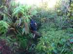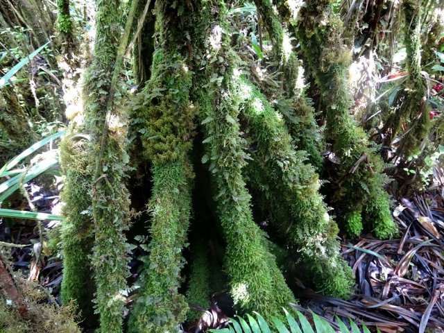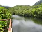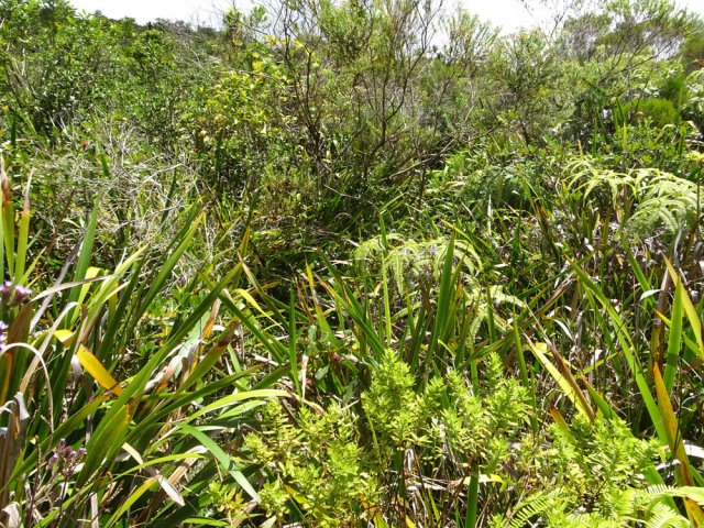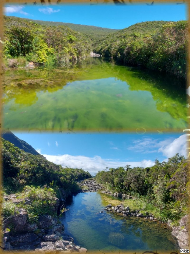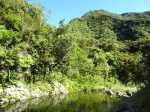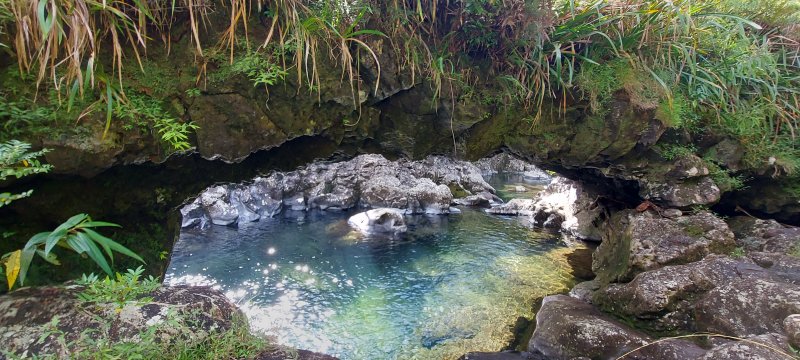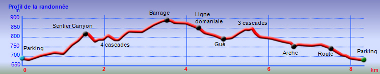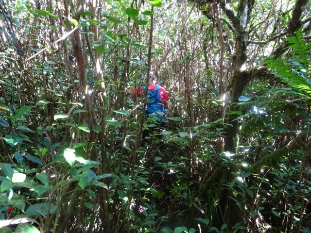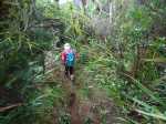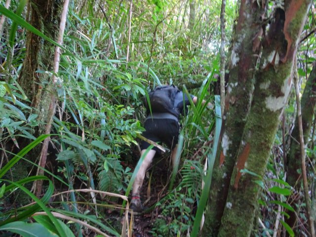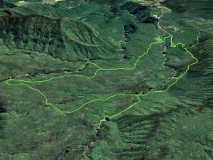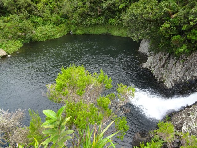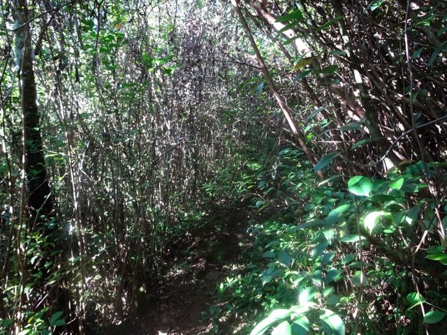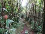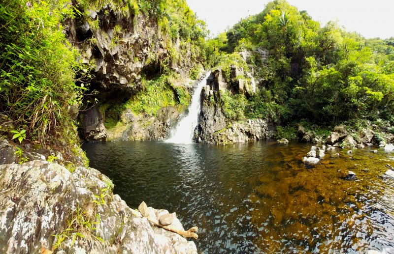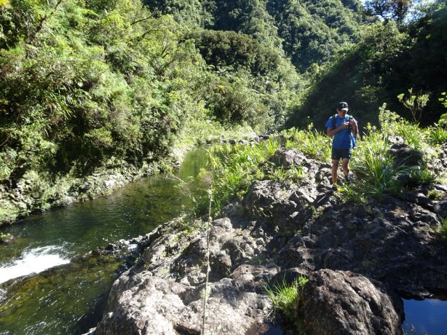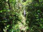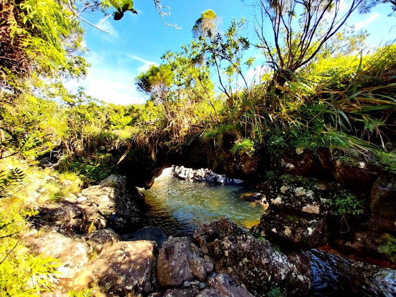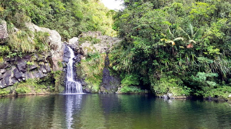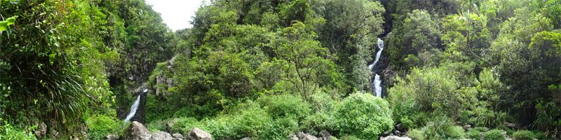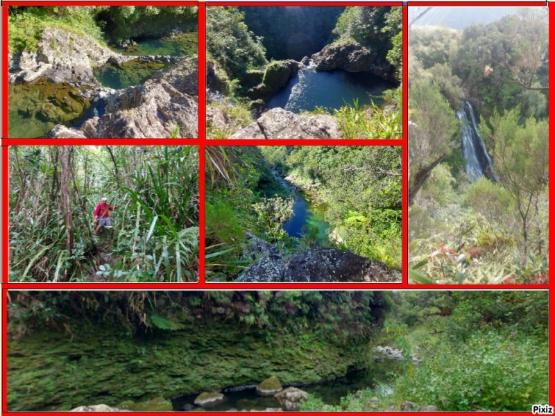 La randonnée débute sur l'ancien sentier de Bélouve, près d'un petit parking situé à 750 m du belvédère de la Cascade du Chien. On distingue à peine le départ fermé par les bois de chapelet, les fougères et hautes herbes (Photo 1). Le sentier est étroit, pas toujours facile à suivre quand il est bouché par les fougères mais il est impossible à perdre (Photo 2). Il faut d'ors et déjà s'habituer aux goyaviers qu'on ne quittera plus de la journée. On est parfois obligé de marcher courbé pour éviter les griffures. Le sentier longe bientôt un cours d'eau encombré de gros galets. Marcher jusqu'à un gros bois de rempart qui domine l'affluent du Bras Piton puis traverser le gué les pieds dans l'eau (Photo 3). Reprendre la légère montée dans les tabacs bœuf (Clidemia hirta) et bambous balais quand il n'y a pas de goyaviers (Photo 4). La végétation est très touffue mais on profite cependant de quelques vues sur le Morne du Bras des Lianes dans les rares trouées (Photo 5). Ne pas manquer le sentier étroit qui file à droite dans les goyaviers à l'altitude de 830 mètres (Photo 6). Il descend graduellement puis de plus en plus fortement vers le Bras Piton qu'on entend dans le bas. Les mains sont souvent nécessaires pour éviter la glissade. On parvient sur les basaltes bordant la rivière. Il est alors conseillé de laisser le sac sur les rives pour gagner en souplesse et liberté pour les visites qui suivront. Sur la droite, on domine un grand bassin. En prenant garde à la glissade, il est possible de longer ce bassin en rive droite et en atteindre le bord (Photo 7). On remarque qu'il est alimenté par deux chutes ; la plus importante par le Bras Piton et l'autre par un de ses affluents. L'eau y est noire mais le lieu se prête à la baignade. Le véritable spectacle est vers l'aval. Le bassin se déverse dans un autre 25 m plus bas par une impressionnante cascade. L'eau file immédiatement dans un gouffre sans fond en créant beaucoup d'écume et de brume (Photo 8). Pas question de chercher un passage dans le ravin et laisser ces magnifiques chutes aux canyonistes. Remonter et poursuivre vers l'amont à la recherche des autres chutes. Le cadre verdoyant est agréable et reposant. L’endroit est idéal pour une première pause (Photo 9). Fini les difficultés ; la marche est facile sur les rives comportant peu de galets (Photo 10). Il faut pourtant se mouiller un peu pour franchir le bassin dans moins d'un mètre d'eau, d'où l'intérêt de laisser le sac à la fin du sentier. Longer un superbe toboggan en marchant en rive droite (Photo 11). On rejoint très vite le dernier bassin alimenté par une belle chute (Photo 12). L'eau semble beaucoup plus claire en raison du sable et des graviers qui en tapissent le fond. Après la baignade, ou non, reprendre le chemin inverse et laisser ce cadre idyllique (Photo 13). Reprendre le sentier près des sacs à dos et entamer la rude montée où les mains seront très utiles (Photo 14). Profiter, malgré la pente, des zones couvertes de mousse où on ne reconnaît les pimpins des hauts qu'à leurs racines aériennes (Photo 15). On quitte la fine trace pour retrouver celle, un peu plus large en repartant à droite sur l'ancien sentier de Bélouve. Aucune inquiétude de perdre le sentier qui a pourtant mal vieilli. Plus haut, les goyaviers diminuent un peu et sont remplacés par les sabres qui bouchent beaucoup plus le passage (Photo 16). Le bruit de l'eau devient plus fort. On pense arriver près d'une nouvelle chute mais c'est simplement le déversoir du barrage sur le Bras Piton (Photo 17). Un balcon permet de dominer le petit lac dont l'eau est puisée puis transportée vers une autre ravine avant d'être captée près de la route de l'Eden (Photo 18). Emprunter le sentier qui ramène à l'Eden. On retrouve la même végétation où le goyavier est roi (Photo 19). Même si on prend le temps d'éviter les zones boueuses, il sera difficile malgré tout d'y échapper (Photo 20). Ce n'est pas la partie la plus agréable de la boucle et on comprend mieux pourquoi il faut plus de 7 heures pour rejoindre le Coteau Monique situé à moins de 15 km de la route de l'Eden. Le sentier effectue parfois de très fortes montées ou descentes pour franchir des petites ravines au fond couvert de galets glissants. Il s'approche du Bras des Lianes, assez large à cet endroit. Avant de le franchir, partir sur la droite et remonter le cours d'eau par la rive gauche puis très rapidement à l'instinct (Photo 21). Après 400 mètres à chercher le meilleur passage sans grand danger, on parvient à un vaste bassin alimenté par un toboggan (Photo 22). Chercher, en rive gauche, le début de la trace de contournement dans les plantes. Il grimpe assez fortement sur quelques mètres et évite le bassin dans une végétation touffue et moussue. Il redescend sur les rochers qui dominent le bassin (Photo 23). Repartir vers l'amont en sautant les rochers ou en marchant sur la rive droite. On se retrouve devant un magnifique paysage de deux cascades parallèles venant de deux ravines différentes (Photo 24). La plus belle, celle du Bras des Lianes, se rejoint en une minute. Elle tombe dans un bassin sauvage bordé d'une grande grotte sous les orgues basaltiques (Photo 25). Faire demi-tour et rejoindre le gué par le même itinéraire. Les chaussures sont aussi propres que le matin au départ. Il faut hélas reprendre le sentier pour les crotter à nouveau (Photo 26). Il est tout de même moins boueux que la partie avant le Bras des Lianes (Photo 27). Repérer le départ d'un sentier sur la gauche quand on entend couler l'eau d'une cascade. On arrive très vite sur la berge près d'une belle arche double qui semble dominer le torrent (Photo 28). Gare à la glissade, 10 mètres plus loin, lorsque l'on domine le bras et le bassin rempli par une très haute cascade, la huitième importante de la journée. Le sentier se termine assez vite en piste qui rejo