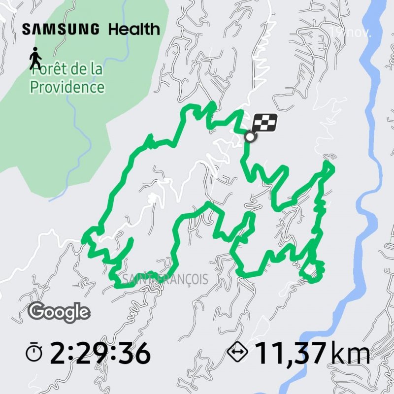 A Saint Denis,rouler sur le Boulevard Jean Jaures et bifurquer en direction de l'église de la Trinité par la Rue de la Mairie ou la Rue du Pape Jean Paul II - Remonter vers Montgaillard - Stationner au grand réservoir situé sur la droite de la Route de Montgaillard - Marcher sur la Route de Montgaillard puis tourner à droite sur l'Allée Bellavista - Emprunter quelques ruelles de raccourci pour arriver à l'Allée des Gloxinias - Débuter la montée vers le Piton Patates par pistes et sentiers - Remonter vers Saint-François par le Chemin du Piton - Franchir la Ravine du Moufia par un raccourci qui rejoint le Chemin des Niaoulis - Passer quelques lacets sur ce chemin et partir à gauche sur une piste un peu défoncée - Quitter la piste pour le magnifique raccourci franchissant la Ravine Laverdure - Rejoindre l'église du village et la longer par le Chemin de l'Eglise - Poursuivre à gauche sur le Chemin Alfred Mazérieux - Prendre à droite la ruelle de l’Evêché avant d'emprunter le Chemin de l'Evêché jusqu'à la chapelle du Piton St-François - Effectuer ou non le chemin de croix puis poursuivre - Emprunter le raccourci passant devant le Pôle agrobiologique - Bifurquer sur la D43 vers la droite et descendre vers St-François en passant les lacets courts - Effectuer un arrêt à la cascade sur la Ravine Boucan Launay - Marcher jusqu'à la mairie annexe, entamer la descente par les escaliers et ruelles du Raidillon de St-François ou les sentiers des Bougainvillées et des Dattiers - Terminer par la Rue des Tourtereaux et trouver le superbe raccourci qui traverse la Ravine Laverdure pour rejoindre la citerne du départ.