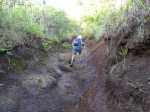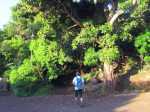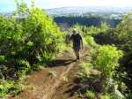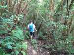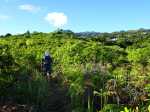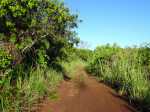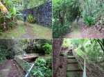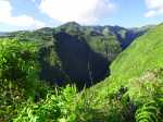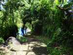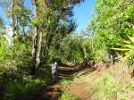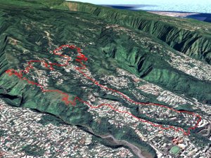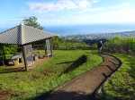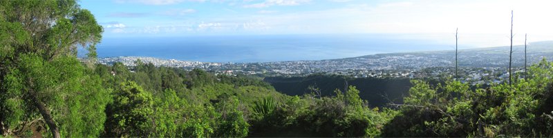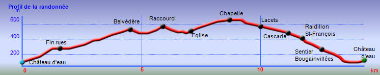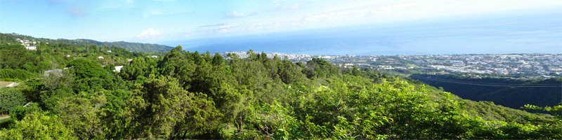 La randonnée débute le long de la Route de Montgaillard où il est assez facile de stationner près du château d'eau situé sur la droite en montant. Marcher une dizaine de minutes sur les nombreux virages de cette rue pouvant être bruyante le matin à l'embauche. Quitter la civilisation pour se rapprocher de la vallée de la Ravine des Patates à Durand en poursuivant sur l'allée Belavista. Le premier raccourci débute à la fin de cette allée étroite entre les habitations (Photo 1). On coupe souvent des rues mais pour retrouver aussitôt la ruelle de l'autre côté avec parfois des décalages d'une dizaine de mètres. Emprunter l'allée des Gloxinias à la fin des ces traversées près des arrière-cours. Sur la gauche, le Pic Adam dépasse à l'horizon (Photo 2). A la fin de la rue, 30 minutes après avoir quitté la citerne, impossible de manquer l'énorme manguier sous lequel débute la longue montée au Piton Patates (Photo 3). Un large chemin plat, un peu terreux, bordé de filaos et autres arbres de ces altitudes permet de s''échauffer avant d'attaquer la véritable montée. Le sentier se transforme en piste qui grimpe de plus en plus entre les poivriers et quelques chocas. Certaines portions sont défoncées par les ravinements et doivent être très difficiles à utiliser, même par les véhicules tout terrain. A pied, rien de plus facile que de passer les écueils parfois glissants (Photo 4). Certains sentiers débutent le long de la piste et pourront intéresser les curieux. On s'élève assez rapidement pour profiter de panoramas de plus en plus larges en direction de la côte (Photo 5). La piste effectue de longs lacets sur des portions très faciles (Photo 6). Avec la carte en main, il est facile de repérer les raccourcis qui permettront de gagner en distance tout en profitant de belles vues sur la campagne environnante (Photo 7). Une petite portion de route étroite se rencontre en milieu de montée, mais pour seulement quelques dizaines de mètres, avant de retrouver la piste (Photo 8). Après 40 minutes de montée régulière, on parvient à la barrière en bordure de l'aire de repos du Piton Patates (Photo 9). Les derniers mètres peuvent s'effectuer sur piste ou sur les multiples sentiers créés par les pneus de VTT (Photo 10). Emprunter une des pistes qui remonte vers le rempart. On arrive à des kiosques où il est très agréable de pique-niquer en famille tout en profitant du point de vue du Saint-Denis, Sainte-Marie et Sainte-Suzanne (Photo 11). Au bord du rempart, une longue balustrade protège du vide (Photo 12). Depuis cette rambarde, on bénéficie de superbes panoramas sur les alentours de Bois de Nèfles et ses champs d'ananas en bord de falaise. La vallée de la Ravine des Patates à Durand, dominée par le Pic Adam, donne envie de remonter le torrent pour s'approcher des cascades qui tombent de la Ravine Blanche (Photo 13). Si on décide de ne pas poursuivre plus haut, descendre par l'escalier ou les petites voies qui circulent entre kiosques, touffes de bambous et arbres (Photo 14). L'endroit, assez vaste, est propre et entretenu. Un portail en ferme l'accès en dehors des heures ouvrables. Redescendre et partir sur le Chemin du Piton après un dernier coup d'œil à la ville de Saint-Denis (Photo 15). Marcher sur le Chemin du Piton, passer quelques virages avant de découvrir sur la droite un sentier qui redescend entre les goyaviers pour franchir la Ravine Moufia. Il est étroit, en pente moyenne et peut être très glissant (Photo 16). Il se termine au Chemin des Niaoulis qu'on emprunte en partant à droite. Très vite, on rencontre une piste partant sur la gauche. Elle est large et carrossable jusqu'à quelques maisons. Repérer les trois grands palmiers royaux et emprunter le sentier bétonné qui s'engage vers la droite. Il longe un mur de pierre et plonge vers la Ravine Laverdure. Côté rempart, il est bordé de barrières métalliques. La traversée est de tout repos sur ce sol bétonné et encore de qualité. Il est bordé de chocas, bambous géants et bambous balais. Il traverse la ravine sur une passerelle avant de remonter en direction de l'église de St-François-Xavier (Photo 17). Passer devant le petit édifice blanc, entamer la remontée de l'allée qui rejoint en pente faible le Chemin Alfred Mazérieux (Photo 18). Cette route bordée de verdure et de belles propriétés est un pur plaisir même pour les allergiques au goudron (Photo 19). On passe près d'un très grand oratoire en pierre de lave dédié à la Vierge. Avant une série de lacets, trouver sur la droite une allée bétonnée qui, de loin, semble se terminer à un portail. Bifurquer à gauche au portail et rejoindre le Chemin de l'Evêché. Le chemin longe un moment quelques habitations et la Ravine Boucan Launay. Deux bassins alimentés par des toboggans se rejoignent en une minute à travers les longoses. Plus haut, la chapelle du Piton St-François est facile à trouver sur la droite. Le sommet du piton, occupé par une grande croix en bois, s'atteint très vite en passant sous les grands filaos qui servent de stations du chemin de croix (Photo 20). A quelques dizaines de mètres de la chapelle, débute une nouvelle piste bétonnée passant entre habitations et zones réservées aux cultures de l'Association pour la Renaissance des Cultures Traditionnelles (Photo 21). Après avoir rejoint la RD43, partir sur la droite puis rejoindre les lacets qui descendent vers Saint-François (Photo 22). Après une dizaine de ces lacets, la route passe au plus près de la Ravine Boucan Launay d'où l'on entend couler l'eau. Le bassin est tout petit mais la fine cascade est élégante (Photo 23). On arrive très vite à la mairie annexe en ayant suivi la très profonde vallée de la ravine Boucan Launay. Débute alors une interminable descente sur les nombreuses marches et paliers du Raidillon de St-François qui coupe les lacets de la route (Photo 24). On peut ranger le GPS 