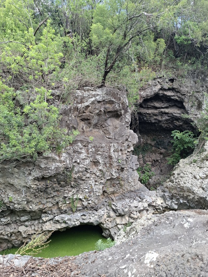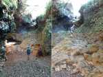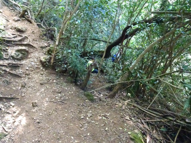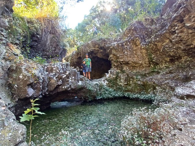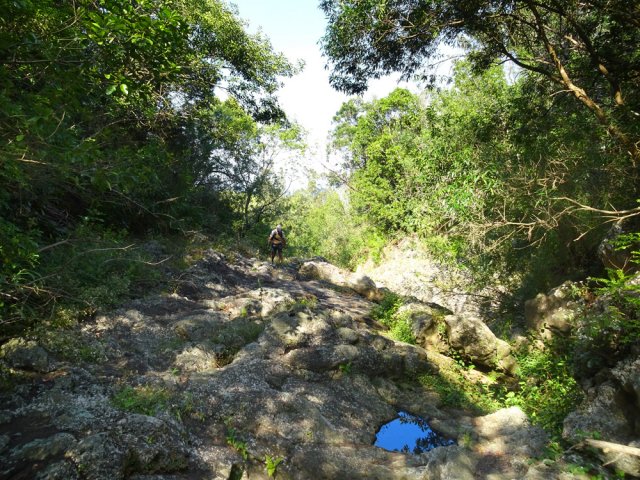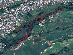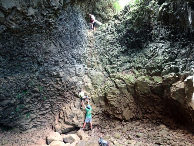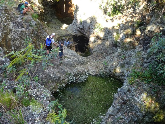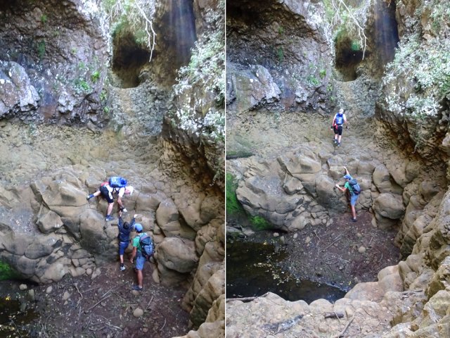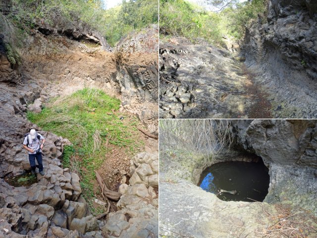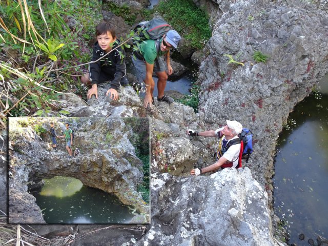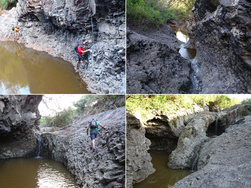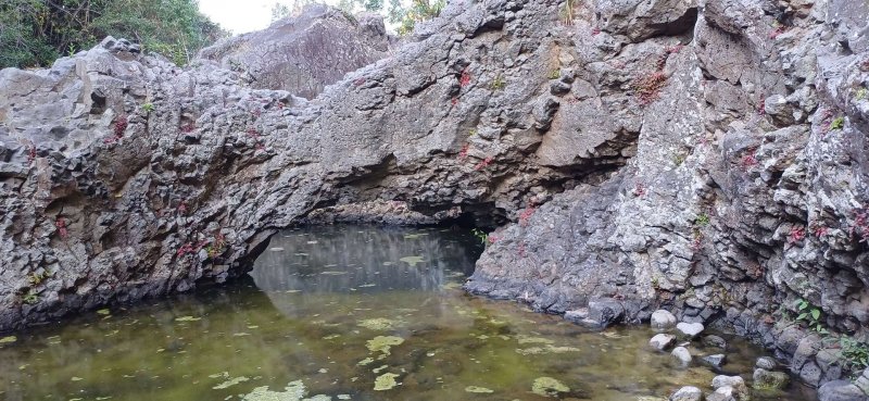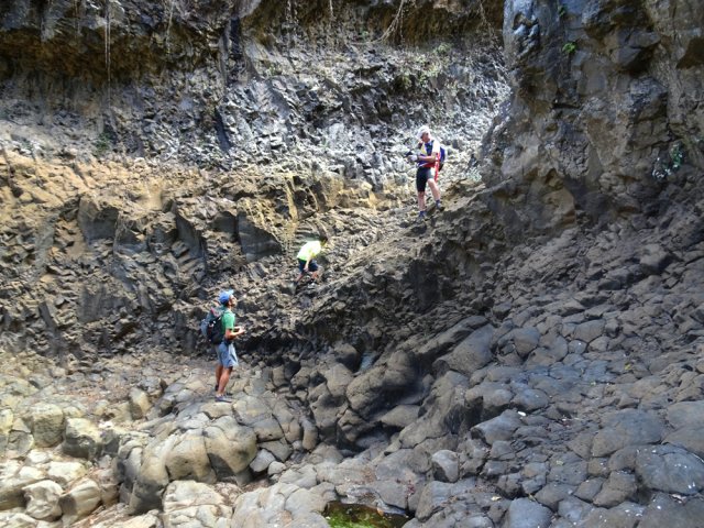 La randonnée débute à la passerelle du Chemin de Pétréas qui permet le franchissement à pied de la rivière en cas de crue. Près du gué, on retrouve le sentier des Petits Tamponnais Ruraux, association disparue en même temps que le sentier, excepté le tronçon décrit ici. Débuter sur cet agréable sentier comportant peu de fortes montées (Photo 1). Une première arche est présente dans le fond de la rivière mais elle est difficilement accessible. Un hors sentier est nécessaire pour s'en approcher entre les arbres et longoses (Photo 2). Petite acrobatie pour s'approcher de l'eau et trouver l'arche au-dessus de son bassin (Photo 3). Remonter un peu la rivière sur les roches de la rive droite puis traverser une belle étendue de renouées du chinois dépassant la hauteur d'un homme par endroits. Ne pas manquer une nouvelle arche sur la gauche (Photo 4). On peut passer dessous pour rejoindre une grande grotte en rive droite. Les bassins se succèdent, imposant quelques courtes escalades sans danger (Photo 5). Cette remontée de rivière amène à un énorme bassin que l'on peut visiter s'il est à sec. Descendre et remonter, également par l'escalade de quelques roches lisses (Photo 6). 5 minutes plus tard, on rencontre un autre endroit, magnifique, très sauvage, destiné aux amateurs de photos de nature (Photo 7). Cet ensemble de bassin-grotte-falaise est un des plus beaux endroits de la boucle. Comme la remontée est rendue impossible sans matériel, faire demi-tour mais délaisser le fond de la ravine pour chercher un passage dans la falaise en rive droite. L'échappatoire se situe derrière un arbre qui aide à l'escalade (Photo 8). Une fois l'étroit passage franchi, remonter en direction du champ de canne à sucre en traversant facilement le bois (Photo 9). Suivre les cannes jusqu'au sentier. Avant de poursuivre vers l'amont, rejoindre le gué et entamer une descente de la rivière en rive gauche pour rejoindre le dernier bassin délaissé il y a quelques minutes. Là aussi, sans danger, descendre vers les bassins dans lesquels il est déconseillé de se baigner (Photo 10). Deux d'entre eux sont séparés par une troisième arche basaltique qui ne se voit pas si le bassin est trop rempli (Photo 11). Remonter au gué puis entamer la suite en empruntant le sentier très fréquenté des marcheurs et coureurs. On y rencontre une racine d'une quinzaine de mètres assez caractéristique (Photo 12). Marcher sous les énormes camphriers bordant le sentier (Photo 13). Le Bassin Samuel se remarque sur la droite mais il n'est pas facile de s'y rendre sans se griffer. Plus loin, repérer le sentier plus discret obliquant sur la droite en direction du Bassin Michel (Photo 14). Le plus souvent à sec, il demande un peu d'attention pour atteindre le fond. Les minuscules marches de basalte facilitent la descente (Photo 15). Lorsque le bassin est plein, c'est une autre affaire que de remonter la rivière (voir ci-dessous la vignette 1 de la photo du § après les pluies). De l'autre côté, l'escalade est identique et facile (Photo 16). Le bassin, un peu envahi de plantes est suivi d'un très long toboggan creusé d'une profonde marmite d'où il serait impossible de sortir sans aide en cas de chute (Photo 17). Plus haut, c'est un gruyère de basalte qui doit être très impressionnant lors de crues importantes. Il se traverse par quelques escalades sans grand danger (Photo 18). Une ferme en rive gauche se repère avec les cris, aboiements, meuglements, cacabements de pintades et odeurs de lisier ! Les pigeons s'envolent par dizaines des anfractuosités où ils viennent pondre. On domine plusieurs bassins plus ou moins importants. Celui situé le plus en amont est alimenté par un petit pisse en l'air après la pluie. On remarque vers l'aval une arche discrète mais qui semble pourtant imposante. Pour s'en approcher au plus près, rejoindre le sentier et marcher vers l'aval jusqu'aux belles racines moussues. Descendre vers le lit puis remonter sur l'îlot basaltique créé par deux bras de la rivière en s'aidant ou non d'une sangle (Photo 19). En remontant l'îlot, on parvient au-dessus de l'arche. Il vaut mieux éviter de monter sur l'arche ou alors le faire prudemment (Photo 20). Cinq mètres d'une corde passée autour d'un arbre peuvent rassurer et éviter la chute dans l'eau sale. Revenir au sentier. En cherchant bien, on devine une arche plus en aval qui se rejoint également avec prudence. De retour sur le sentier, marcher à nouveau vers l'amont jusqu'au prochain embranchement (Photo 21). Partir à droite jusqu'à la rivière. Traverser à nouveau les longues renouées du chinois jusqu'au Bassin Capillaire, reconnaissable à sa grotte tapissée de cette petite fougère de dentelle (Photo 22). N-ième retour au sentier en remontant cette fois la petite falaise basaltique pour rejoindre le gué une centaine de mètres plus haut. Au gué, remonter la rivière à sec jusqu'au confluent du Bras Creux qui finit par une petite cascade souvent à sec. Tout près se trouve un grand bassin profond dont on peut rejoindre le fond sans difficulté. De l'autre côté, attention à l'escalade du bord du bassin si le basalte est humide (Photo 23). Cette fiche termine ici la remontée spectaculaire de la Rivière d'Abord. Trois solutions permettent alors de retrouver la passerelle des Pétréas.