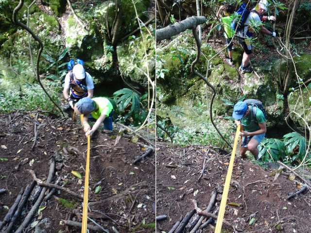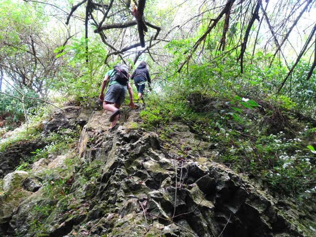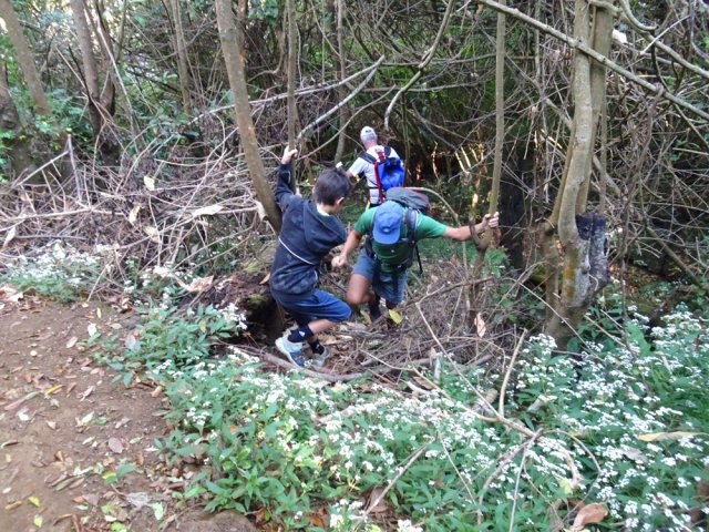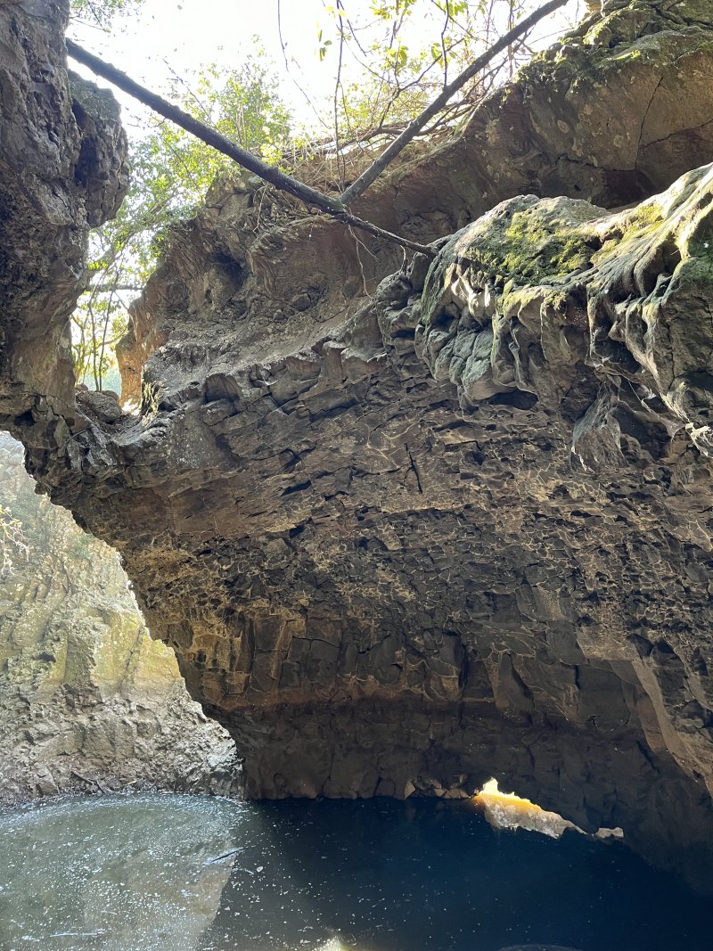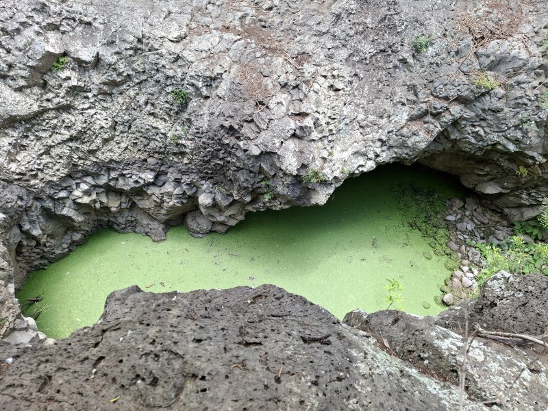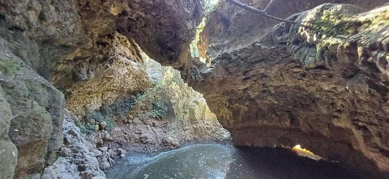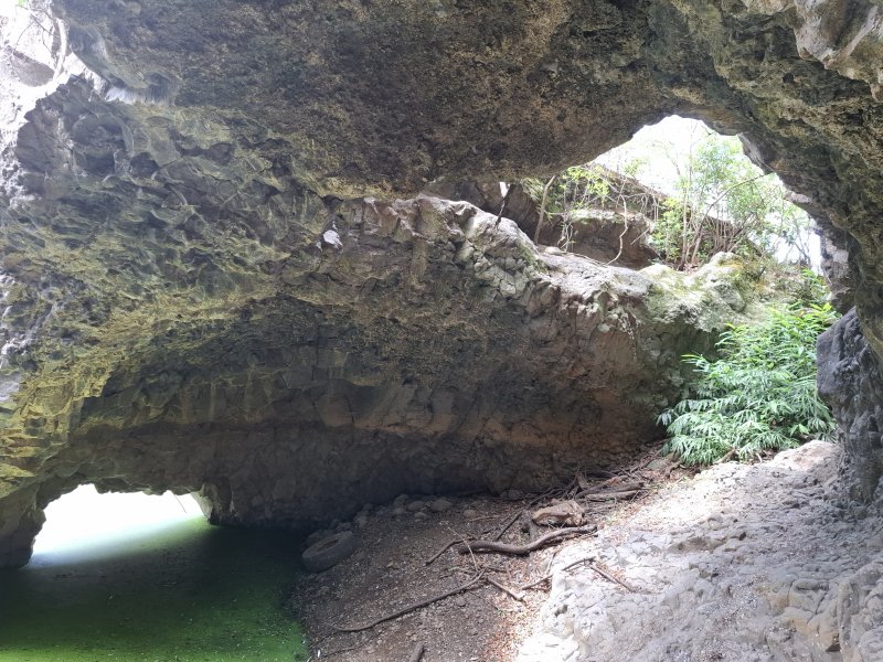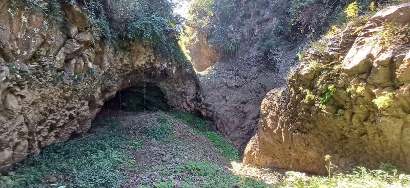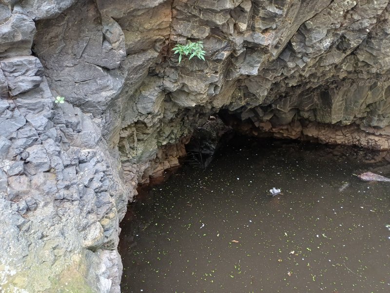 La randonnée débute à la passerelle du Chemin de Pétréas qui permet le franchissement à pied de la rivière en cas de crue. Près du gué, on retrouve le sentier des Petits Tamponnais Ruraux, association disparue en même temps que le sentier, excepté le tronçon décrit ici. Débuter sur cet agréable sentier comportant peu de fortes montées (Photo 1). Une première arche est présente dans le fond de la rivière mais elle est difficilement accessible. Un hors sentier est nécessaire pour s'en approcher entre les arbres et longoses (Photo 2). Petite acrobatie pour s'approcher de l'eau et trouver l'arche au-dessus de son bassin (Photo 3). Remonter un peu la rivière sur les roches de la rive droite puis traverser une belle étendue de renouées du chinois dépassant la hauteur d'un homme par endroits. Ne pas manquer une nouvelle arche sur la gauche (Photo 4). On peut passer dessous pour rejoindre une grande grotte en rive droite. Les bassins se succèdent, imposant quelques courtes escalades sans danger (Photo 5). Cette remontée de rivière amène à un énorme bassin que l'on peut visiter s'il est à sec. Descendre et remonter, également par l'escalade de quelques roches lisses (Photo 6). 5 minutes plus tard, on rencontre un autre endroit, magnifique, très sauvage, destiné aux amateurs de photos de nature (Photo 7). Cet ensemble de bassin-grotte-falaise est un des plus beaux endroits de la boucle. Comme la remontée est rendue impossible sans matériel, faire demi-tour mais délaisser le fond de la ravine pour chercher un passage dans la falaise en rive droite. L'échappatoire se situe derrière un arbre qui aide à l'escalade (Photo 8). Une fois l'étroit passage franchi, remonter en direction du champ de canne à sucre en traversant facilement le bois (Photo 9). Suivre les cannes jusqu'au sentier. Avant de poursuivre vers l'amont, rejoindre le gué et entamer une descente de la rivière en rive gauche pour rejoindre le dernier bassin délaissé il y a quelques minutes. Là aussi, sans danger, descendre vers les bassins dans lesquels il est déconseillé de se baigner (Photo 10). Deux d'entre eux sont séparés par une troisième arche basaltique qui ne se voit pas si le bassin est trop rempli (Photo 11). Remonter au gué puis entamer la suite en empruntant le sentier très fréquenté des marcheurs et coureurs. On y rencontre une racine d'une quinzaine de mètres assez caractéristique (Photo 12). Marcher sous les énormes camphriers bordant le sentier (Photo 13). Le Bassin Samuel se remarque sur la droite mais il n'est pas facile de s'y rendre sans se griffer. Plus loin, repérer le sentier plus discret obliquant sur la droite en direction du Bassin Michel (Photo 14). Le plus souvent à sec, il demande un peu d'attention pour atteindre le fond. Les minuscules marches de basalte facilitent la descente (Photo 15). Lorsque le bassin est plein, c'est une autre affaire que de remonter la rivière (voir ci-dessous la vignette 1 de la photo du § après les pluies). De l'autre côté, l'escalade est identique et facile (Photo 16). Le bassin, un peu envahi de plantes est suivi d'un très long toboggan creusé d'une profonde marmite d'où il serait impossible de sortir sans aide en cas de chute (Photo 17). Plus haut, c'est un gruyère de basalte qui doit être très impressionnant lors de crues importantes. Il se traverse par quelques escalades sans grand danger (Photo 18). Une ferme en rive gauche se repère avec les cris, aboiements, meuglements, cacabements de pintades et odeurs de lisier ! Les pigeons s'envolent par dizaines des anfractuosités où ils viennent pondre. On domine plusieurs bassins plus ou moins importants. Celui situé le plus en amont est alimenté par un petit pisse en l'air après la pluie. On remarque vers l'aval une arche discrète mais qui semble pourtant imposante. Pour s'en approcher au plus près, rejoindre le sentier et marcher vers l'aval jusqu'aux belles racines moussues. Descendre vers le lit puis remonter sur l'îlot basaltique créé par deux bras de la rivière en s'aidant ou non d'une sangle (Photo 19). En remontant l'îlot, on parvient au-dessus de l'arche. Il vaut mieux éviter de monter sur l'arche ou alors le faire prudemment (Photo 20). Cinq mètres d'une corde passée autour d'un arbre peuvent rassurer et éviter la chute dans l'eau sale. Revenir au sentier. En cherchant bien, on devine une arche plus en aval qui se rejoint également avec prudence. De retour sur le sentier, marcher à nouveau vers l'amont jusqu'au prochain embranchement (Photo 21). Partir à droite jusqu'à la rivière. Traverser à nouveau les longues renouées du chinois jusqu'au Bassin Capillaire, reconnaissable à sa grotte tapissée de cette petite fougère de dentelle (Photo 22). N-ième retour au sentier en remontant cette fois la petite falaise basaltique pour rejoindre le gué une centaine de mètres plus haut. Au gué, remonter la rivière à sec jusqu'au confluent du Bras Creux qui finit par une petite cascade souvent à sec. Tout près se trouve un grand bassin profond dont on peut rejoindre le fond sans difficulté. De l'autre côté, attention à l'escalade du bord du bassin si le basalte est humide (Photo 23). Cette fiche termine ici la remontée spectaculaire de la Rivière d'Abord. Trois solutions permettent alors de retrouver la passerelle des Pétréas.