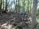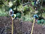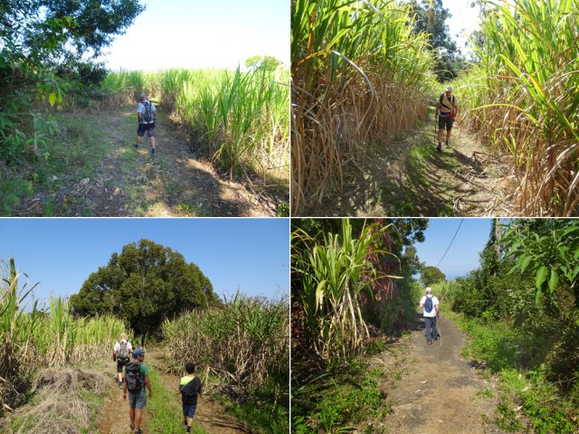 3 – La solution proposée ici. Rejoindre le sentier comme en 1, marcher jusqu'au gué puis remonter le Bras Creux en escaladant la falaise de la cascade à sec (Photo 25). Se frayer parfois un passage dans les cannes fourragères ou suivre simplement le fond basaltique jusqu'à la piste (Photo 26). Emprunter la piste vers la gauche et commencer une agréable descente dans les champs de canne (Photo 27). N'emprunter que les chemins bien tracés par les roues des tracteurs. On côtoie des cases abandonnées, de beaux camphriers, des eucalyptus avant de parvenir au stade du 12e (Photo 28). Ce jeu de piste amène au gué déjà rencontré à la montée. Poursuivre simplement sur le sentier pour arriver en 5 minutes à la Rue Saint-Vincent de Paul.