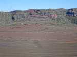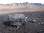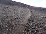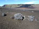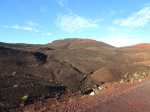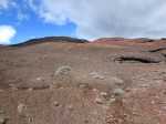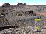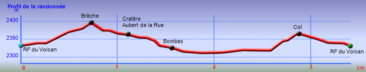 La randonnée débute aux Gendarmes, ces gros blocs facilement repérables au plus près de la piste et qui "veillent" sur la plaine (Photo 1). De la piste, le Chisny ne paraît guère impressionnant. On repère facilement les traces laissées par les randonneurs (Photo 2). Débuter la boucle en suivant la trace qui part vers la gauche et délaisser celle qui monte plus fortement vers le sommet. Le sol aride ne comporte que quelques maigres plantes tentant leur chance (Photo 3). La pente est assez forte sur le flanc en direction du sommet (Photo 4). Sur la gauche, le terrain est beaucoup plus chaotique du côté des cratères Aubert de la Rue (Photo 5). Pour rallonger un peu la boucle, ce n'est pas une aventure insurmontable que de marcher entre les cratères et le Chisny. Des traces sont là pour le montrer mais les fissures du sol imposent cependant un peu plus de prudence. La légère pente permet de s'élever graduellement en admirant des panoramas de plus en plus larges (Photo 6). Le sentier arrive au point le plus haut à une brèche entre les roches (Photo 7). On passe aisément cette brèche avant de descendre en direction d'une zone plus rocheuse (Photo 8). Il est également possible de la contourner sur un sol un peu plus glissant. Les blocs et roches volcaniques se multiplient mais il y a toujours un passage facile (Photo 10). On peut ralentir le pas dans cette région rocheuse pour y rechercher quelques curiosités (Photo 11). De nombreuses cavités ont été créées dans les amoncellements de roches acérées (Photo 12). Ce demi hectare de chaos peut se visiter en détail mais ne réserve pas de grosses surprises géologiques (Photo 13). A noter, une arche constituée de gratons qui ne résistera pas des siècles à l'érosion (Photo 14). A la fin des amoncèlements, on retrouve un sentier plus facile sur un terrain qui s'est aplani (Photo 15). La descente vers la Plaine des Sables peut débuter (Photo 17). On rencontre un autre sentier venant du sommet (Photo 18). La trace descendant vers la plaine, bien marquée, est facile à suivre (Photo 19). On voit de mieux en mieux les larges taches colorées si caractéristiques de la Plaine des Sables. Le champ de bombes volcaniques débute (Photo 20). On arrive à imaginer les explosions du Chisny et la projection de ces bombes qui recouvrent encore la pente des siècles plus tard. Le sentier ne descend pas totalement vers la Plaine des Sables mais longe le flanc en suivant la courbe de niveau. La balade se poursuit entre les petites bombes avec le Plateau des Basaltes en point de mire (Photo 22). Certaines bombes de plusieurs centaines de kilos bordent le sentier et se fragmentent lentement (Photo 23). Certaines peuvent même servir de siège pour se reposer si besoin (Photo 25). A l'approche de la piste, facilement repérable aux véhicules qui l'empruntent, on trouve un sentier identique qui remonte sur la droite (Photo 26). Il se dirige vers un petit col entre deux bosses du Chisny par une pente un peu forte (Photo 27). Une fois le col franchi, on aperçoit la piste que l'on rejoint facilement par une dernière descente. Une bonne heure après le départ, on a vite fait de rejoindre le point de départ en bordure de la Route Forestière du Volcan (Photo 28), à moins de décider de remonter au sommet.