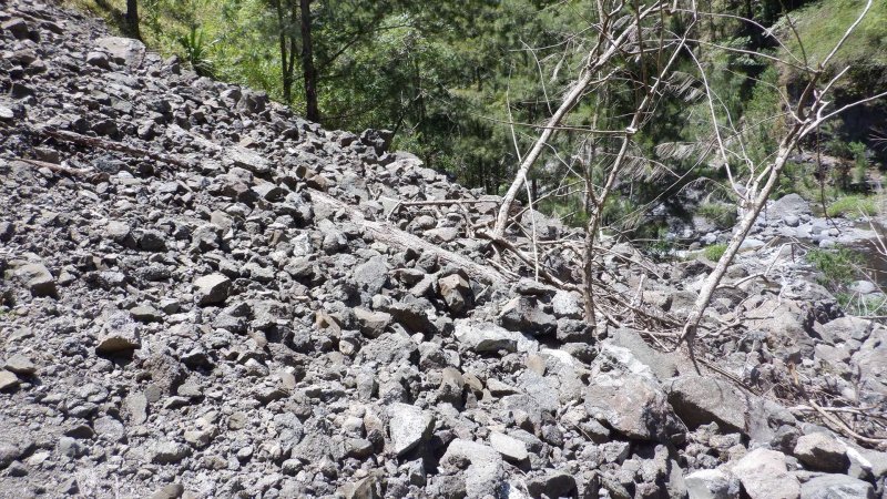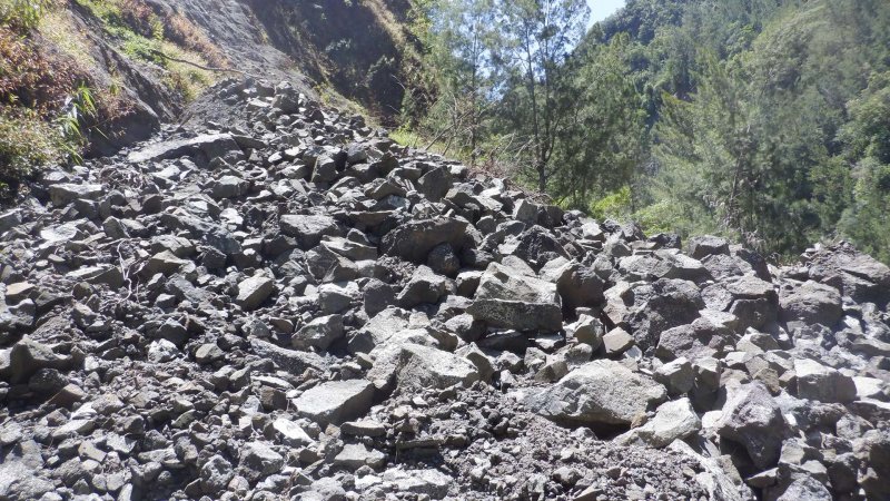 Photos jointes, l’éboulis se situant sous le plateau de l’ilet Bémassoune en rive gauche.