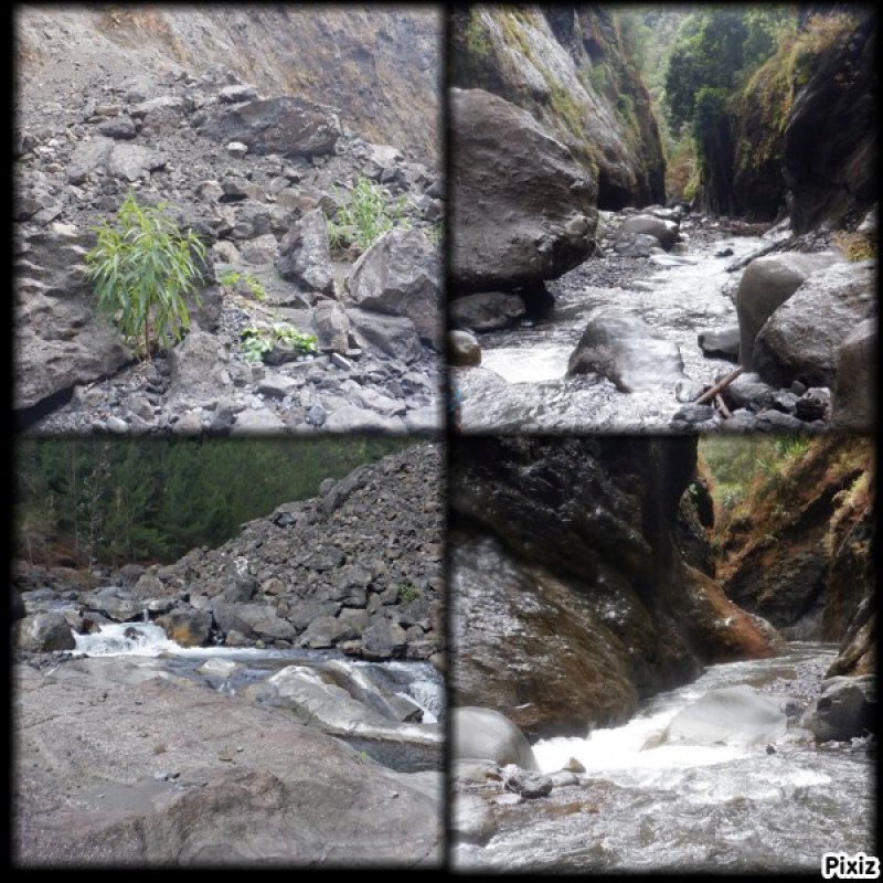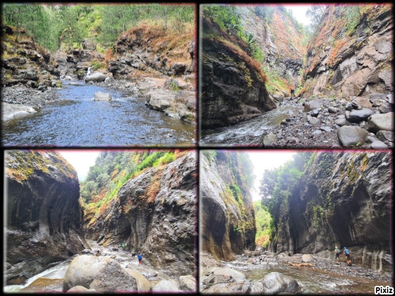 PHOTO 4 : après avoir redescendu l'îlet, nous débutâmes l'exploration de la partie "hors fiche Randopitons", et nous n'avons pas manqué de constater que la Rivière des Fleurs Jaunes changeait d'aspect : de dégagé, le relief devenait plus resseré, des gorges apparaissaient de plus en plus (voir l'évolution sur la photo dans le sens normal de lecture). Le cadre devenait plus impressionnant.....