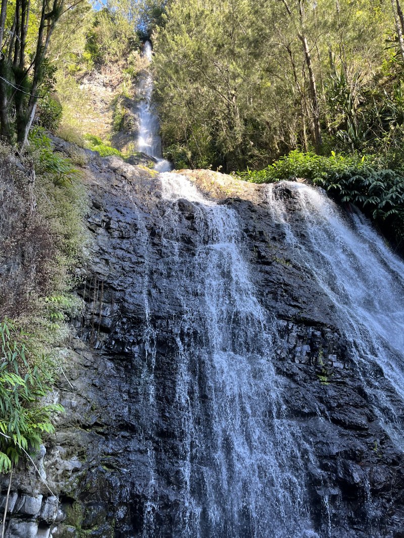 Le descriptif de la fiche est parfait: il faut suivre ses envies dans le fond de rivière car le cours d’eau change certainement la configuration à chaque crue. Le cheminement jusqu’à la remontée jusqu’à l’îlet Be Massoune n’est pas difficile, et on prend plaisir à visiter les cascades, passerelle et autres curiosités. Il faut chercher le départ vers l’îlet, puis rester vigilant dans la montée : d’abord c’est très raide, la trace du sentier est discrète (et parfois cachée par la végétation), et on marche au bord du rempart. Mais en y allant doucement, en regardant où l’on met les pieds et en s’aidant des arbres, on arrive sur le plateau. Il faut imaginer que l’on ait trouvé ce coin, que l’on ait défriché de quoi subvenir à ses besoins. Chapeau! Aujourd’hui, on ne retrouve que quelques plantes cultivées, mais point de vestiges des cases.