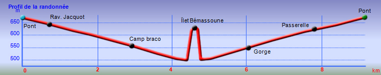 La randonnée aquatique débute au pont enjambant la Rivière des Fleurs Jaunes entre la Mare à Vieille Place et Grand Îlet. Rejoindre la rive en suivant le petit sentier en amont du pont. La partie amont de la rivière est beaucoup plus facile à remonter que celle qu'on emprunte car les plaques de basalte y sont plus nombreuses (Photo 1). Passer sous le pont et entamer ces 4000 mètres le long de la rivière. Comme toujours, pas de description sur la manière d'y parvenir car chacun se fraye un chemin en fonction de ses préférences ou de ses habitudes. Il faudra de toute façon marcher dans l'eau, arpenter les rives de galets, de plaques basaltiques ou escalader pour contourner des canyons si l'on veut éviter de nager. Après 100 mètres, ne pas manquer la partie plate en rive gauche pour couper un long méandre. Après un bon quart d'heure de marche, on arrive à la Ravine à Jacquot. Peut-être est-ce la grosse roche située à la fin du torrent qui se nomme ainsi (Photo 2) ? Plus bas, la vallée, encore large jusque là, va en se rétrécissant et les premières hautes falaises apparaissent (Photo 3). On ne les quittera plus jusqu'au pied du Bémassoune. La rivière des Fleurs Jaunes est un torrent pérenne et fougueux qui nécessite parfois un peu d'attention pour le traverser (Photo 4). Heureusement, des plaques de basalte permettent de marcher plus rapidement par endroits sans risque de trébucher sur les gros galets (Photo 5). On passe bientôt sous la passerelle au pied de la Pente Carozin. A tout moment, de fines cascades, des pisse-en-l'air ou des sources coulent des falaises bordant la rivière (Photo 6). La descente comporte très peu de pièges même sans être habitué à ces randonnées aquatiques. Après une heure de marche, on rencontre une petite touffe de bananiers et un camp braco permanent situé au tout début du sentier acrobatique remontant à Bé Cabot (Photo 7). Très vite, on se retrouve près d'un canyon où le seul moyen de passer serait de nager sur quelques mètres. Repérer donc le grand talus en rive gauche. Il débute par de grosses roches qu'il faut escalader avant de franchir un petit col entre les chosas (Photo 8). De ce petit col, on a une belle vue sur l'aval de la rivière qui coule sur de larges plaques basaltiques (Photo 9). Une fois au pied du talus, on peut étudier plus facilement le canyon et les bassins barrant le passage (Photo 10). Poursuivre vers l'aval le long de la rivière toujours aussi fougueuse (Photo 11). La suite de la descente s'effectue le long de magnifiques petits canyons étroits mais surmontés de larges plaques permettant de les éviter (Photo 12). On domine toujours la rivière de quelques mètres où le seul danger provient des roches pouvant être glissantes (Photo 13 et 14). Le plus bel endroit de la journée, le confluent de la Ravine Bécabot et de la rivière Fleurs Jaunes, s'admire également du haut des rives (Photo 15). Trente mètres après, entreprendre la descente vers le lit de la rivière pour éviter d'escalader la falaise qui se présente. Plusieurs passages permettent d'y parvenir en se maintenant aux filaos. On se retrouve entre passages dans l'eau et marche sur galets comme au départ. Plus loin, c'est la Ravine Sèche qui termine sa course dans la rivière par quelques petites chutes (Photo 16). De jolies cascades en amont peuvent s'atteindre mais il vaut mieux les garder pour le retour. Quelques passages un peu techniques imposent de courtes acrobaties avant d'arriver à un gros rocher barrant le passage. La falaise en rive droite, le rocher en rive gauche et la forte pente qui l'entourent donnent l'impression qu'on ne passera pas. Trouver le boyau si étroit qu'il faut d'abord passer le sac à dos avant de se faufiler entre les roches (Photo 17). Ce passage pourrait paraître ludique pour certains randonneurs beaucoup moins pour d'autres ! Une fois l'écueil passé, la descente se poursuit, la vallée s'élargit et les canyons disparaissent pour un temps (Photo 18). La rivière est même plus calme et peu profonde (Photo 19). A l'approche du grand méandre qu'on repère sur la carte, on sait que l'Îlet Bémassoune est situé 150 mètres au-dessus de nos têtes mais de rapides coups d'œil ont vite fait d'éliminer les possibilités d'y monter (Photo 20). Lors d'un cheminement en rive droite, on retrouve des traces de camps bracos, proches du sentier qui remonte à l'îlet du Butor près de la Mare à Vieille Place. Ce sentier, encore bien visible se termine hélas en propriété privée après 400 mètres de montée abrupte et très sportive. Ne pas le tenter. Depuis le départ, on peut observer un peu partout des coulées calcaires chaque fois qu'une source dégouline des falaises (Photo 21). Repérer, en rive gauche, le talus surmontant une plaque basaltique (Photo 22). Difficile d'imaginer que le départ du sentier pour l'îlet Bémassoune se trouve ici ! Escalader ce talus et dénicher, à travers les chocas et filaos, la trace qui débute presque à plat sur une dizaine de mètres. Très vite, c'est penché vers l'avant et les mains au sol ou autour des goyaviers que commence la rude ascension (Photo 23). Revoir le profil ci-dessous avant de se lancer dans cette ascension. La pente est tout d'abord rectiligne et quasi verticale au milieu des jouvences et goyaviers. On peut perdre ce sentier à mi-parcours lorsqu'il oblique à gauche pour traverser une zone couverte de jouvences mais on le retrouve de l'autre côté de ce qui doit être une ravine en cas de fortes averses. Plus haut, le sentier monte un peu moins fort à travers les fougères un peu dénudées par les rares visiteurs du site (Photo 24). Même lorsque les goyaviers sont serrés et que les fougères ou chocas encombrent le passage, celui-ci reste toujours visible malgré les décennies d'inutilisation (Photo 25). Après 130 mètres de montée sportive, on parvient au plateau où il est possible de marcher entre les goyaviers
