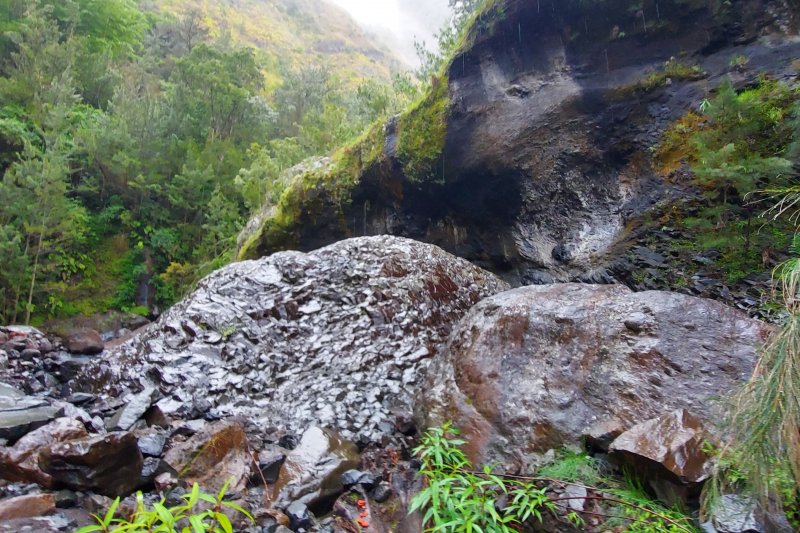 La randonnée débute au premier parking rencontré avant le point de vue sur la vallée de la Rivière des Fleurs Jaunes. Commencer la boucle par le Chemin Bègue puis marcher en direction du dernier lotissement construit. Remonter la rue principale en visant au loin la grosse touffe de bambous. On a devant soi le Piton Gabou sur la gauche et le Piton Maillot qui, d'ici, semble assez haut. La route se transforme en piste. Délaisser celle qui se poursuit tout droit et emprunter celle de droite. On rencontre très vite le sentier caillouteux du Piton Maillot qui débute sous les futaies (Photo 1). Les cailloux sont assez nombreux au départ mais sont vite remplacés par les racines et la terre (Photo 2). La pente est régulière hormis quelques hautes marches. Il faut une bonne dizaine de minutes pour arriver à la clairière où trônait une table qui a disparu au croisement du sentier menant au sommet. Pour découvrir le point de vue aménagé pour des panoramas cinq étoiles sur le cirque partir sur le sentier de gauche, sinon prendre à droite le sentier qui annonce la couleur en quelques mètres (Photo 3). La descente est immédiate et ne cessera jamais jusqu'à la rivière (Photo 4). On retrouve, parmi les cailloux, quelques marches en bois. Le sentier passe le plus souvent entre un fossé moussu et des goyaviers poussant si serrés qu'ils créent des tunnels sombres. Des marches sont creusées à même le sol pour ralentir la descente parfois pentue (Photo 5). Tout au long de la descente, le Piton d'Anchain affiche les parois verticales de sa face est (Photo 6). Le sentier, toujours aussi caillouteux, traverse plus bas une forêt comportant une multitude de bois de rempart. On bénéficie de beaux points de vue sur la vallée du côté de Hell Bourg et Mare à Poule d'Eau. Plus bas, le sentier s'approche d'un étroit canyon par une forte descente sur marches en bois (Photo 7). Cet affluent de la Ravine du Piton d'Anchain coule peu mais traverse une étroite vallée moussue du plus bel effet (Photo 8). On arrive très vite à deux grands filaos marquant l'emplacement de plusieurs zones anciennement cultivées où subsistent bananiers, murets, bambous et même un gigantesque pied de Monstera délicieux. Sur la droite, on voit ou on entend la Rivière du Mât mais la falaise est trop haute pour rejoindre le cours d'eau. Poursuivre en longeant la rivière sur un sentier presque plat très agréable (Photo 9). Il effectue quelques dents de scie pour éviter les obstacles souvent constitués de pierriers (Photo 10). On rencontre deux fois un sentier repartant sur la gauche en direction de la Mare à Vieille Place. Les cabanes en bambou ont également disparu et seuls les barbecues demeurent ainsi que les systèmes originaux d'adduction d'eau faits de bambous. On parvient bientôt au plus près de la rivière proche d'une aire de plus en plus abandonnée avec son WC esseulé au milieu de la clairière. Emprunter le petit sentier et entamer les deux heures de remontée de la Rivière du Mât en cherchant déjà les meilleurs passages (Photo 11). Une grande partie s'effectue sur les berges entre galets, cailloux ou rochers. Les traversées les pieds dans l'eau sont inévitables mais jamais dangereuses (Photo 12). La vallée est le plus souvent étroite avec des falaises friables qui peuvent occasionner quelques chutes de cailloux (Photo 13). Les obstacles sont rares et se franchissent aisément (Photo 14). Les canyons sont courts, assez larges et ne comportent ni bassin d'eau profonde ni cascade (Photo 15). Les géologues s'amuseront à répertorier les catégories de pierres rencontrées allant du quartz blanc aux pierres rouges-orangées, vertes ou noires (Photo 16). Certains blocs énormes tombés des falaises encombrent le fond de la rivière, créant des obstacles se franchissant assez aisément par de courtes escalades (Photo 17). La remontée est plus ludique que sportive même si la jonction est un peu longue. Aux deux tiers du parcours, on arrive à une vaste zone d'éboulis (Photo 19). De véritables "moraines" descendant des falaises peuvent impressionner mais se franchissent aisément en restant au plus près de l'eau (Photo 20). Des pics acérés dominent ces amoncellements de pierres mais ne résisteront pas des millénaires à l'érosion. Plus on monte et plus la pente crée de petites cascades qui se passent aisément (Photo 21). On se retrouve au gué et à la piste grimpant à la Mare d'Affouches. Il est possible de l'emprunter pour monter en direction du Piton d'Anchain par le GRR2. La passerelle n'est qu'à une centaine de mètres qui se franchissent comme les deux kilomètres précédents. On parvient sous l'édifice métallique qui surplombe une magnifique vallée encaissée dans le basalte (Photo 22). Marcher jusqu'à la passerelle en passant sur les roches en rive gauche. Le grand bassin peut servir de piscine avant de poursuivre. Repérer le sentier qui remonte à la passerelle et finit à de grands kiosques. Récupérer la piste et remonter jusqu'au sentier du Piton d'Anchain débutant dans un champ de chouchous et des vergers. La montée de ce sentier fréquenté est assez raide par endroits (Photo 23). Il franchit quelques ravines, passe sous de grands bambous et longe à la fin des champs tombant lentement à l'abandon. Laisser le sentier partant à droite et continuer par une agréable piste (Photo 24). Très fréquentée des agriculteurs de la zone, le passage est propre et en pente douce (Photo 25). Ne pas manquer, dans la descente, le sentier partant sur la droite. Il évite par quelques lacets la piste qui est beaucoup plus longue. C'est le circuit n° 3 du Trail Salazie, toujours bien entretenu (Photo 26). Après de fortes descentes, il s'approche de la Ravine Camp d'Henri bordée d'hectares de chouchous poussant jusqu'en haut des arbres (Photo 27). Le gué franchi, le sentier rencontre la piste presque plate finissant à l'aire de repos du pont de la Riv