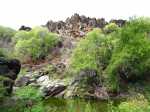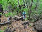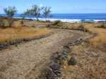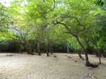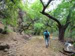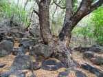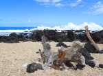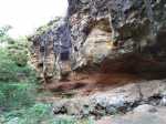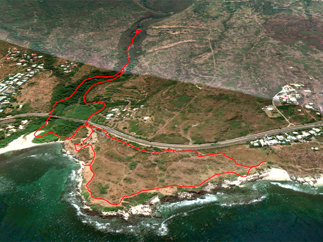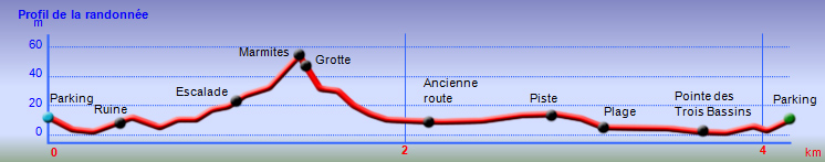 La randonnée débute au grand parking de la Ravine des Trois Bassins, très connue des surfeurs de l'île qui viennent braver la grande vague. On voit d'ailleurs très bien ces vagues successives et les surfeurs tentant d'y tenir debout (Photo 1). A partir du parking, descendre vers la mer par l'agréable sentier bordé d'aloe vera parfois en fleurs où viennent les oiseaux pour y chercher du nectar (Photo 2). Descendre à la plage et repérer pour le pique-nique du retour l'endroit ombragé à l'arrière (Photo 3). Traverser ensuite l'estuaire ensablé retenant une quantité d'eau plus ou moins franchissable en fonction de la saison. Rejoindre la rive droite puis emprunter le petit sentier qui longe la ruine de l'ancien pont (Photo 4). S'il y a trop d'eau, partir depuis le parking vers le pont. Passer sous le nouveau pont et grimper sur l'ancienne route. Partir sur la gauche vers l'ancien oratoire et une grotte remplie de tout un curieux capharnaüm. Suivre les traces sous les arbres parmi les roches pour remonter la rivière en rive droite (Photo 5). Pour varier les paysages, il est conseillé de marcher d'un côté à l'aller et de l'autre au retour. Des racines hors sol montrent la puissance de l'eau lors des rares crues de la ravine (Photo 6). Repérer les spots d'escalade pour donner la vocation de la grimpe aux enfants mais ne pas tenter d'escalader sans matériel. On s'approche de plus en plus de l'eau car la vallée se rétrécit. Les falaises qui la bordent sont parfois hautes, verticales et découpées (Photo 7). La véritable montée débute à un bassin qui peut contenir beaucoup d'eau. Des traces de peinture guident les marcheurs peu habitués à passer ce gente d'obstacle (Photo 8). Une fois le bassin évité, la remontée de roche en roche est presque ludique (Photo 9). Toujours chercher des yeux le meilleur passage avant de s'y aventurer. Les autres passages techniques ne dépasseront plus le mètre de hauteur. 30 minutes après le pont on parvient à un cassé reconnaissable à sa haute falaise impossible à escalader à mains nues (Photo 10). Les trois marmites sont très faciles à repérer au pied de la falaise en rive droite (Photo 11). Le jeu consiste à descendre dans les marmites. Pour cela, repérer les marches naturelles de l'une d'entre elles (Photo 12). Cette dernière correspond avec la deuxième par un petit tunnel (Photo 13). La troisième, en revanche, demande un court rampé un peu salissant pour y arriver en passant d'un puits à l'autre (Photo 14). Durant la courte jonction depuis la mer, on a de nombreuses occasions d'étudier et de comprendre la formation de ces cavités circulaires (Photo 15). Prendre tout son temps pour apprécier ce lieu original. En revanche, il est de bon ton de ne laisser aucun détritus autour de cette curiosité géologique. Avant de descendre vers la mer, partir vers la falaise en rive gauche puis se rapprocher de la grotte située au pied. On est tout d'abord frappé par la forte odeur ammoniaquée provenant de la grande cavité. En y regardant de plus près, on voit un impressionnant tas d'excréments de chauve-souris qui donne une idée du nombre d'individus pouvant y vivre (Photo 16). Par respect pour ces petites bêtes et dans l'ignorance des dangers que représentent ces excréments si on les touche, le mieux est d'apprécier la grotte de loin puis de poursuivre vers l'aval. Reprendre la descente, beaucoup plus facile sur la pente moyenne de la ravine (Photo 17). Marcher et sauter jusqu'au bassin et partir vers la gauche pour explorer une autre rive de la ravine. On y retrouve les mêmes arbres, les mêmes tamarins et des traces de passage de troupeaux de bœufs (Photo 18). La fin s'effectue en longeant de hautes barres rocheuses connues des alpinistes (Photo 19). Partir à gauche à nouveau sur l'ancienne route qui amène rapidement à la RN1a. Revenir au parking puis entamer une marche reposante dans les environs de la Pointe des Trois Bassins. Emprunter la route puis la piste qui la prolonge en direction de l'océan (Photo 21). On peut gagner Saint-Leu sans difficulté mais une première halte est possible à la petite plage située en fin de piste (Photo 22). D'autres étendues de sable se situent un peu partout dans les roches (Photo 23). Attention cependant de ne pas déranger d'éventuels naturistes préférant ce genre de mini-plages isolées. Prendre donc le sentier de bord qui n'a besoin d'aucune balise (Photo 24). On peut aussi quitter le sentier pour se rapprocher de petits bassins aux eaux calmes (Photo 26). Prendre le temps de s'asseoir sur une roche de la falaise pour regarder évoluer les surfeurs. Le parking se rejoint sur le même type de sentier offrant de beaux points de vue en direction de l'amont de la Ravine des Trois Bassins (Photo 28).