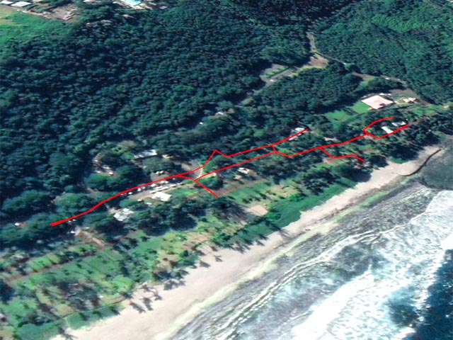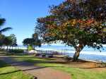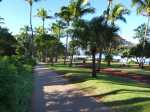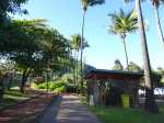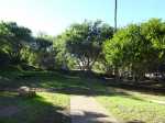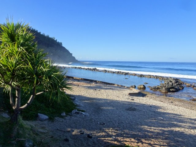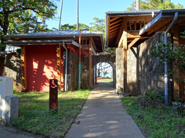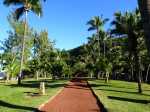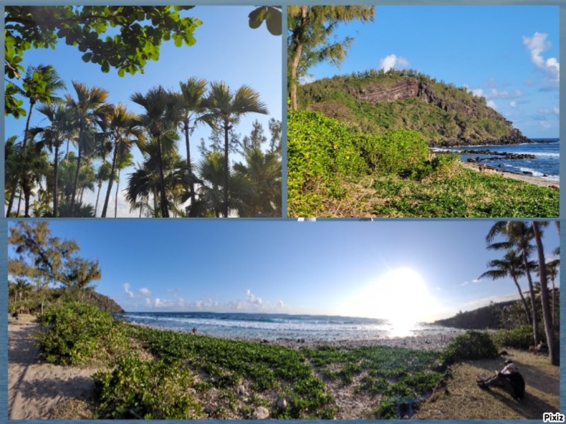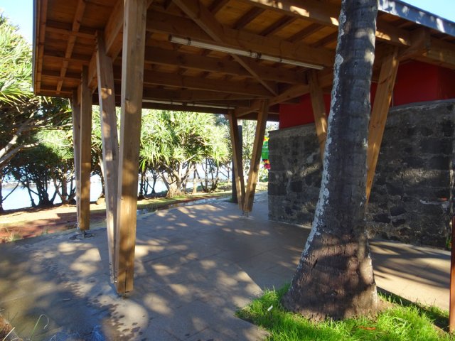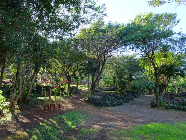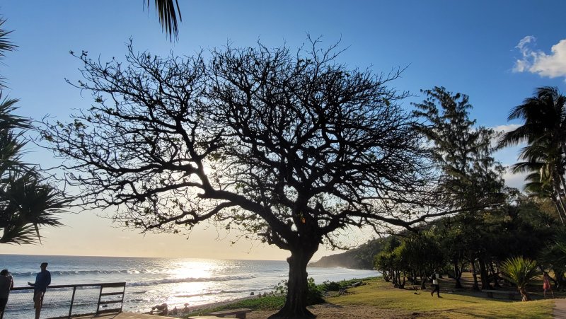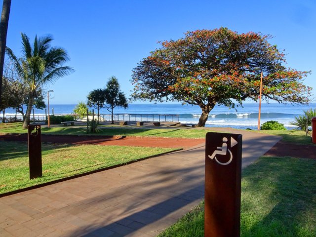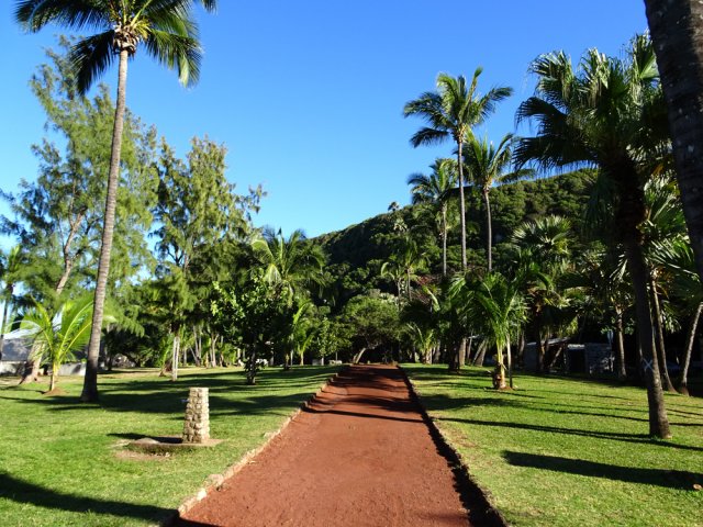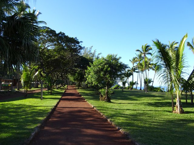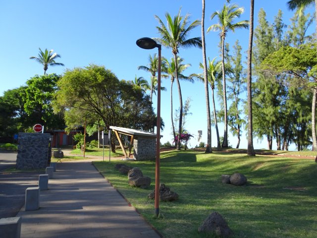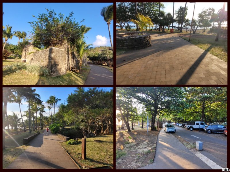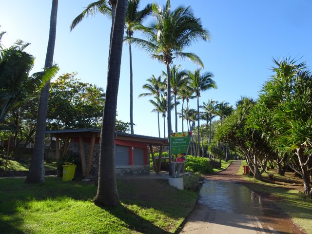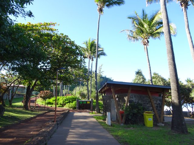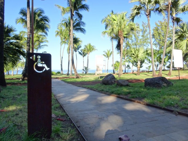 La sortie débute aux parkings situés au plus près du parc arboré (Photo 1). Un trottoir carrelé est accolé aux parkings. On est au plus près des zones de repos où une immense pelouse est plantée principalement de cocotiers, de filaos et de badamiers (Photo 2). Longer ces plantations et obliquer au premier croisement vers la droite pour pénétrer un peu dans la zone ombragée (Photo 3). On a coupé deux pistes de terre rouge parcourues par les nombreux sportifs. L'une part vers la colline qui borde la zone (Photo 4), l'autre vers le Piton de Grande Anse (Photo 5). Faire demi-tour et poursuivre en passant devant les toilettes dont certaines sont réservées aux handicapés (Photo 6). Dépasser ensuite les parkings pour vraiment entrer dans l'aire littorale en passant devant un auvent destiné à recevoir des panneaux (Photo 7). La piste contourne un bâtiment puis ondule à angles droits sous les arbres (Photo 8). On arrive enfin le long des parcours pédestres par une très légère descente (Photo 9). Repérer la prochaine piste se dirigeant vers la plage et avancer en direction d'un beau badamier (Photo 10). Une esplanade de repos permet aux sportifs de se détendre sur des bancs en pierre, aux baigneurs de se doucher ou aux promeneurs de regarder la mer en s'appuyant aux rambardes (Photo 11). On est alors au plus près des vagues. Sur la droite, la plage interdite à la baignade est constamment battue par les vagues (Photo 12). De l'autre côté, c'est un vaste bassin de baignade mais très peu profond qui attire surtout les familles avec enfants (Photo 13). La natation en ce lieu laisse en général de désagréables souvenirs aux genoux qui cognent les coraux ou les roches du fond ! C'est la halte la plus agréable de la boucle et il ne faut pas hésiter à rester sous le badamier le plus longtemps possible. La piste se poursuit en direction du Piton qu'on aperçoit dans le fond. L'allée se termine à un bar à jus de fruits mais la piste en terre est trop défoncée pour pouvoir poursuivre (Photo 14). Revenir en arrière et poursuivre en contournant le four à chaux en ruine laissé aux affouches qui finiront de le détruire complètement (Photo 15). Tout comme de l'autre côté, l'allée se termine également au bar à jus de fruits (Photo 16). Tout près, un préau accessible aux fauteuils permet de se reposer à l'ombre (Photo 17). D'autres pistes de course pénètrent sur la droite en direction de nouvelles zones ombragées mais le chemin de terre et l'escalier un peu plus loin en interdisent l'accès aux fauteuils (Photo 19). Reprendre le chemin inverse en profitant des nombreux cocotiers et des oiseaux qui sont toujours sur les pelouses (Photo 20). Si l'on repart à droite au prochain croisement on atteint de nouvelles toilettes (Photo 21). Et bien sûr, cette nouvelle allée se termine comme les autres au milieu de nulle part (Photo 22). La fin du parcours emprunte des tronçons déjà utilisés en direction des parkings en repassant devant des spots du parcours sportif (Photo 24). Cette courte sortie au goût d'inachevé est tout de même agréable à bien des égards en raison du paysage magnifique et de la mer toute proche. A noter qu'aucun emplacement de pique-nique pour personnes à mobilité réduite n'a été repéré pour un agréable cari en fin de sortie.